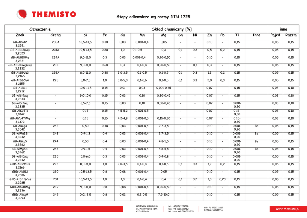 Stopy odlewnicze wg normy DIN 1725 Oznaczenie Skład chemiczny [%] inne Znak Cecha Si Fe Cu Mn Mg Sn Ni Zn Pb Ti GB-AlSi12 3,2521 GB-AlSi12(Cu) 3,2523 GB-AlSi10Mg 3,2331 GB-AlSi10Mg(Cu) 3,2332 GB-AlSi9Cu3 3,2165 GB-AlSi6Cu4 3,2155 GB-AlSi11 3,2212 GB-AlSi9Mg 3,2333 GB-AlSi7Mg 3,2335 GB-AlCu4Ti 3,1842 GB-AlCu4TiMg 3,1372 GB-AlMg3 3,3542 GB-AlMg3Si 3,3242 GB-AlMg5 3,3562 GB-AlMg5Si 3,3262 GB-AlSi5Mg 3,2342 GBD-AlSi9Cu3 3,2166 GBD-AlSi12 3,2586 GBD-AlSi12(Cu) 3,2985 GBD-AlSi10Mg 3,2336 GBD-AlMg9 3,3293 230A 10,5-13,5 0,30 0,03 0,001-0,4 0,05 - - 0,10 - 231A 10,5-13,5 0,80 1,0 Pojed Razem 0,15 0,05 0,15 0,3 0,1 0,2 0,5 0,2 0,15 0,05 0,15 239A 9,0-11,0 0,3 0,03 0,20-0,50 - - 0,10 - 0,15 0,05 0,15 233 9,0-11,0 0,60 0,3 0,1-0,4 0,20-0,50 - 0,1 0,3 - 0,15 0,05 0,15 226A 8,0-11,0 0,80 2,0-3,5 0,1-0,5 0,1-0,5 0,1 0,3 1,2 0,2 0,15 0,05 0,15 225 5,0-7,5 1,0 3,0-5,0 0,1-0,6 0,1-0,5 0,1 0,3 2,0 0,3 0,15 0,05 0,15 - 10,0-11,8 0,15 0,01 0,03 0,001-0,45 - - 0,07 - 0,15 0,03 0,10 - 9,0-10,0 0,15 0,03 0,10 0,30-0,45 - - 0,07 - 0,15 0,03 0,10 - 6,5-7,5 0,15 0,03 0,10 0,30-0,45 - - 0,07 - 0,03 0,10 0,15 0,15 4,5-5,2 0,001-0,5 - - - 0,07 - 0,03 0,10 - 0,15 0,15 4,2-4,9 0,001-0,5 0,15-0,30 - - 0,07 - 0,03 0,10 242 0,50 0,40 0,03 0,001-0,4 2,7-3,5 - - 0,10 - Be 0,05 0,15 243 0,9-1,3 0,4 0,03 0,001-0,4 2,7-3,5 - - 0,10 - Be 0,05 0,15 244 0,50 0,4 0,03 0,001-0,4 4,8-5,5 - - 0,10 - Be 0,05 0,15 245 0,9-1,5 0,4 0,03 0,001-0,4 4,8-5,5 - - 0,10 - Be 0,05 0,15 235 5,0-6,0 0,3 0,03 0,001-0,4 0,4-0,8 - - 0,10 - 0,05 0,15 226 8,0-11,0 1,0 2,0-3,5 0,1-0,4 0,1-0,5 0,1 0,3 1,2 0,2 0,0010,20 0,150,30 0,150,30 0,0010,20 0,0010,20 0,0010,20 0,0010,20 0,0010,20 0,15 - 0,05 0,15 230 10,5-13,5 0,8 0,08 0,001-0,4 0,05 - - 0,10 - 0,15 0,05 0,15 231 10,5-13,5 1,0 1,0 0,1-0,4 0,4 0,1 0,2 1,0 0,20 0,15 0,05 0,15 239 9,0-11,0 0,8 0,08 0,001-0,4 0,20-0,50 - - 0,10 - 0,15 0,05 0,15 349 0,01-2,5 0,8 0,03 0,2-0,5 7,5-10,0 - - 0,10 - 0,15 0,05 0,15 0,1-0,5 0,001-0,4 ODLEWNIA ALUMINIUM ul. Przemysłowa 124A 62-510 Konin tel. +48(63) 2204820 fax. +48 (63) 2204821 tel. kom. +48 500 599 955 NIP: PL 9730722667 REGON: 300498396 Inne www.themisto.pl