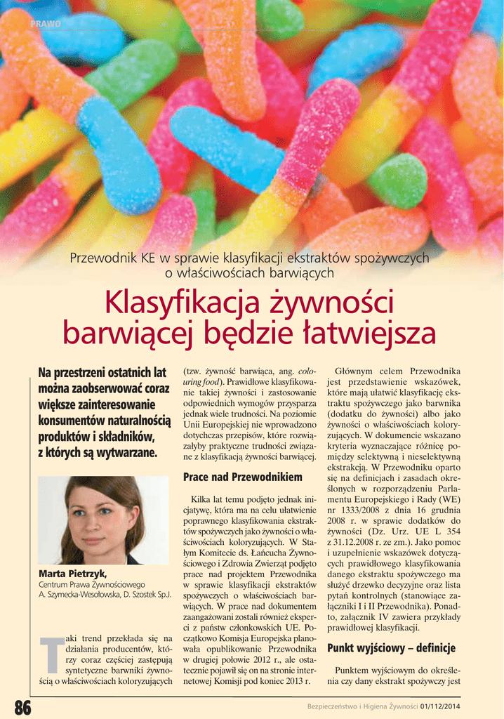 PRAWO Przewodnik KE w sprawie klasyfikacji ekstraktów spożywczych o właściwościach barwiących Klasyfikacja żywności barwiącej będzie łatwiejsza Na przestrzeni ostatnich lat można zaobserwować coraz większe zainteresowanie konsumentów naturalnością produktów i składników, z których są wytwarzane. (tzw. żywność barwiąca, ang. colouring food). Prawidłowe klasyfikowanie takiej żywności i zastosowanie odpowiednich wymogów przysparza jednak wiele trudności. Na poziomie Unii Europejskiej nie wprowadzono dotychczas przepisów, które rozwiązałyby praktyczne trudności związane z klasyfikacją żywności barwiącej. Prace nad Przewodnikiem Marta Pietrzyk, Centrum Prawa Żywnościowego A. Szymecka-Wesołowska, D. Szostek Sp.J. T aki trend przekłada się na działania producentów, którzy coraz częściej zastępują syntetyczne barwniki żywnością o właściwościach koloryzujących 86 Kilka lat temu podjęto jednak inicjatywę, która ma na celu ułatwienie poprawnego klasyfikowania ekstraktów spożywczych jako żywności o właściwościach koloryzujących. W Stałym Komitecie ds. Łańcucha Żywnościowego i Zdrowia Zwierząt podjęto prace nad projektem Przewodnika w sprawie klasyfikacji ekstraktów spożywczych o właściwościach barwiących. W prace nad dokumentem zaangażowani zostali również eksperci z państw członkowskich UE. Początkowo Komisja Europejska planowała opublikowanie Przewodnika w drugiej połowie 2012 r., ale ostatecznie pojawił się on na stronie internetowej Komisji pod koniec 2013 r. Głównym celem Przewodnika jest przedstawienie wskazówek, które mają ułatwić klasyfikację ekstraktu spożywczego jako barwnika (dodatku do żywności) albo jako żywności o właściwościach koloryzujących. W dokumencie wskazano kryteria wyznaczające różnicę pomiędzy selektywną i nieselektywną ekstrakcją. W Przewodniku oparto się na definicjach i zasadach określonych w rozporządzeniu Parlamentu Europejskiego i Rady (WE) nr 1333/2008 z dnia 16 grudnia 2008 r. w sprawie dodatków do żywności (Dz. Urz. UE L 354 z 31.12.2008 r. ze zm.). Jako pomoc i uzupełnienie wskazówek dotyczących prawidłowego klasyfikowania danego ekstraktu spożywczego ma służyć drzewko decyzyjne oraz lista pytań kontrolnych (stanowiące załączniki I i II Przewodnika). Ponadto, załącznik IV zawiera przykłady prawidłowej klasyfikacji. Punkt wyjściowy – definicje Punktem wyjściowym do określenia czy dany ekstrakt spożywczy jest Bezpieczeństwo i Higiena Żywności 01/112/2014 PRAWO barwnikiem czy żywnością barwiącą jest definicja „dodatku do żywności”, a konkretnie wyłączenie spod tej definicji (zawarte w art. 3 ust. 2 lit. a (ii) rozporządzenia nr 1333/2008), które stanowi, że za dodatki do żywności nie uważa się środków spożywczych, zarówno suszonych, jak i w formie skoncentrowanej, w tym środków aromatyzujących dodanych w trakcie produkcji wieloskładnikowych środków spożywczych, ze względu na ich właściwości aromatyczne, smakowe lub odżywcze wraz z wtórnym efektem barwiącym. Kluczowe znaczenie ma także definicja „barwnika” (określona w załączniku I do ww. rozporządzenia) wskazująca, że „barwnikiem” są substancje nadające lub przywracające żywności barwę, obejmujące naturalne składniki żywności i naturalne źródła, które w normalnych warunkach ani nie są same spożywane jako żywność, ani nie są stosowane jako typowe składniki żywności (…) barwnikami są preparaty uzyskane ze środków spożywczych i innych jadalnych surowców naturalnych uzyskanych poprzez fizyczną lub chemiczną ekstrakcję, której efektem jest selektywna ekstrakcja pigmentów względem składników odżywczych lub aromatycznych. W świetle powyższych definicji produkt spożywany jako żywność lub używany jako charakterystyczny składnik żywności nie powinien być uznawany za dodatek do żywności. Produkty normalnie spożywane w Unii Europejskiej jako żywność m.in. soki owocowe (przykładowo sok wiśniowy dodany do jogurtu), koncentraty pomidorowe, kawa, często posiadają właściwości barwiące. Takie produkty w świetle Przewodnika powinny być uznane za składnik żywności i jako taki powinny być oznakowane, nawet jeżeli produkty te zostały dodane do żywności złożonej jedynie w celach barwiących. Natomiast produkty uzyskiwane poprzez procesy inne niż suszenie lub koncentracja w celu wykorzystania ich właściwości barwiących do produkcji żywności złożonej, nie powinny być automatycznie klasyfikowane jako żywność barwiąca (o ile nie są one normalnie spożywane jako takie – np. czerwony olej palmowy). Zgodnie z Przewodnikiem jeżeli taki produkt spożywany jako żywność albo będący składnikiem żywności zachowuje swoje podstawowe właściwości, nie powinien być on uznany za barwnik, zarówno gdy produkt jest używany w stanie surowym, jak i w formie przetworzonej (uzyskanej w wyniku koncentracji, suszenia, gotowania czy mielenia). Przykładowo szpinak używany do produkcji makaronu jako taki, w formie suszonej albo w postaci skoncentrowanego soku, bez selektywnej ekstrakcji pigmentów, w świetle Przewodnika należy uznać za składnik żywności, a nie barwnik. Z drugiej strony, jeżeli pigmenty są „ekstraktowane selektywnie” ze szpinaku i dodawane do makaronu w celu uzyskania koloru, powinny być one uznane za dodatek do żywności (np. barwnik chlorofile i chlorofiliny E 140). Ekstrakcja selektywna W świetle Przewodnika w przypadku gdy produkt jest uzyskiwany z żywności w celach barwiących, kluczowe do klasyfikacji produktu jako barwnik jest to, czy produkt został uzyskany w drodze „selektywnej produkt kluczowe jest zidentyfikowanie kiedy produkt nie jest już dłużej „żywnością ani nie jest spożywany jako typowy składnik żywności”, ale staje się barwnikiem, który podlega zatwierdzeniu. Drzewko decyzyjne, czyli jak prawid