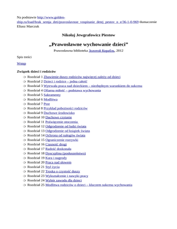 Na podstawie http://www.goldenship.ru/load/brak_semja_deti/pravoslavnoe_vospitanie_detej_pestov_n_e/36-1-0-969 tłumaczenie Eliasz Marczuk Nikołaj Jewgrafowicz Piestow „Prawosławne wychowanie dzieci” Prawosławna biblioteka Золотой Корабль, 2012 Spis treści Wstęp Związek dzieci i rodziców Rozdział 1 Zbawienie duszy rodziców najwięcej zależy od dzieci Rozdział 2 Dzieci i rodzice – jedna całość Rozdział 3 Wytrwała praca nad dzieckiem – niezbędnym warunkiem do sukcesu Rozdział 4 Ofiarna miłość – podstawa wychowania Rozdział 5 Sakramenty Rozdział 6 Modlitwa Rozdział 7 Post Rozdział 8 Przykład pobożności rodziców Rozdział 9 Duchowe środowisko Rozdział 10 Duchowe czytanie Rozdział 11 Poświęcenie otoczenia Rozdział 12 Odgrodzenie od ludzi świata Rozdział 13 Odgrodzenie od książek świata Rozdział 14 Ochrona od nałogów świata Rozdział 15 Ograniczenie rozrywki Rozdział 16 Ciasność drogi Rozdział 17 Radość doskonała Rozdział 18 Dyscyplina (posłuszeństwo) Rozdział 19 Kara i nagrody Rozdział 20 Praca nad słowem Rozdział 21 Styl życia Rozdział 22 Troska o czystość duszy Rozdział 23 Wykształcenie i nawyki pracy Rozdział 24 Wybór zawodu dla dzieci Rozdział 25 Modlitwa rodziców o dzieci – kluczem sukcesu wychowania WSTĘP «Oto ja i dzieci, które dał mi Bóg» (Hebr. 2, 13). «Oto dzieci są dziedzictwem od Pana, a owoc łona nagrodą od Niego» (Ps. 126, 3). Duchowe życie będących w świecie chrześcijan upływa w trudnych okolicznościach, pełnych pokus, niechrześcijańskich obyczajów, w oddali od nosicieli Ducha Bożego, którzy odseparowali się od świata. Walka trudna jest jeszcze dlatego, że chrześcijanin posiadający rodzinę powinien walczyć duchowo nie tylko za siebie, ale i za całą rodzinę – małżonkę i dzieci. Odnośnie ostatnich on ponosi odpowiedzialność – czy wszystko co możliwe uczynił po to, aby skierować je na drogę do Królestwa Bożego. Niektórzy mogą myśleć, że we dwoje łatwiej iść po drodze do zbawienia. Tak, ale tylko w tym przypadku, jeśli są jednomyślni. Tylko wtedy uzasadniona jest wypowiedź mądrego Salomona: „Dwóm lepiej, niż jednemu” (Ekl. 4, 9 (Przyp. Salom)). Ale tak bywa nie zawsze, i w życiu dość często można widzieć przypadki, o których mówi Pan: „Wrogowie człowieka – domownicy jego” (Mat 10, 36). Jest jeszcze jedna cecha życia świeckiego, która chrześcijaninowi czyni je trudniejszym, niż życie w monasterze. O ostatniej opowiada bogata literatura świętych Ojców, która wyczerpująco opisuje drogę mnichów. Doświadczenie duchowe świeckich, w literaturze odzwierciedlone jest znacznie ubożej. Oczywiście, Pismo Święte i, przede wszystkim Ewangelia, zawiera całą pełnię prawdy, niezbędnej dla zbawienia świeckich. Ale Ewangeliczne prawdy i prawidłowe zastosowanie ich w praktyce naszego życia odkrywane są naszym duchowym oczom poprzez tradycję i objaśnienie ich przez św. Ojców. Niestety, zastosowanie Ewangelicznych prawd do rozwiązywania problemów o duchowym wychowaniu dzieci w duchowej literaturze wyjaśnione jest stosunkowo słabo. Jaki powinien być główny cel wychowania dziecka? Niektóre matki, największą uwagę zwracają na to, żeby dzieci były dobrze karmione i wyrosły zdrowe. Inni rodzice starają się przede wszystkim dać dzieciom dobre wykształcenie. Trzeci – dokładają szczególnych starań, żeby rozwijać u dzieci wrodzone talenty i marzą zobaczyć w nich utalentowanych muzyków, artystów czy naukowców. U rodziców-chrześcijan nie to powinno być pierwszym, głównym celem wychowania. Oni przede wszystkim i najbardziej powinni troszczyć się o to, żeby ich dzieci wyrosły w niezachwianej wierze na żywych członków Cerkwi, żeby w duszy ich „ukształtował się Chrystus” (Gal. 4, 19), żeby najbardziej w świecie pokochały one Boga, a „bliźniego swego, jak samego siebie” (Mat. 22, 3740), i za cel swego życia postawiły „zdobywanie Ducha Świętego Bożego” (prep. Sierafim). Jeśli rodzice to osiągną, to wszystko pozostałe – i wykształcenie, i rozwój talentów, i zdrowie – dodane będzie samo sobą, tak jak Pan powiedział: „Szukajcie przede wszystkim Królestwa Bożego i prawdy jego, i to wszystko dodane wam będzie” (Mat. 6, 33). Prep. Sierafim mówił pewnej matce: „Matulu, matulu. Nie śpiesz się uczyć dzieci po francusku i po niemiecku, a przygotuj dusze ich najpierw, a pozostałe dodane im będzie potem”. Jak to osiągnąć, jak „przygotować duszę” dzieci? Do tego celu należy podejść drogą systematycznego doboru materiałów na ten temat, wziętego z tekstu Pisma Świętego, dzieł ojców Cerkwi, żywotów świętych i pobożnych ascetów oraz doświadczenia bogobojnych nauczycieli i świeckich. Przy rozwiązywaniu wszelkich problemów należy, jak mówią mędrcy, szukać idealnego rozwiązania. „Postawcie sobie ideał jak można najwyższy i dążcie do osiągnięcia go” – radzi jeden z filozofów. I choćby taki ideał wydawał się bardzo trudny do osiągnięcia we współczesnych warunkach życia, mimo wszystko należy do niego dążyć, w miarę sił i faktycznych możliwości. W najważniejszej dla rodziców sprawie – sprawie duchowego wychowania dzieci, należy także bać się tej obojętności, która nie podoba się Panu (Obj. 3, 15). I chociaż w tej relacji wskazówki ojców Cerkwi i doświadczenia pobożnych świeckich będą rozmijać się ze współczesnymi poglądami – nie odrzucajmy tych wskazówek i tego doświadczenia. Nie powtarzajmy słów tych, którzy niegdyś mówili, słuchając Chrystusa: „Jakie dziwne słowa! Kto może tego słuchać?” (Jana 6, 60). Przypomnijmy radę wielkiego Apostoła: „Kto z was myśli być mądrym w tym świecie, niech się stanie głupim, aby być mądrym” (Kor. 3, 18). Powrót ZWIĄZEK DZIECI I RODZICÓW Rozdział 1. Zbawienie duszy rodziców najwi