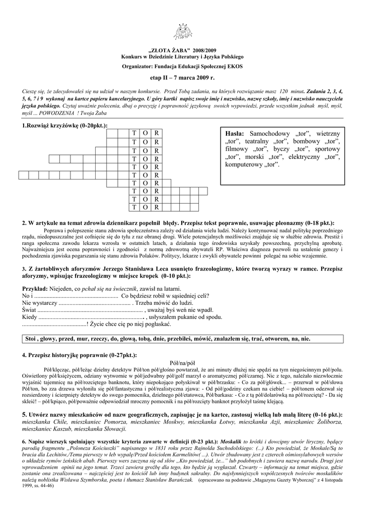 „ZŁOTA ŻABA” 2008/2009 Konkurs w Dziedzinie Literatury i Języka Polskiego Organizator: Fundacja Edukacji Społecznej EKOS etap II – 7 marca 2009 r. Cieszę się, że zdecydowałeś się na udział w naszym konkursie. Przed Tobą zadania, na których rozwiązanie masz 120 minut. Zadania 2, 3, 4, 5, 6, 7 i 9 wykonaj na kartce papieru kancelaryjnego. U góry kartki napisz swoje imię i nazwisko, nazwę szkoły, imię i nazwisko nauczyciela języka polskiego. Czytaj uważnie polecenia, dbaj o precyzję i poprawność językową swoich wypowiedzi, przede wszystkim jednak myśl, myśl, myśl ... POWODZENIA ! Twoja Żaba 1.Rozwiąż krzyżówkę (0-20pkt.): T T T T T T T T T T O O O O O O O O O O Hasła: Samochodowy „tor”, wietrzny „tor”, teatralny „tor”, bombowy „tor”, filmowy „tor”, byczy „tor”, sportowy „tor”, morski „tor”, elektryczny „tor”, komputerowy „tor”. R R R R R R R R R R 2. W artykule na temat zdrowia dziennikarz popełnił błędy. Przepisz tekst poprawnie, usuwając pleonazmy (0-18 pkt.): Poprawa i polepszenie stanu zdrowia społeczeństwa zależy od działania wielu ludzi. Należy kontynuować nadal politykę poprzedniego rządu, niedopuszczalne jest cofnięcie się do tyłu z raz obranej drogi. Wiele potencjalnych możliwości znajduje się w służbie zdrowia. Prestiż i ranga społeczna zawodu lekarza wzrosła w ostatnich latach, a działania tego środowiska uzyskały powszechną, przychylną aprobatę. Najważniejsza jest ocena poprawności i zgodności z normą zdrowotną obywateli RP. Właściwa diagnoza pozwoli na ustalenie genezy i pochodzenia zjawiska pogarszania się stanu zdrowia Polaków. Politycy, lekarze i zwykli obywatele powinni polegać na sobie wzajemnie. 3. Z żartobliwych aforyzmów Jerzego Stanisława Leca usunięto frazeologizmy, które tworzą wyrazy w ramce. Przepisz aforyzmy, wpisując frazeologizmy w miejsce kropek (0-10 pkt.): Przykład: Niejeden, co pchał się na świecznik, zawisł na latarni. No i ....................................................... Co będziesz robił w sąsiedniej celi? Nie wystarczy ............................................... . Trzeba mówić do ludzi. Świat ..................................................................... , uważaj byś weń nie wpadł. Kiedy ..................................................................... , usłyszałem pukanie od spodu. ..........................................! Życie chce cię po niej pogłaskać. Stoi , głowy, przed, mur, rzeczy, do, głową, tobą, dnie, przebiłeś, mówić, znalazłem się, trać, otworem, na, nie. 4. Przepisz historyjkę poprawnie (0-27pkt.): Pół/na/pół Pół/klęcząc, pół/leżąc dzielny detektyw Pół/ton pół/głośno powtarzał, że ani minuty dłużej nie spędzi na tym niegościnnym pół/polu. Oświetlony pół/księżycem, odziany wytwornie w pół/jedwabny pół/golf marzył o aromatycznej pół/czarnej. Nic z tego, należało niezwłocznie wyjaśnić tajemnicę na pół/rozciętego banknotu, który niepokojąco połyskiwał w pół/brzasku: - Co za pół/główek... – przerwał w pół/słowa Pół/ton, bo zza drzewa wyłoniła się pół/fantastyczna i pół/realistyczna zjawa: - Od pół/godziny czekam na ciebie! – pół/tonem odezwał się rozsierdzony i ścierpnięty detektyw do swego pomocnika, dzielnego pół/etatowca, Pół/barkasa: - Co z tą pół/dolarówką na pół/rozciętą? - Da się skleić! – pół/kpiąco, pół/poważnie odpowiedział mroczny pomocnik i na pół/rozcięty banknot przyłożył taśmę klejącą. 5. Utwórz nazwy mieszkańców od nazw geograficznych, zapisując je na kartce, zastosuj wielką lub małą literę (0-16 pkt.): mieszkanka Chile, mieszkaniec Pomorza, mieszkaniec Moskwy, mieszkanka Łotwy, mieszkanka Azji, mieszkaniec Żoliborza, mieszkaniec Kaszub, mieszkanka Słowacji. 6. Napisz wierszyk spełniający wszystkie kryteria zawarte w definicji (0-23 pkt.): Moskalik to krótki i dowcipny utwór liryczny, będący parodią fragmentu „Poloneza Kościuszki” napisanego w 1831 roku przez Rajnolda Suchodolskiego: (...) Kto powiedział, że Moskale/Są to bracia dla Lechitów,/Temu pierwszy w łeb wypalę/Przed kościołem Karmelitów( ...). Utwór zbudowany jest z czterech ośmiosylabowych wersów o układzie rymów żeńskich abab. Pierwszy wers zaczyna się od słów „Kto powiedział, że...” lub podobnych i zawiera nazwę narodu. Drugi jest wprowadzeniem opinii na jego temat. Trzeci zawiera groźbę dla tego, kto będzie ją wygłaszał. Czwarty – informację na temat miejsca, gdzie zostanie ona zrealizowana – najczęściej jest to kościół lub inny budynek sakralny. Do najsłynniejszych współczesnych twórców moskalików należą noblistka Wisława Szymborska, poeta i tłumacz Stanisław Barańczak. (opracowano na podstawie „Magazynu Gazety Wyborczej” z 4 listopada 1999, ss. 44-46) 7. Przepisz wyrażenia na kartkę, zapisując podkreślone wyrazy poprawnie za pomocą skrótów (0-24): między innymi ojców dominikanów doktora Kowalskiego jak wyżej zastępca dyrektora złoty – nazwa waluty na przykład osiedle Poziomkowe Uniwersytet imienia Adama Mickiewicza 5 maja bieżącego roku Polska Akademia Nauk państwo Malinowscy Znajdź i zakreśl 4 ścieżki, wiodące od wierzchołków prostokąta - labiryntu do jego środka. Uwaga! Ostatnie litery odgadniętych wyrazów są równocześnie pierwszymi literami wyrazów następnych (0-24 pkt.): 8. B U R T Y S P O R T K L E C A R T N I K A Z A L I A D A S T A N I E W D R A F S I Ę N A W I A Ł O R O P I O Z B S K L I H A W I G D S M R A S E C Z K J I G A L O P E M A K O K L U C I M Y R O N A M I N A R D K P I Ł R Y M R E S Z T K R T K D K A N W A N O R A T O R J S D H S L W I C E R A R R A S T R O A Ł C Y M I Z S T K O D R I W L A Z D N R A R M E N Ó W R K S Z E W C Z E A Z W I N D R Z W I E M Y C I G E L E A B – A: Bok statku – zawodowy krok w górę – i niedźwie