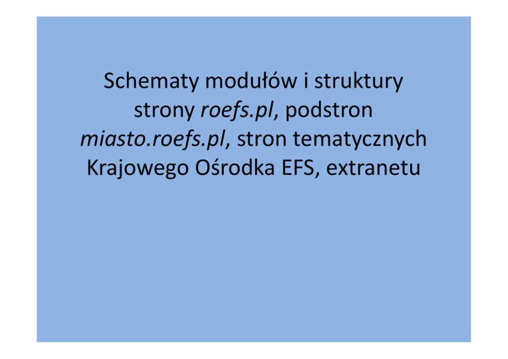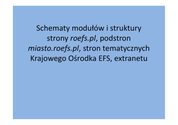 Schematy modułów i struktury strony roefs.pl, podstron miasto.roefs.pl, stron tematycznych Krajowego Ośrodka EFS, extranetu Strona ROEFS.pl Portal Krajowego Ośrodka EFS Mapa strony Logotyp Krajowego Ośrodka EFS – zgodnie z Księgą Tożsamości Aktualności Menu boczne wg propozycji Wykonawcy z uwzględnieniem pól wymaganych (lokalizacja do ustalenia w pierwszym etapie prac) oraz miejsce na banery organizacji partnerskich i współpracujących. Logotyp Programu Operacyjnego Kapitał Ludzki Europejski Fundusz Społeczny Kontakt Górny element graficzny – projekt wykonawcy (dopuszczalny jest subtelny element z wykorzystaniem technologii flash) Regionalne Ośrodki EFS Krajowy Ośrodek EFS Akademia Rozwoju Lokalnego Inicjatywy lokalne – Atlas Dobrych Praktyk Szkolenia e-learningowe 3 do 5 aktualności Mapa Polski z podziałem na regiony umożliwiająca wybór danego regionu, a następnie nazwy i kontakty do wszystkich Regionalnych Ośrodków EFS w danym województwie Moduł dolny na menu / dolny obszar roboczy wg. propozycji Wykonawcy z uwzględnieniem pól wymaganych (lokalizacja do ustalenia w pierwszym etapie prac) Kalendarz z wyeksponowanymi terminami zbliżających się wydarzeń lub spraw w ramach Sieci Regionalnych Ośrodków EFS logotyp Centrum Projektów Europejskich Formuła dotycząca współfinansowania portalu ze środków UE w ramach EFS. logotyp Unii Europejskiej oraz Europejskiego Funduszu Społecznego Elementy do rozlokowania na stronie wg propozycji Wykonawcy – z możliwością włączenia wybranych elementów, jako submenu elementów już rozmieszczonych na stronie Przydatne linki Ekspert radzi Komunikaty dla RO EFS Kontakt Najbliższe szkolenia Media o nas kto może skorzystać z Europejskiego Funduszu Społecznego Konferencje Dla mediów Czym jest Program Kapitał Ludzki? Konkursy Chcę skorzystać ze szkoleń Newsletter Mam ciekawy pomysł Mój sukces dzięki EFS Przewidywana struktura strony z możliwością jej nieznacznych zmian w pierwszych etapach prac HOME Aktualności Archiwum aktualności EFS Co to jest EFS Kto moŜe być projektodawcą do EFS Mój sukces dzięki EFS - kilka historii Dokumenty Regionalne Ośrodki EFS Cele Misja Oferta Struktura Lista ośrodków regionalnych WaŜne instytucje Słownik Krajowy Ośrodek EFS Cele Zadania Zespół Akademia Rozwoju Lokalnego Animacja społeczna Działalność animacyjna Ośrodków Diagnoza środowisk lokalnych Innowacja społeczna Ułatwianie współpracy (facylitacja) Edukacja środowiskowa Informowanie i ewaluacja Inicjatywy lokalne – Atlas Dobrych Praktyk Szkolenia e-Lerningowe Przydatne linki Chcę skorzystać ze szkoleń Mam ciekawy pomysł Mój sukces dzięki EFS Ekspert radzi Komunikaty dla RO EFS Media o nas … Dla mediów … Kontakt … Szablon podtron Regionalnych Ośrodków EFS wg schematu miasto.ROEFS.pl Podstrony regionalnych ośrodków EFS (szablon dla co najmniej 52) Mapa strony Logotyp Regionalnego Ośrodka EFS – zgodnie z Księgą Tożsamości Aktualności Menu boczne wg propozycji Wykonawcy z uwzględnieniem pól wymaganych (lokalizacja do ustalenia w pierwszym etapie prac) oraz miejsce na banery organizacji partnerskich i współpracujących. Logotyp Programu Operacyjnego Kapitał Ludzki Kontakt Górny element graficzny– projekt wykonawcy (dopuszczalny jest subtelny elementy z wykorzystaniem technologii flash) EFS bliżej ludzi Szkolenia Doradztwo Akademia Rozwoju Lokalnego Wszystko o nas 3 do 5 aktualności Mapa danego regionu z zaznaczonymi obszarami województwa przypisanymi do właściwego Regionalnego Ośrodka EFS z wyróżnionym kolorytycznie obszarem danego regionu który obejmuje Regionalny Ośrodek, na którego stronie się znajdujemy Moduł dolny na menu / dolny obszar roboczy wg. propozycji Wykonawcy z uwzględnieniem pól wymaganych (lokalizacja do ustalenia w pierwszym etapie prac) Dane do punktu informacyjnego danego Regionalnego Ośrodka EFS logotyp Instytucji Pośredniczącej logotyp organizacji realizującej zadania Regionalnego Ośrodka EFS Formuła dotycząca współfinansowania portalu ze środków UE w ramach EFS. logotyp Unii Europejskiej oraz Europejskiego Funduszu Społecznego Elementy do rozlokowania na stronie wg propozycji Wykonawcy Przydatne linki Kro może skorzystać z naszych usług Kontakt Najbliższe szkolenia EFS bliżej ludzi Punkt Nasza oferta Konkursy Newsletter Przewidywana struktura strony z możliwością jej nieznacznych zmian w pierwszych etapach prac HOME Aktualności BliŜej ludzi Szkolenia Co to jest EFS Program Kapitał Ludzki Po co powstał program? Jak jest wdraŜany? Co chcemy osiągnąć? Jak będą dzielone środki? Kto moŜe skorzystać? Jakie przedsięwzięcia będą finansowane? W jaki sposób program finansuje róŜne przedsięwzięcia? Mój sukces dzięki EFS Mam pomysł - chcę zrealizować projekt! Początki ? praca z dokumentami Od projektu do wniosku Składam wniosek ? jak będzie oceniany? Nie udało się ? co dalej? Wygrałem ? co dalej? Realizacja i rozliczenie projektu ? sprawozdania, wnioski i kontrole Mój projekt jest super ? jak się nim pochwalić? Chcę się szkolić, dokształcać, załoŜyć własną firmę z EFS Jak znaleźć coś dla siebie? Co ma dla mnie EFS? Jestem bezrobotny ? Jeszcze się uczę ? Pracuję i chcę się rozwijać ? Chcę załoŜyć własny biznes ? Działam na rzecz lokalnej społeczności ? Terminy szkoleń Formularz zgłoszeniowy Materiały szkoleniowe Porady Doradcy/Trenerzy Pytanie do eksperta Pytania i odpowiedzi Jak wypełnić wniosek? Wniosek o płatność Sprawozdania z realizacji projektu Porady on-line Formularze i wnioski Wszytko o nas Słownik WaŜne instytucje Ośrodki lokalne Cele Beneficjenci Oferta Struktura Kontakt Media o nas … Dla mediów … Akademia rozwoju lokalnego Animacja społeczna Działalnośc animacyjna Ośrodków Diagnoza środowisk lokalnych Innowacja społeczna Ułatwianie współpracy (facylitacja) Edukacja środowiskowa Informowanie i ewaluacja Stron
