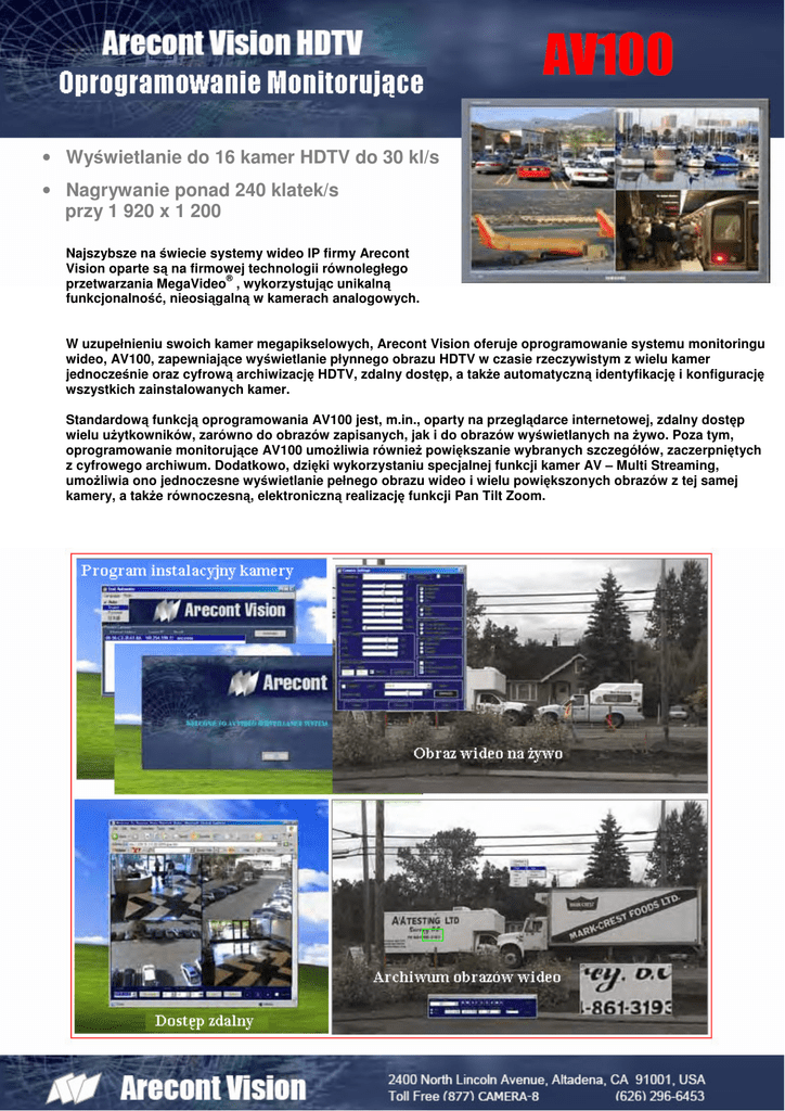 • Wyświetlanie do 16 kamer HDTV do 30 kl/s • Nagrywanie ponad 240 klatek/s przy 1 920 x 1 200 Najszybsze na świecie systemy wideo IP firmy Arecont Vision oparte są na firmowej technologii równoległego ® przetwarzania MegaVideo , wykorzystując unikalną funkcjonalność, nieosiągalną w kamerach analogowych. W uzupełnieniu swoich kamer megapikselowych, Arecont Vision oferuje oprogramowanie systemu monitoringu wideo, AV100, zapewniające wyświetlanie płynnego obrazu HDTV w czasie rzeczywistym z wielu kamer jednocześnie oraz cyfrową archiwizację HDTV, zdalny dostęp, a także automatyczną identyfikację i konfigurację wszystkich zainstalowanych kamer. Standardową funkcją oprogramowania AV100 jest, m.in., oparty na przeglądarce internetowej, zdalny dostęp wielu użytkowników, zarówno do obrazów zapisanych, jak i do obrazów wyświetlanych na żywo. Poza tym, oprogramowanie monitorujące AV100 umożliwia również powiększanie wybranych szczegółów, zaczerpniętych z cyfrowego archiwum. Dodatkowo, dzięki wykorzystaniu specjalnej funkcji kamer AV – Multi Streaming, umożliwia ono jednoczesne wyświetlanie pełnego obrazu wideo i wielu powiększonych obrazów z tej samej kamery, a także równoczesną, elektroniczną realizację funkcji Pan Tilt Zoom. Wyświetlacz wideo • Wielokamerowe wyświetlanie • Rozdzielczość • Maksymalna rozdzielczość • Szybkość transmisji wideo • Funkcja Multi Screaming Archiwizacja wideo • Zapis oparty na procedurach • Zapis wideo • Detekcja ruchu • Program AVI Video Maker • Zapis wielodyskowy • Odtwarzanie Zdalny dostęp • Poprzez przeglądarkę • Zdalne przeglądanie • Zdalne powiększanie • Dostęp wielo-systemowy Różne • Zabezpieczenie • Zdalne przeglądanie • Instalacja • Obsługa językowa • Zestaw rozwoju oprogramowania Do 16 kamer w czasie rzeczywistym Przeglądanie obrazu wideo w trybie pełnej, połowy i jednej czwartej rozdzielczości Pełny ekran do 2592 x 1944 Wyświetlacz pojedynczej kamery do 30 kl/s przy 1280 x 1024 (w zależności od szybkości CPU) Jednoczesne przeglądanie obrazów z wielu kamer w trybie rozdzielczości zredukowanej i powiększonych okienek o pełnej rozdzielczości z tych samych kamer (do 4 powiększonych okienek z każdej kamery, przekazywanych jako oddzielne strumienie wideo) Określa czas archiwizacji dla każdej kamery lub uruchamia zapis w przypadku wykrycia ruchu w polu widzenia kamery Ponad 240 kl/s przy rozdzielczości 1920 x 1200 Okna o różnej czułości detekcji ruchu oraz minimalny rozmiar obiektu ruchomego dla każdej kamery Tworzy klipy wideo AVI z materiałów archiwalnych wideo Określa dysk oraz ścieżkę zapisu dla archiwum wideo dla każdej kamery Interaktywne powiększanie podczas odtwarzania, odtwarzanie w pełnej lub zredukowanej rozdzielczości; zsynchronizowane odtwarzanie wielu kamer w tym samym czasie; odtwarzanie wszystkich klatek wideo, lub klatek z ruchem, odtwarzanie do przodu i do tyłu; odszukiwanie zapisanych obrazów według daty, czasu lub ruchu, odtwarzanie po jednej klatce, nagranych wydarzeń, eksport pojedynczych plików jpeg. Zdalny dostęp wideo przez przeglądarkę IE Przeglądanie obrazu wideo na żywo o pełnej lub zredukowanej rozdzielczości, z jednej lub z wielu kamer Wielu upoważnionych użytkowników może zażądać powiększenia obrazu wideo oraz niezależnie sterować PTZ dla każdej z kamer Dostęp do wielu systemów wideo z jednej strony internetowej Trzy poziomy dostępu hasłem: pełna kontrola, przeglądanie materiałów filmowych na żywo i z archiwum, lub sam monitoring na żywo Chroniony hasłem zdalny dostęp przez port definiowany dla wybranego użytkownika Automatyczna instalacja wszystkich połączonych kamer. Kamery AV są automatycznie identyfikowane i konfigurowane, wykorzystując adresy IP dostępne w sieci lokalnej Wiele wersji językowych SDK dla platformy Linux i Windows, umożliwiająca łatwą integrację obrazu wideo wysokiej rozdzielczości z innymi systemami. Arecont Vision zastrzega sobie prawo do zmiany produktów lub szczegółów technicznych bez powiadomienia.