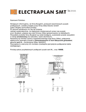 Szanowni Państwo. Niniejszym informujemy, że firma Burgahrt, producent aluminiowych puszek podłogowych, została przejęta przez firmę Gifas Electric GmbH (patrz oficjalny komunikat poniżej). W obrocie handlowym nic się nie zmienia. Jednak systematycznie, na większości dostarczanych przez nas puszek prod. Burghart, pojawia się znak firmowy Gifas (grawerowanie na dekielkach). Wszystkie produkty firmy Burghart są nadal dostępne, aczkolwiek przede wszystkim w wersji anodowanej (na naturalne, szare aluminium). Nowością są również (oprócz wygrawerowanego loga firmy Gifas), połączenia elektryczne wewnątrz puszek z zamontowanymi w nich fabrycznie gniazdami, głównie serii H... (oznaczenie Gifas: MASSO). Oszczędza to czas przy ich montażu (niezbędne jest jedynie podłączenia kabla zasilającego). Poniżej szkice przykładowych podłączeń puszki serii H... oraz 1990B. Dla puszek bez zamontowanych gniazd (z przygotowanymi ramkami pod gniazda), brak jest wewnętrznych połączeń. Muszą być one wykonane indywidualnie na budowie (lub warsztacie). Z poważaniem. Stanisław Sarnecki GIFAS-ELECTRIC GmbH kauft Ing. Franz Burghart GmbH Seit dem 1.1.2015 befindet sich die Firma Ing. Franz Burghart GmbH mit Sitz in Wien (www.bodensteckdosen.at) zu 100% im Besitz der Firma GIFAS ELECTRIC GmbH aus Eugendorf bei Salzburg (www.gifas.at). Wir sind ein Unternehmen, das seine Kenntnisse und Erfahrungen seit über 50 Jahren in der Elektrobranche ausbauen konnte. Unser Wissen geben wir gerne an unsere Kunden weiter und erfüllen schnellstmöglich Ihre Anforderungen und Wünsche. Durch die Übernahme der Firma Ing. Franz Burghart, in unsere international tätige Unternehmensgruppe, gewährleisten wir nicht nur unsere Kompetenz bei der produktbezogenen Beratung sondern auch die Qualität der Produkte. Diese können wir durch ein Zusammenspiel aus marktnaher Forschung und fertigungstechnischem Know-How in optimaler Weise sichern und erweitern. Wir stehen für Qualität, Zuverlässigkeit und Innovation.