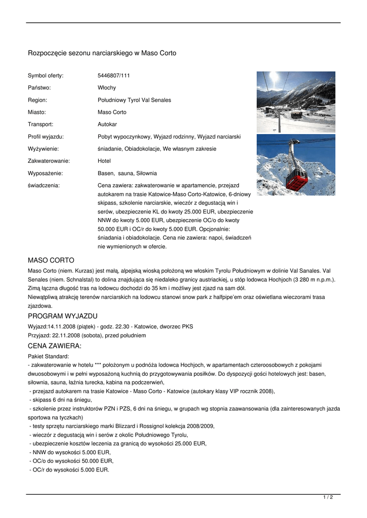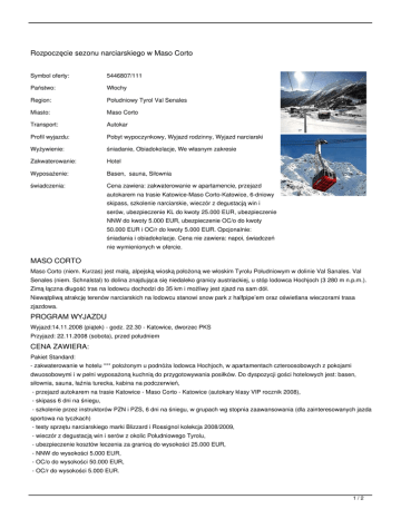 Rozpoczęcie sezonu narciarskiego w Maso Corto Symbol oferty: 5446807/111 Państwo: Włochy Region: Południowy Tyrol Val Senales Miasto: Maso Corto Transport: Autokar Profil wyjazdu: Pobyt wypoczynkowy, Wyjazd rodzinny, Wyjazd narciarski Wyżywienie: śniadanie, Obiadokolacje, We własnym zakresie Zakwaterowanie: Hotel Wyposażenie: Basen, sauna, Siłownia świadczenia: Cena zawiera: zakwaterowanie w apartamencie, przejazd autokarem na trasie Katowice-Maso Corto-Katowice, 6-dniowy skipass, szkolenie narciarskie, wieczór z degustacją win i serów, ubezpieczenie KL do kwoty 25.000 EUR, ubezpieczenie NNW do kwoty 5.000 EUR, ubezpieczenie OC/o do kwoty 50.000 EUR i OC/r do kwoty 5.000 EUR. Opcjonalnie: śniadania i obiadokolacje. Cena nie zawiera: napoi, świadczeń nie wymienionych w ofercie. MASO CORTO Maso Corto (niem. Kurzas) jest małą, alpejską wioską położoną we włoskim Tyrolu Południowym w dolinie Val Sanales. Val Senales (niem. Schnalstal) to dolina znajdująca się niedaleko granicy austriackiej, u stóp lodowca Hochjoch (3 280 m n.p.m.). Zimą łączna długość tras na lodowcu dochodzi do 35 km i możliwy jest zjazd na sam dół. Niewątpliwą atrakcję terenów narciarskich na lodowcu stanowi snow park z halfpipe’em oraz oświetlana wieczorami trasa zjazdowa. PROGRAM WYJAZDU Wyjazd:14.11.2008 (piątek) - godz. 22.30 - Katowice, dworzec PKS Przyjazd: 22.11.2008 (sobota), przed południem CENA ZAWIERA: Pakiet Standard: - zakwaterowanie w hotelu *** położonym u podnóża lodowca Hochjoch, w apartamentach czteroosobowych z pokojami dwuosobowymi i w pełni wyposażoną kuchnią do przygotowywania posiłków. Do dyspozycji gości hotelowych jest: basen, siłownia, sauna, łaźnia turecka, kabina na podczerwień, - przejazd autokarem na trasie Katowice - Maso Corto - Katowice (autokary klasy VIP rocznik 2008), - skipass 6 dni na śniegu, - szkolenie przez instruktorów PZN i PZS, 6 dni na śniegu, w grupach wg stopnia zaawansowania (dla zainteresowanych jazda sportowa na tyczkach) - testy sprzętu narciarskiego marki Blizzard i Rossignol kolekcja 2008/2009, - wieczór z degustacją win i serów z okolic Południowego Tyrolu, - ubezpieczenie kosztów leczenia za granicą do wysokości 25.000 EUR, - NNW do wysokości 5.000 EUR, - OC/o do wysokości 50.000 EUR, - OC/r do wysokości 5.000 EUR. 1/2 OPCJONALNIE: możliwość dokupienia śniadań i obiadokolacji W dodatkowych kosztach nalezy przewidzieć: kieszonkowe, napoje, herbata na stoku itp. TERMINY: od: 2017-11-03 do: 2017-11-11 (9 dni), miejsca: sprawdź miejsca cena od: 1750 PLN CENNIK: Długość pobytu: 9 dni Grupa cenowa: A Transport (obligatoryjny) (*) transport Katowice - Maso Corto - Katowice Pobyt w obiekcie (obligatoryjny) (*) pokój 2 osobowy w apartamencie 4 osobowym standardowo dla osób: 2 Inne (do wyboru) (*) pakiet Standard Wyżywienie (opcjonalne) śniadanie + obiadokolacja (-) (-) 1750 400 Waluta: PLN Aktualne ceny z systemu S.A.R.T. (-) - cena usługi, podatku kalkulowana przy osobie lub gratis (*) - kwota wliczona w cenę standardową 2/2