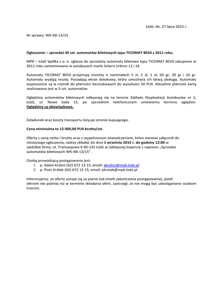 Łódź, dn. 27 lipca 2015 r. Nr sprawy: WK-KB-13/15 Ogłoszenie – sprzedaż 45 szt. automatów biletowych typu TICOMAT 8010 z 2011 roku. MPK – Łódź Spółka z o. o. zgłasza do sprzedaży automaty biletowe typu TICOMAT 8010 zakupione w 2011 roku zamontowane w autobusach marki Solaris Urbino 12 i 18 Automaty TICOMAT 8010 przyjmują monety o nominałach 5 zł, 2 zł, 1 zł, 50 gr, 20 gr i 10 gr. Automaty wydają resztę. Posiadają ekran dotykowy, który umożliwia ich łatwą obsługę. Automaty wyposażone są w czytnik do płatności bezstykowych do wysokości 50 PLN. Aktualnie płatność kartą realizowana jest w 3 szt. automatów. Oględziny automatów biletowych odbywają się na terenie Zakładu Eksploatacji Autobusów nr 2, Łódź, ul. Nowe Sady 15, po uprzednim telefonicznym umówieniu terminu oględzin. Oględziny są obowiązkowe. Załadunek oraz koszty transportu leżą po stronie kupującego. Cena minimalna to 12 000,00 PLN brutto/szt. Oferty z ceną netto i brutto oraz z wypełnionym oświadczeniem, które stanowi załącznik do niniejszego ogłoszenia, należy składać do dnia 1 września 2015 r. do godziny 12:00 w siedzibie firmy: ul. Tramwajowa 6 90-132 Łódź w zaklejonej kopercie z napisem „Sprzedaż automatów biletowych WK-KB-13/15”. Osobą prowadzącą postępowanie jest: 1. p. Adam Kralisz (42) 672 13 15, email: [email protected] 2. p. Piotr Królak (42) 672 13 15, email: [email protected] Informujemy, że oferty uznaje się za jawne (od chwili zakończenia postępowania), jeżeli oferent nie później niż w terminie składania ofert, zastrzegł, że nie mogą być udostępnione osobom trzecim. (MIEJSCOWOŚĆ, DATA) .............................. ................. .............................................................. imię, nazwisko/nazwa Oferenta .............................................................. NIP Oferenta .............................................................. KRS/Zaświadczenie o wpisie do ewidencji OŚWIADCZENIE Niniejszym, oświadczam, że: 1. Osobiście zapoznałem się ze stanem technicznym sprzedawanych automatów biletowych i w przypadku wybrania mojej oferty, nie będę wnosił zastrzeżeń do ich stanu przy odbiorze. 2. W przypadku wybrania mojej oferty, zobowiązuję się do odbioru automatów w ciągu ....... dni od daty wystawienia faktury (uwaga: termin zapłaty nie dłuższy niż 7 dni). 3. odbiór automatów nastąpi po dokonaniu zapłaty wynagrodzenia w wysokości wskazanej w mojej ofercie (a w konsekwencji – fakturze VAT), przy odbiorze automatów zobowiązuję się do okazania dowodu zapłaty przedmiotowej kwoty. ..................................................... Podpis osoby upoważnionej do reprezentacji podmiotu