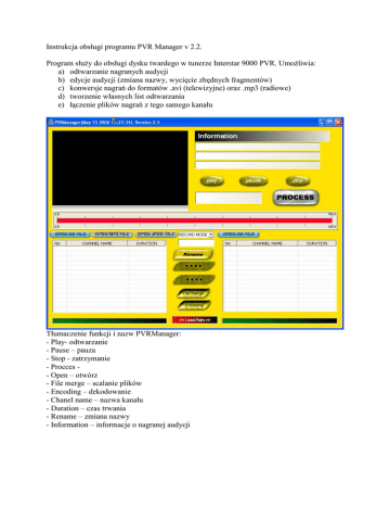 Instrukcja obsługi programu PVR Manager v 2.2. Program słuŜy do obsługi dysku twardego w tunerze Interstar 9000 PVR. UmoŜliwia: a) odtwarzanie nagranych audycji b) edycje audycji (zmiana nazwy, wycięcie zbędnych fragmentów) c) konwersje nagrań do formatów .avi (telewizyjne) oraz .mp3 (radiowe) d) tworzenie własnych list odtwarzania e) łączenie plików nagrań z tego samego kanału Tłumaczenie funkcji i nazw PVRManager: - Play- odtwarzanie - Pause – pauza - Stop - zatrzymanie - Procces - Open – otwórz - File merge – scalanie plików - Encoding – dekodowanie - Chanel name – nazwa kanału - Duration – czas trwania - Rename – zmiana nazwy - Information – informacje o nagranej audycji Podłączenie tuner – komputer Obydwa urządzenia musza być włączone. Po podłączeniu kablem USB na ekranie telewizora powinien pojawić się komunikat o podłączeniu tunera do PC, a następnie informacja o instalacji w systemie. Proces rozpoznawania dysku tunera w komputerze moŜe potrwać do 5 min i spowodować brak aktywności PC-ta. Operacje Po podłączeniu naleŜy wybrać rodzaj operacji. Klikając klawisz „Open DB file” pojawi się okno z moŜliwością wskazania lokalizacji plików. Format .db jest formatem zapisu danych w tunerze, więc naleŜy znaleźć dysk, wskazać folder i konkretny plik. Po lewej stronie ekrany wyświetli się lista nagranych programów. Folder z nagraniami programów telewizyjnych ma oznaczenie DZT***.DB, radiowe są zgrupowane w folderze DZR***.DB. Aby dokonać jakichkolwiek operacji na nagraniach, naleŜy je najpierw skopiować na dysk lokalny komputera, widoczny po lewej stronie ekranu (zaznaczenie pliku do przegrania z tunera, klikniecie strzałki w prawo, wskazanie lokalizacji na dysku komputera). W tym momencie pojawi się komunikat o braku folderu, naleŜy kliknąć TAK. i stworzyć folder na dysku twardym komputera (operacja jednorazowa). Utworzenie folderu oraz potwierdzenie uruchamia transfer zaznaczonego programu na HDD komputera. Po zaznaczeniu programu moŜna: - odtworzyć plik (Play) - zmienić jego nazwę (Rename) – w oknie nad przyciskiem a następnie potwierdzić, klikając Rename - podczas odtwarzania wyciąć zbędne fragmentu zaznaczając kursorem początek i koniec części do wycięcia a następnie klikając Process. Podczas odtwarzania wyświetla się dokładny czas, ten sam jest równieŜ dostępny na pasku edycji. W ten sposób moŜna precyzyjnie określić początek i koniec fragmentu do wycięcia. - skopiować pliki graficzne (.jpg) lub audio (.mp3) z dysku komputera do tunera uŜywając dowolnego menadŜera plików. Tuner domyślnie ma utworzone katalogi IMAGE (zdjęcia w formacie .jpg) oraz MP3 (muzyka w formacie .mp3). Do tych katalogów naleŜy skopiować odpowiednie pliki. Katalogi są dostępne poziomu PVRManagera po zmianie trybu pracy (okno rozwijalne ponad edycja nazwy). Zmiana trybu na np. JPEG MODE powoduje uaktywnienie klawisza OPEN JPEG FILE i przeglądanie zawartości folderu na dysku tunera. Analogicznie wygląda to w przypadku plików muzycznych mp3. - zmienić format nagranego pliku na .avi lub .mp3 Zmiana formatu pliku Po skopiowaniu na dysk lokalny komputera, proszę wskazać plik, nacisnąć Encoding. Program zapyta o scalanie pliku (Merge), potwierdzić OK., następnie wyświetli się okno , gdzie naleŜy podać ścieŜkę do miejsca , gdzie ma być zapisany plik po konwersji. WaŜna uwaga: ścieŜka zarówno do miejsca przechowywania pliku w komputerze, jak i do folderu, gdzie ma być zapisany plik po konwersji NIE MOśE zawierać polskich znaków !!! Najbezpieczniej jest dokonywać operacji bezpośrednio na dysku (np. ścieŜka wygląda tak : C:\ ) Pozostaje potwierdzenie Start Encoding i operacja zostanie uruchomiona. Zapisane jako .avi pliki moŜna nagrywać na płyty CD (DivX) i odtwarzać w dowolnym napędzie. Identycznie wygląda proces konwersji nagranych audycji radiowych na format .mp3 Parametry konwersji: --------------------Video Setting ----------------------------Change Frame – ilość klatek na sekundę. Dla PDA 15 jest wystarczające. PAL - 25 NTSC 30 15.000 25.000 30.000 Change Size - zmiana rozmiaru pliku oDivX. PAL - 720*576 NTSC - 720*480 Encoding type – format po dekodowaniu. Jakość obrazu jest najlepsza w H264, XVID oraz DIVX , ale szybkość dekodowania jest najmniejsza w H264, XVID, DIVX. XVID moŜe być niestabilne, H264 jest niedostępne na PDA. 0:Open Divx4 – rekomendowane 1:XVid 2:MS Mpeg(Divx3) 3:WMV3 4:WMV4 5:X264 6:mjpeg 7:mpeg4 Crop – przycięcie, jeśli rozmiar obrazu jest za duŜy. 1.33 to 4:3, 1.77 to 16:9. Bitrate- ilość dekodowanych bitów na sekundę. Dla PDA, animacji i niezbyt szybko zmieniających się scen – 150, dla wysokiej rozdzielczości oraz filmów akcji wystarczy 250. 150 200 250 300 500 1000 – rekomendowane 1500 --------------------------- Audio Setting ---------------------------Bitrate – próbkowanie, w związku z tym jakość dźwięku. Ogólnie 48 najniŜsza 64 rekomendowana. Dla najwyŜszej jakości naleŜy ustawić 128. 48 64 128 Audio volume – siła głosu. Rekomendowane 0 Audio algorithm – ustawienia kompresji MP3. Im wyŜsza wartość , tym mniejsza jakość, ale szybkość operacji wzrasta. Zalecane 7 Audio mode – ustawienia trybu audio, rekomendowane 1 0 - stereo 1 - joining-stereo 2 - dual channel 3 - mono VBR – rekomendowane ustawienie 3 0 - cbr 1 - mt 2 - rh 3 - abr 4 - mtrh Sample – próbkowanie, przydatny gdy odtwarzacz wspiera tylko wartości 44100Hz lub 22050Hz.