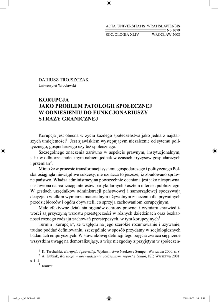 ACTA UNIVERSITATIS WRATISLAVIENSIS No 3079 SOCJOLOGIA XLIV WROCŁAW 2008 DARIUSZ TROJSZCZAK Uniwersytet Wrocławski KORUPCJA JAKO PROBLEM PATOLOGII SPOŁECZNEJ W ODNIESIENIU DO FUNKCJONARIUSZY STRAŻY GRANICZNEJ Korupcja jest obecna w życiu każdego społeczeństwa jako jedna z najstarszych umiejętności1. Jest zjawiskiem występującym niezależnie od sytemu politycznego, gospodarczego czy też społecznego. Szczególnego znaczenia zarówno w aspekcie prawnym, instytucjonalnym, jak i w odbiorze społecznym nabiera jednak w czasach kryzysów gospodarczych i przemian2. Mimo że w procesie transformacji systemu gospodarczego i politycznego Polska osiągnęła niewątpliwe sukcesy, nie oznacza to jeszcze, iż zbudowano sprawne państwo. Władza administracyjna powszechnie oceniana jest jako niesprawna, nastawiona na realizację interesów partykularnych kosztem interesu publicznego. W gestiach urzędników administracji państwowej i samorządowej spoczywają decyzje o wielkim wymiarze materialnym i żywotnym znaczeniu dla prywatnych przedsiębiorców i ogółu obywateli, co sprzyja zachowaniom korupcyjnym. Mało efektywne działania organów ochrony prawnej i wymiaru sprawiedliwości są przyczyną wzrostu przestępczości w różnych dziedzinach oraz bezkarności różnego rodzaju zachowań przestępczych, w tym korupcyjnych3. Termin „korupcja”, ze względu na jego szerokie rozumowanie i używanie, trudno poddać definiowaniu, szczególnie w sposób przydatny w socjologicznych badaniach empirycznych. W słownikowej definicji tego pojęcia zwraca się przede wszystkim uwagę na demoralizujący, a więc niezgodny z przyjętym w społeczeń1 2 K. Tarchalski, Korupcja i przywilej, Wydawnictwo Naukowe Semper, Warszawa 2000, s. 8. A. Kubiak, Korupcja w doświadczeniu codziennym, raport z badań, ISP, Warszawa 2001, s. 1–4. 3 druk_soc_XLIV.indd 381 Ibidem. 2008-11-03 14:13:48 382 DARIUSZ TROJSZCZAK stwie systemem wartości charakter korupcji – korupcja oznacza rozkład, zepsucie moralne, wykorzystywanie machinacji łapówkarskich4. Słownik języka polskiego za korupcję uznaje „przyjmowanie lub żądanie przez pracownika instytucji państwowej lub społecznej korzyści majątkowej lub osobistej w zamian za wykonanie czynności urzędowej lub za naruszenie prawa”5. W tej definicji akcent pada na instytucjonalno-prawne aspekty korupcji. Definiując korupcję, spotykamy się również z teorią wymiany, gdzie ściśle określone są związki między „dawcą” a „biorcą”. „Osoby, które dają wiele innym – pisze Homans – starają się również wiele od nich otrzymywać, a ci, którzy otrzymują wiele od innych, są zmuszeni wiele im dawać [...]. To, co daje osoba zaangażowana w proces wymiany, może być dla niej kosztem; to, co otrzymuje – nagrodą”6. Korupcja jest również patologią społeczną, rozumianą jako przejaw niepożądanych zachowań ludzkich wobec powszechnie uznawanych wzorów, norm i wartości7. Jako swoistą odmianą przestępczości, swoimi skutkami dotyka coraz to szerszych kręgów społecznych8. Różnorodne formy zachowań patologicznych i ich klasyfikację przedstawia R. Merton. W jego rozważaniach patologia społeczna definiowana jest na podstawie koncepcji anomii, a więc takiej sytuacji, w której osoby w niej tkwiące traktują otaczający je system społeczny z osłabionym respektem wobec podstawowych norm społecznych, gdyż uważają, iż normy te straciły swoją obligatoryjność. Anomia nie oznacza braku norm czy nawet braku rozumienia ich jasności, lecz sytuację, w której podmioty działające, znając normy mające je jakoby obowiązywać, są w stosunku do nich ambiwalentne9. W literaturze prawniczej „korupcja” nie jest używanym pojęciem, nie występuje w żadnych aktach prawnych i nie ma jej prawnej definicji. Przez prawników określana jest terminem przekupstwa zamiennie zwanego „łapownictwem czynnym”10. Transparency International czy Bank Światowy, badając problematykę korupcji w różnych krajach, koncentrują się na sektorze publicznym i definiują korupcję jako nadużywanie urzędu publicznego dla osiągnięcia prywatnych korzyści11. 4 T. Piotrowski, Z. Saloni, Słownik angielsko-polski i polsko-angielski, Wilga, Warszawa 2000, s. 109. 5 Słownik współczesnego języka polskiego, B. Dunaj (red.), SMS, Kraków, s. 282. 6 A. Kubiak, op. cit., s. 1–4. 7 R. Dyoniziak, K. Iwanicka, A. Karwińska, Z. Pucek, Społeczeństwo w procesie zmian, Universitas, Kraków 1994, s. 3–6. 8 K. Sławik, Patologie w III Rzeczypospolitej, Katowice 1994, s. 15–16. 9 R. Merton, Teoria socjologiczna i struktura społeczna, PWN, Warszawa 1969, s. 224. 10 A. Marek, Komentarz do kodeksu karnego. Część ogólna, Wydawnictwo Prawnicze, Warszawa 1999, s. 31. 11 Dane Banku Światowego i Transparency International druk_soc_XLIV.indd 382 2008-11-03 14:13:48 Korupcja a funkcjonariusze Straży Granicznej 383 W preambule prawnokarnej konwencji o korupcji, podpisanej również z Polską w Strasburgu 27 lutego 1999 r., korupcja zagraża praworządności, demokracji, prawom człowieka, narusza zasady uczciwości i sprawiedliwości społecznej, spowalnia rozwój gospodarczy, zagraża stabilności instytucji demokratycznych i moralnym podstawom społeczeństwa. By skutecznie się jej przeciwstawić, państwa Unii Europejskiej wraz z państwami członkowskimi, w Traktacie Amsterdamskim z 2 listopada 1997 r., zobowiązały się do wzajemnej współpracy w zakresie zwalczania korupcji, traktując ją jako problem o skali międzynarodowej. Nadmienić należy, że Polska występuje tutaj jako państwo, w którym problem korupcji nosi znamiona patologii społecznej, czego dowodem są z roku na rok pogarszające się statystyki. Dla Straży Granicznej konieczne jest przestrzeganie standardów prawnych i etycznych, w tym przeciwdziałanie korupcji, mając na uwadze bezpieczny rozwój państwa. Istniejące różnice w zaopatrzeniu rynku w to