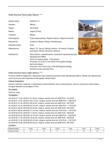 Hotel Domina Parco dello Stelvio **** Symbol oferty: 5446761/111 Państwo: Włochy Region: Val Di Sole Miasto: Cogolo Di Pejo Transport: Własny Profil wyjazdu: Pobyt wypoczynkowy, Wyjazd rodzinny, Wyjazd narciarski Wyżywienie: śniadanie, Obiady, Kolacje, Obiadokolacje Zakwaterowanie: Hotel Wyposażenie: Basen, TV, sauna, Parking, Internet , W mieście, Program świadczenia: Cena zawiera: zakwaterowanie, wyżywienie wg wybranej opcji, animacyjny, Winda, Narciarnia, Siłownia ubezpieczenie NWKL. Cena nie zawiera: garaż - 5 Euro/dzień. W okresie 13.12-20.12 oraz 28.03-04.04 goście dostają darmowy skipass. W okresie 10.01-24.01 oraz 14.03-28.03 goście dostają 6-dniowy karnet narciarski Peio. Hotel Domina Parco dello Stelvio **** Przytulny hotelik w eleganckim, tradycyjnym stylu, położony pośrodku Parku Narodowego Stelvio. Pokoje oraz apartamenty Junior Suite są w pełni wyposażone dla wygody naszych gości. Usługi bezpłatne Centrum wellness z basenem z wbudowanym hydromasażem, sauna, łaźnia parowa, vitarium, przestronna strefa relaksu. Przejazd skibusem do wyciągów w Peio. Za opłatą Centrum urody. TERMINY: od: 2018-01-14 do: 2018-01-21 (8 dni), miejsca: zamów cena od: 2236 PLN = 515 EUR od: 2018-01-14 do: 2018-01-28 (15 dni), miejsca: zamów cena od: 4698 PLN = 1082 EUR od: 2018-01-21 do: 2018-01-28 (8 dni), miejsca: zamów cena od: 2462 PLN = 567 EUR od: 2018-01-21 do: 2018-02-04 (15 dni), miejsca: zamów cena od: 4923 PLN = 1134 EUR od: 2018-01-28 do: 2018-02-04 (8 dni), miejsca: zamów cena od: 2462 PLN = 567 EUR od: 2018-01-28 do: 2018-02-11 (15 dni), miejsca: zamów cena od: 5154 PLN = 1187 EUR od: 2018-02-04 do: 2018-02-11 (8 dni), miejsca: zamów cena od: 2692 PLN = 620 EUR od: 2018-02-04 do: 2018-02-18 (15 dni), miejsca: zamów cena od: 5384 PLN = 1240 EUR od: 2018-02-11 do: 2018-02-18 (8 dni), miejsca: zamów cena od: 2692 PLN = 620 EUR od: 2018-02-11 do: 2018-02-25 (15 dni), miejsca: zamów cena od: 5154 PLN = 1187 EUR od: 2018-02-18 do: 2018-02-25 (8 dni), miejsca: zamów cena od: 2462 PLN = 567 EUR CENNIK: Długość pobytu: 15 dni 8 dni 15 dni 8 dni 8 dni 15 dni Grupa cenowa: H H F F G G 1/2 Wyżywienie (do wyboru) (*) śniadania i obiadokolacje śniadanie, obiad, kolacja (-) (-) (-) (-) (-) (-) 210 105 210 105 105 210 50 % 50 % 50 % (-) (-) (-) 105 105 210 (-) (-) (-) Pobyt w obiekcie (do wyboru) pokój 2os. dla 1os. 50 % 50 % 50 % pokój 2-osobowy + dostawka standardowo dla osób: 3 (-) (-) (-) pokój 1-osobowy 210 105 210 (*) pokój 2-osobowy COMFORT+dostawka+dziecko 0-6 lat standardowo dla osób: 2 (-) (-) (-) Ubezpieczenie (do wyboru) ubezpieczene NWKL SKI 30 15 30 15 15 30 14 7 14 7 7 14 -70 % -70 % -70 % -70 % -70 % -70 % -50 % -50 % -50 % -50 % -50 % -50 % (-) (-) (-) (-) (-) -30 % -30 % -30 % -30 % -30 % -10 % -10 % -10 % -10 % -10 % -100 % -100 % -100 % -100 % -100 % 70 140 70 70 140 2.4 % 2.4 % 2.4 % 2.4 % 2.4 % 613 1016 508 560 1120 (*) ubezpieczenie KL i NNW Rodzaj osoby (do wyboru) dziecko 1-2 lat dziecko 3-6 lat na dostawce (*) osoba dorosła (-) Dziecko w wieku 7-11 na dostawce -30 % osoba dorosła na dostawce (3cia os w pokoju) -10 % dziecko 0-1 lat -100 % Inne (opcjonalne) Dopłata do pokoju Junior Suite 140 Ubezpieczenie (opcjonalne) ubezpieczenie - od kosztów rezygnacji 2.4 % Inne (obligatoryjne) (*) pakiet w/g świadczeń 1226 Waluta: EUR Aktualne ceny z systemu S.A.R.T. (-) - cena usługi, podatku kalkulowana przy osobie lub gratis (*) - kwota wliczona w cenę standardową 2/2