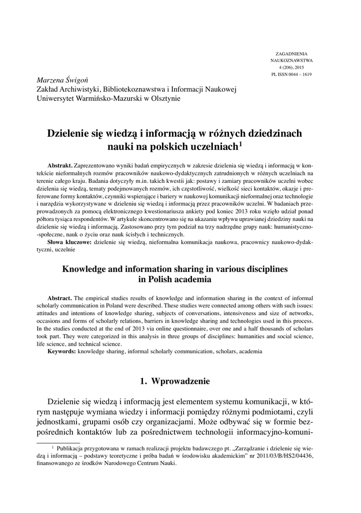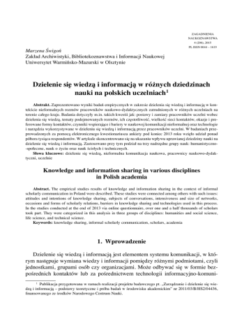 Marzena Świgoń Zakład Archiwistyki, Bibliotekoznawstwa i Informacji Naukowej Uniwersytet Warmińsko-Mazurski w Olsztynie ZAGADNIENIA NAUKOZNAWSTWA 4 (206), 2015 PL ISSN 0044 – 1619 Dzielenie się wiedzą i informacją w różnych dziedzinach nauki na polskich uczelniach1 Abstrakt. Zaprezentowano wyniki badań empirycznych w zakresie dzielenia się wiedzą i informacją w kontekście nieformalnych rozmów pracowników naukowo-dydaktycznych zatrudnionych w różnych uczelniach na terenie całego kraju. Badania dotyczyły m.in. takich kwestii jak: postawy i zamiary pracowników uczelni wobec dzielenia się wiedzą, tematy podejmowanych rozmów, ich częstotliwość, wielkość sieci kontaktów, okazje i preferowane formy kontaktów, czynniki wspierające i bariery w naukowej komunikacji nieformalnej oraz technologie i narzędzia wykorzystywane w dzieleniu się wiedzą i informacją przez pracowników uczelni. W badaniach przeprowadzonych za pomocą elektronicznego kwestionariusza ankiety pod koniec 2013 roku wzięło udział ponad półtora tysiąca respondentów. W artykule skoncentrowano się na ukazaniu wpływu uprawianej dziedziny nauki na dzielenie się wiedzą i informacją. Zastosowano przy tym podział na trzy nadrzędne grupy nauk: humanistyczno-społeczne, nauk o życiu oraz nauk ścisłych i technicznych. Słowa kluczowe: dzielenie się wiedzą, nieformalna komunikacja naukowa, pracownicy naukowo-dydaktyczni, uczelnie Knowledge and information sharing in various disciplines in Polish academia Abstract. The empirical studies results of knowledge and information sharing in the context of informal scholarly communication in Poland were described. These studies were connected among others with such issues: attitudes and intentions of knowledge sharing, subjects of conversations, intensiveness and size of networks, occasions and forms of scholarly relations, barriers in knowledge sharing and technologies used in this process. In the studies conducted at the end of 2013 via online questionnaire, over one and a half thousands of scholars took part. They were categorized in this analysis in three groups of disciplines: humanities and social science, life science, and technical science. Keywords: knowledge sharing, informal scholarly communication, scholars, academia 1. Wprowadzenie Dzielenie się wiedzą i informacją jest elementem systemu komunikacji, w którym następuje wymiana wiedzy i informacji pomiędzy różnymi podmiotami, czyli jednostkami, grupami osób czy organizacjami. Może odbywać się w formie bezpośrednich kontaktów lub za pośrednictwem technologii informacyjno-komuni1 Publikacja przygotowana w ramach realizacji projektu badawczego pt. „Zarządzanie i dzielenie się wiedzą i informacją – podstawy teoretyczne i próba badań w środowisku akademickim” nr 2011/03/B/HS2/04436, finansowanego ze środków Narodowego Centrum Nauki. 390 MARZENA ŚWIGOŃ kacyjnych. Dzielenie się wiedzą i informacją dotyczy wymiany myśli, poglądów czy opinii wypowiadanych ustnie oraz utrwalonych w formie pisemnej. Nazywane jest w literaturze przedmiotu także komunikacją (interpersonalną, społeczną) lub transferem wiedzy (Świgoń 2015). Określenie dzielenie się wiedzą (knowledge sharing) spopularyzowane zostało w literaturze nauk ekonomicznych i nauk o zarządzaniu w latach dziewięćdziesiątych ubiegłego wieku, wraz z rozwojem koncepcji, później obszaru badań o nazwie zarządzanie wiedzą (knowledge management), jak też zarządzanie wiedzą i informacją (knowledge and information management). Zarządzanie wiedzą i informacją jako interdyscyplinarny i multidyscyplinarny obszar badań obejmuje bogatą i różnorodną problematykę dotyczącą z jednej strony kapitału ludzkiego, kapitału intelektualnego, zarządzania zasobami ludzkimi, a z drugiej narzędzi i systemów informatycznych umożliwiających gromadzenie, przechowywanie, wyszukiwanie, udostępnianie i rozpowszechnianie zasobów wiedzy i informacji (Świgoń 2012, s. 59–100). Największym wyzwaniem dla badaczy dzielenia się wiedzą i informacją, podobnie jak nadrzędnego do niej zarządzania wiedzą i informacją, jest analiza tych procesów w odniesieniu do wiedzy i informacji w ich formie ukrytej (cichej, niezapisanej, tacit), w odróżnieniu od formy jawnej, zapisanej (explicit), która stosunkowo łatwo poddaje się obserwacji (Li i in. 2014). W kontekście komunikacji naukowej będącej przedmiotem tego artykułu, jawną postacią wiedzy i informacji są przede wszystkim tradycyjne i elektroniczne publikacje naukowe (Sapa 2009). Publikacje oraz ich cytowania stanowią przedmiot różnych analiz bibliometrycznych i naukometrycznych, prowadzonych od dawna m.in. na gruncie informatologii (Skalska-Zlat 1991; 2004; Stefaniak 1999). Badania empiryczne opisane w tym artykule są częścią szerszej analizy dzielenia się wiedzą i informacją w kontekście nieformalnej komunikacji naukowej (zob. Świgoń 2015). Mając na uwadze płynną granicę pomiędzy formalnymi i nieformalnymi kanałami komunikacji naukowej, autorka skoncentrowała się na takim rodzaju dzielenia się wiedzą i informacją, które jest najbardziej zbliżone do rozmowy naukowej (Konieczna 1982). Rozmowa od czasów Platona była podstawową formą wymiany poglądów i doświadczeń naukowych. I chociaż dzisiaj, w związku z rozwojem technologii informacyjno-komunikacyjnych, nawiązywanie kontaktów naukowych (formalnych i nieformalnych, o zasięgu globalnym i lokalnym) odbywa się w różny sposób, znaczenie rozmowy w rozwoju nauki wydaje się niepodważalne. Takie ulotne akty wymiany myśli i poglądów z trudem poddają się analizie, toteż badań w tym zakresie w środowisku naukowym prowadzono niewiele, zarówno na świecie, jak i w Polsce. Przegląd tych badań autorka zawarła w przywołanej pracy (Świgoń 2015). Wynikało z nich m.in., że kultura dzielenia się wiedzą na uczelniach brytyjskich ma charakter zind