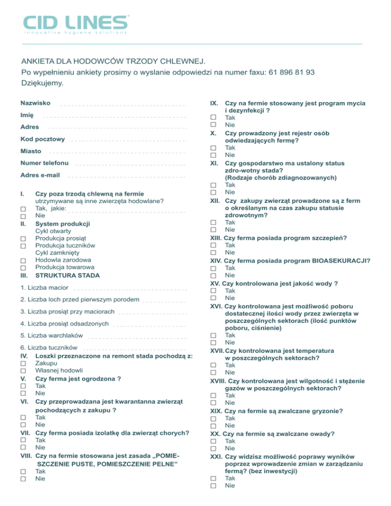 ANKIETA DLA HODOWCÓW TRZODY CHLEWNEJ. Po wypełnieniu ankiety prosimy o wyslanie odpowiedzi na numer faxu: 61 896 81 93 Dziękujemy. Nazwisko Imię Adres Kod pocztowy Miasto Numer telefonu Adres e-mail I. II. III. Czy poza trzodą chlewną na fermie utrzymywane są inne zwierzęta hodowlane? Tak, jakie: Nie System produkcji Cykl otwarty Produkcja prosiąt Produkcja tuczników Cykl zamknięty Hodowla zarodowa Produkcja towarowa STRUKTURA STADA 1. Liczba macior 2. Liczba loch przed pierwszym porodem 3. Liczba prosiąt przy maciorach 4. Liczba prosiąt odsadzonych 5. Liczba warchlaków 6. Liczba tuczników IV. Loszki przeznaczone na remont stada pochodzą z: Zakupu Własnej hodowli V. Czy ferma jest ogrodzona ? Tak Nie VI. Czy przeprowadzana jest kwarantanna zwierząt pochodzących z zakupu ? Tak Nie VII. Czy ferma posiada izolatkę dla zwierząt chorych? Tak Nie VIII. Czy na fermie stosowana jest zasada „POMIESZCZENIE PUSTE, POMIESZCZENIE PELNE” Tak Nie IX. Czy na fermie stosowany jest program mycia i dezynfekcji ? Tak Nie X. Czy prowadzony jest rejestr osób odwiedzających fermę? Tak Nie XI. Czy gospodarstwo ma ustalony status zdro-wotny stada? (Rodzaje chorób zdiagnozowanych) Tak Nie XII. Czy zakupy zwierząt prowadzone są z ferm o określanym na czas zakupu statusie zdrowotnym? Tak Nie XIII. Czy ferma posiada program szczepień? Tak Nie XIV. Czy ferma posiada program BIOASEKURACJI? Tak Nie XV. Czy kontrolowana jest jakość wody ? Tak Nie XVI. Czy kontrolowana jest możliwość poboru dostatecznej ilości wody przez zwierzęta w poszczególnych sektorach (ilość punktów poboru, ciśnienie) Tak Nie XVII. Czy kontrolowana jest temperatura w poszczególnych sektorach? Tak Nie XVIII. Czy kontrolowana jest wilgotność i stężenie gazów w poszczególnych sektorach? Tak Nie XIX. Czy na fermie są zwalczane gryzonie? Tak Nie XX. Czy na fermie są zwalczane owady? Tak Nie XXI. Czy widzisz możliwość poprawy wyników poprzez wprowadzenie zmian w zarządzaniu fermą? (bez inwestycji) Tak Nie