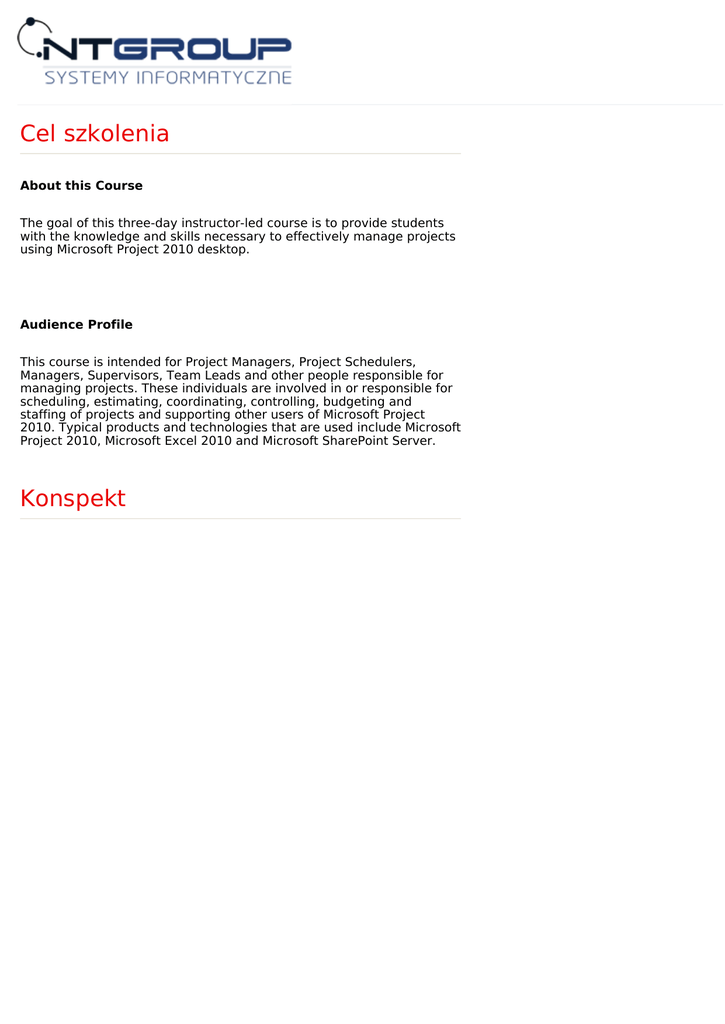 Cel szkolenia About this Course The goal of this three-day instructor-led course is to provide students with the knowledge and skills necessary to effectively manage projects using Microsoft Project 2010 desktop. Audience Profile This course is intended for Project Managers, Project Schedulers, Managers, Supervisors, Team Leads and other people responsible for managing projects. These individuals are involved in or responsible for scheduling, estimating, coordinating, controlling, budgeting and staffing of projects and supporting other users of Microsoft Project 2010. Typical products and technologies that are used include Microsoft Project 2010, Microsoft Excel 2010 and Microsoft SharePoint Server. Konspekt At Course Completion - Explain the new user interface of Microsoft Project 2010. - Initialize Microsoft Project settings. - Create a Work Breakdown Structure (WBS) Nazwa: - Create task relationships in a project schedule. Szkolenie MS 55100 Managing Projects using Microsoft Project 2010 Desktop - Configure advanced task information and use the Task Inspector. Czas trwania: 3 dni - Create and manage resources. Ilość godzin: 24 Język: - Assign and level work resources. Prowadzący: Certyfikowany Trener Microsoft Lokalizacja: NT Group Łódź, siedziba klienta, lub dowolne miasto w Polsce Cena szkolenia: 1900 PLN - Review and finalize the project schedule. - Track and update project schedules. - Customize Project 2010 features. - Communicate project information in your organization. Dostępne terminy - Manage multiple projects and resource pools. NT GROUP Sp. z o.o. 90-418 Łódź, Al. T. Kościuszki 39 III piętro Dodatkowe informacje infolina 801 011 684 Tel.: +48 42 655-33-77; Fax: +48 42 630-15-63 e-mail: [email protected] W cenę szkolenia wliczony jest: Certyfikat Microsoft Materiały szkoleniowe, notatnik, długopis Kontakt z trenerem po szkoleniu Kawa, herbata, słodki poczęstunek Obiad Firma posiada wpis w Urzędzie Miasta Łodzi jako placówka kształcenia ustawicznego. NT Group Systemy Informatyczne Sp. z o.o. Krajowy Rejestr Sądowy Konto Bankowe 90-418 Łódź, Al. T. Kościuszki 39 III piętro KRS 0000214993 Kredyt Bank S.A. tel.: +42 6553377 Sąd Rejonowy dla Łodzi-Śródmieścia Rozliczenie Krajowe: tel. / fax. +42 6301563 w Łodzi, XX Wydział KRS 71 1500 1246 1215 4005 5991 0000 e-mail: [email protected] www.ntgroup.pl Rozliczenie Zagraniczne: Regon: 470557218 PL 71 1500 1246 1215 4005 5991 0000 NIP: 7251888624 KRDBPLPW