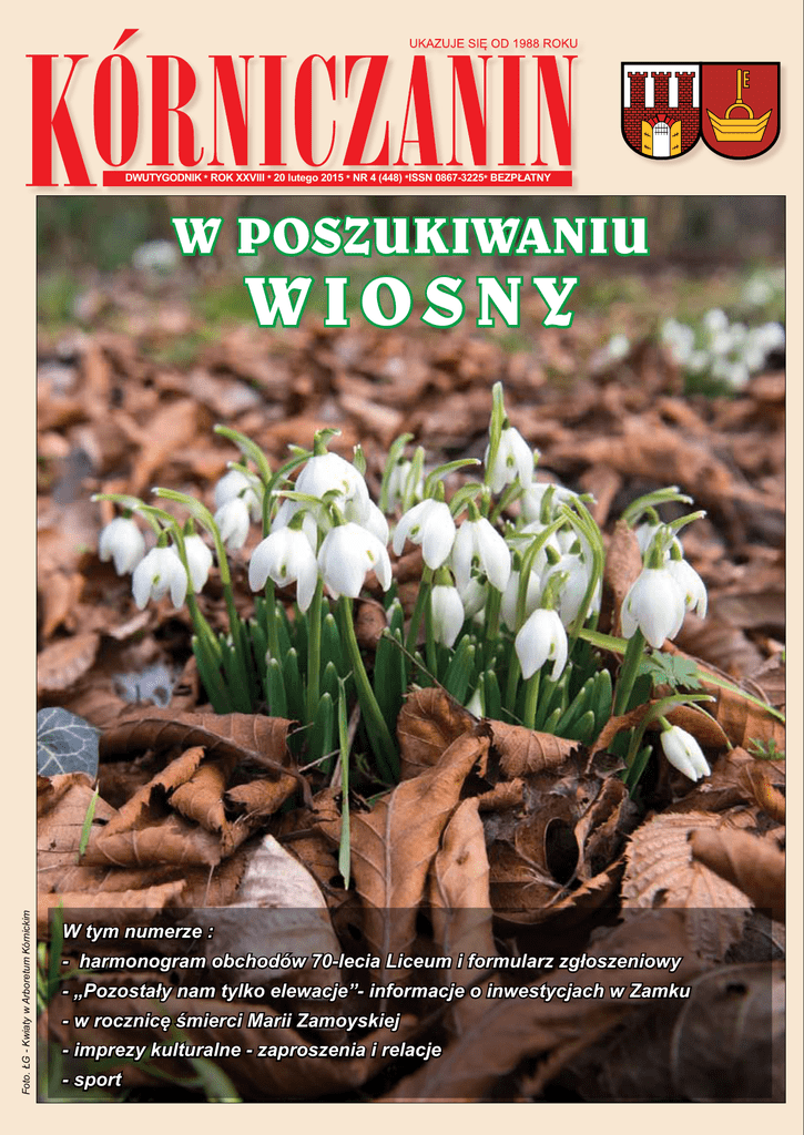 DWUTYGODNIK * ROK XXVIII * 20 lutego 2015 * NR 4 (448) *ISSN 0867-3225* BEZPŁATNY P a t r y k R a j k o w s k i W POSZUKIWANIU MISTRZ EUROPY JUNIORÓW Foto. ŁG - Kwiaty w Arboretum Kórnickim WIOSNY s t r. 2 1 W tym numerze : - harmonogram obchodów 70-lecia Liceum i formularz zgłoszeniowy - „Pozostały nam tylko elewacje”- informacje o inwestycjach w Zamku - w rocznicę śmierci Marii Zamoyskiej - imprezy kulturalne - zaproszenia i relacje - sport Głosuj! w w w. k o r n i k . p l / b o g k Władze Miasta i Gminy Kórnik zapraszają do udziału w ważnych konsultacjach społecznych. Warto wziąć w nich udział ! Konsultacje dotyczą budowy spójnej Polityki parkingowej i systemu parkingów typu Parkuj i Jedź (Park&Ride), przeznaczonych dla osób, które dojeżdżają do Poznania. Idea parkingów Park&Ride jest prosta. Kierowcy zostawiają samochód na bezpłatnym parkingu, dojeżdżają do Poznania komunikacją zbiorową i na terenie miasta Poznania podróżują komunikacją miejską. Jakie są zyski tworzenia spójnej Polityki parkingowej i systemu parkingów Park&Ride? Szybszy i mniej kosztowny dojazd do Poznania. Bezpiecznie zaparkowany samochód na monitorowanym parkingu w Rokietnicy lub na obrzeżach miasta Poznania. Brak konieczności stania w korkach, brak straty czasu na szukanie miejsca parkingowego, znaczne oszczędności na kosztach paliwa i parkowania, więcej czasu na relaks w trakcie podróży. Są też zyski wspólne, w tym: mniejszy ruch samochodowy, mniejsze korki na ulicach miasta, mniejsze zanieczyszczenie powietrza, większe wykorzystanie zbiorowej komunikacji, częstsze kursowanie autobusów i tramwajów na popularnych liniach, tworzenie nowych linii komunikacji podmiejskiej. Udział w konsultacjach społecznych daje każdemu mieszkańcowi gminy możliwość wpływu na usprawnienie podróżowania na terenie własnej gminy i całej aglomeracji poznańskiej. Ponadto biorąc udział w konsultacjach każdy ma wpływ na to: jaka polityka parkingowa będzie prowadzona? czy będą budowane parkingi Park&Ride? gdzie parkingi Park& Ride mogą powstać na terenie miasta i gminy Kórnik, a gdzie go tworzyć nie należy? gdzie takie parkingi powstaną w Poznaniu? jak będą one zorganizowane i wyposażone? jak będą oznaczone? ile będzie takich miejsc parkingowych? Zapraszamy do podzielenia się Państwa opiniami i udziału w konsultacjach społecznych. PROSTO Z RATUSZA Jak wziąć udział w konsultacjach i wyrazić swoją opinią? Biorąc udział w ankiecie internetowej, przesyłając swoje uwagi e-mailem lub biorąc udział w jednym z 10 spotkań konsultacyjnych. Jedno ze spotkań odbędzie się 25 lutego 2015 w Kórniku w siedzibie Ochotniczej Straży Pożarnej (OSP Kórnik), ul. 20 Października 93. Początek spotkania o godzinie 17.00. Aby wyrazić swoją opinię on-line lub zgłosić chęć udziału w spotkaniu konsultacyjnym wystarczy wejść na stronę www.politykaparkingowa.pl Serdecznie zapraszamy. Każda opinia jest ważna! Organizatorzy Wspólny projekt miast , gmin i powiatów Kary i wstrzymanie płatności dla wykonawcy 6 lutego podpisano protokół dotyczący odbioru technicznego prac przy modernizacji Placu Niepodległości. Z tytułu opóźnienia naliczono 215 749,33 zł kary. O ponad 400 tysięcy obniżono płatność z tytułu wykrytych wad użytych materiałów i badań w tym zakresie. Ponad 800 tysięcy złotych zatrzymano do 25 kwietnia 2015 r. jako zabezpieczenie wykonania wskazanych w protokole usterek (25 punktów), a kolejne 780 tysięcy jako zabezpieczenie gwarancyjne na 36 miesięcy. W sprawie kanalizacji 12 lutego w Urzędzie Miejskim w Kórniku burmistrz Jerzy Lechnerowski spotkał się z przedstawicielami spółki Aquanet, w tym z wiceprezesem Włodzimierzem Dudlikiem, by omówić problematykę kolejnych wspólnych inwestycji w Gminie Kórnik. Poruszono sprawę budowy kolektora tłocznego z przepompowni w Kórniku do oczyszczalni w Borówcu. Dyskutowano także o skanalizowaniu wsi Skrzynki oraz przygotowaniach do podobnej inwestycji w Robakowie. Przypomnijmy, że zgodnie z decyzją mieszkańców, w ramach Budżetu Obywatelskiego Gminy Kórnik opracowany będzie projekt kanalizacji części Robakowa. Zgodnie z polityką finansową spółki inwestycje prowadzone na danym terenie będą wpływały na obowiązującą w gminie stawkę opłat za odprowadzanie ścieków. Zjazd włodarzy gmin W dniach 12-13 lutego wiceburmistrz Antoni Kalisz brał udział w zorganizowanym przez Wielkopolski Ośrodek Kształcenia i Studiów Samorządowych zjeździe wójtów, burmistrzów, prezydentów miast i starostów w Rosnówku. Wśród poruszanych tematów wymienić można m.in.: nowe tendencje w orzeczeniach sądów i Trybunału Konstytucyjnego dotyczące skutków finansowych uchwalania miejscowego planu zagospodarowania przestrzennego, rozwój sieci szerokopasmowej, technologie i sposoby finansowania oświetlenia zewnętrznego oraz fundusze UE na lata 2014-2020. ZMAGANIA MŁODYCH STRAŻAKÓW 14 lutego odbyły się w Kórniku gminne eliminacje Ogólnopolskiego Turnieju Wiedzy Pożarniczej. Zmaganiom młodych strażaków, obok kadry OSP z terenów gminy, przyglądali się między innymi wiceburmistrz Antoni Kalisz i wiceprzewodniczący rady Miejskiej w Kórniku Roman Genstwa. Wyniki zmagań podamy za dwa tygodnie 20 lutego 2015 r. Spotkanie z GDDKiA 17 lutego wiceburmistrz Antoni Kalisz spotkał się z przedstawicielami Generalnej Dyrekcji Dróg Krajowych i Autostrad, by przedyskutować sprawy związane z przejęciem przez gminę oświetlenia przy niektórych odcinkach dróg krajowych. W związku z planami budowy kolektora kanalizacyjnego wzdłuż ul. Poznańskiej w Skrzynkach rozmawiano na temat przejęcia tej drogi przez samorząd Kórnika. Walne zebranie LZW 17 lutego odbyło się walne zebranie członków stowarzyszenia Lider Zielonej Wielkopolski. Przedstawiono sprawozdania merytoryczne i finansowe z działalności Stowarzyszenia w roku 2014. Udzielono
