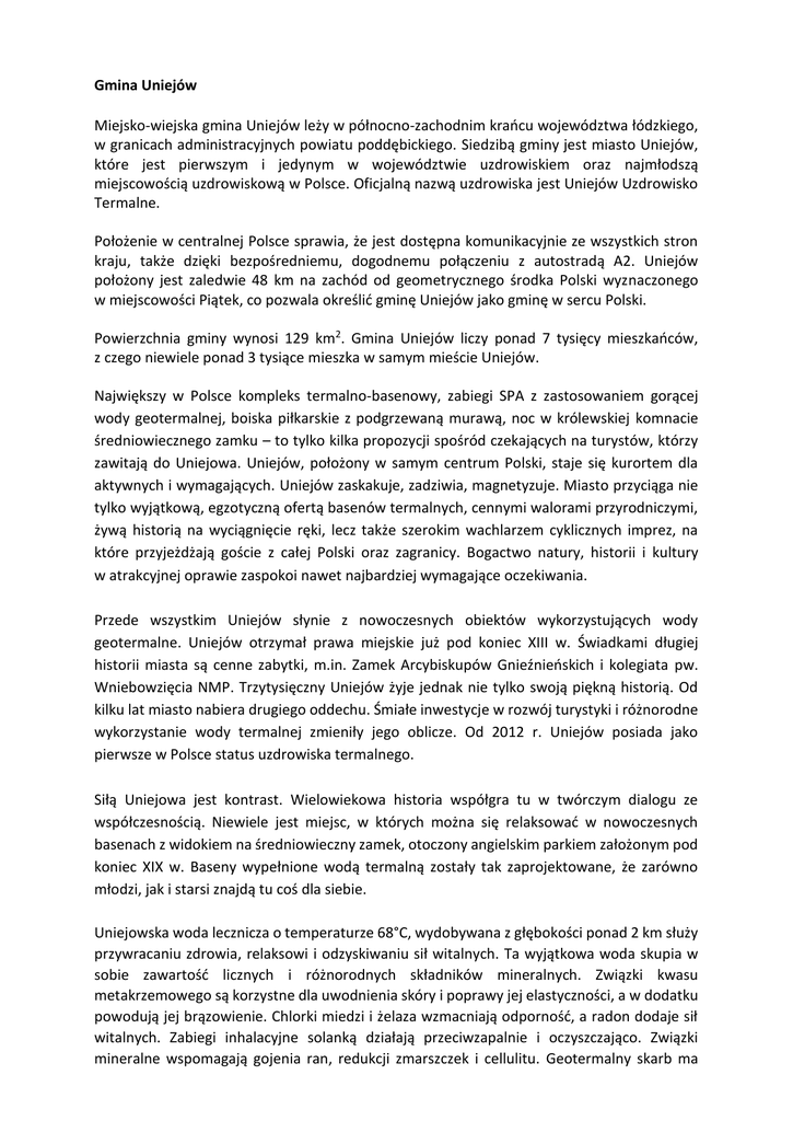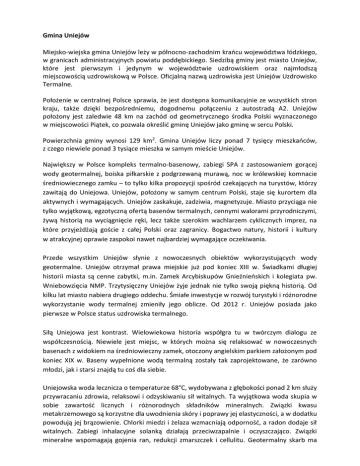 Gmina Uniejów Miejsko-wiejska gmina Uniejów leży w północno-zachodnim krańcu województwa łódzkiego, w granicach administracyjnych powiatu poddębickiego. Siedzibą gminy jest miasto Uniejów, które jest pierwszym i jedynym w województwie uzdrowiskiem oraz najmłodszą miejscowością uzdrowiskową w Polsce. Oficjalną nazwą uzdrowiska jest Uniejów Uzdrowisko Termalne. Położenie w centralnej Polsce sprawia, że jest dostępna komunikacyjnie ze wszystkich stron kraju, także dzięki bezpośredniemu, dogodnemu połączeniu z autostradą A2. Uniejów położony jest zaledwie 48 km na zachód od geometrycznego środka Polski wyznaczonego w miejscowości Piątek, co pozwala określić gminę Uniejów jako gminę w sercu Polski. Powierzchnia gminy wynosi 129 km2. Gmina Uniejów liczy ponad 7 tysięcy mieszkańców, z czego niewiele ponad 3 tysiące mieszka w samym mieście Uniejów. Największy w Polsce kompleks termalno-basenowy, zabiegi SPA z zastosowaniem gorącej wody geotermalnej, boiska piłkarskie z podgrzewaną murawą, noc w królewskiej komnacie średniowiecznego zamku – to tylko kilka propozycji spośród czekających na turystów, którzy zawitają do Uniejowa. Uniejów, położony w samym centrum Polski, staje się kurortem dla aktywnych i wymagających. Uniejów zaskakuje, zadziwia, magnetyzuje. Miasto przyciąga nie tylko wyjątkową, egzotyczną ofertą basenów termalnych, cennymi walorami przyrodniczymi, żywą historią na wyciągnięcie ręki, lecz także szerokim wachlarzem cyklicznych imprez, na które przyjeżdżają goście z całej Polski oraz zagranicy. Bogactwo natury, historii i kultury w atrakcyjnej oprawie zaspokoi nawet najbardziej wymagające oczekiwania. Przede wszystkim Uniejów słynie z nowoczesnych obiektów wykorzystujących wody geotermalne. Uniejów otrzymał prawa miejskie już pod koniec XIII w. Świadkami długiej historii miasta są cenne zabytki, m.in. Zamek Arcybiskupów Gnieźnieńskich i kolegiata pw. Wniebowzięcia NMP. Trzytysięczny Uniejów żyje jednak nie tylko swoją piękną historią. Od kilku lat miasto nabiera drugiego oddechu. Śmiałe inwestycje w rozwój turystyki i różnorodne wykorzystanie wody termalnej zmieniły jego oblicze. Od 2012 r. Uniejów posiada jako pierwsze w Polsce status uzdrowiska termalnego. Siłą Uniejowa jest kontrast. Wielowiekowa historia współgra tu w twórczym dialogu ze współczesnością. Niewiele jest miejsc, w których można się relaksować w nowoczesnych basenach z widokiem na średniowieczny zamek, otoczony angielskim parkiem założonym pod koniec XIX w. Baseny wypełnione wodą termalną zostały tak zaprojektowane, że zarówno młodzi, jak i starsi znajdą tu coś dla siebie. Uniejowska woda lecznicza o temperaturze 68°C, wydobywana z głębokości ponad 2 km służy przywracaniu zdrowia, relaksowi i odzyskiwaniu sił witalnych. Ta wyjątkowa woda skupia w sobie zawartość licznych i różnorodnych składników mineralnych. Związki kwasu metakrzemowego są korzystne dla uwodnienia skóry i poprawy jej elastyczności, a w dodatku powodują jej brązowienie. Chlorki miedzi i żelaza wzmacniają odporność, a radon dodaje sił witalnych. Zabiegi inhalacyjne solanką działają przeciwzapalnie i oczyszczająco. Związki mineralne wspomagają gojenia ran, redukcji zmarszczek i cellulitu. Geotermalny skarb ma także dobroczynny wpływ na leczenie chorób skóry, zwyrodnień stawów, stanów po zabiegach operacyjnych narządu ruchu. Uniejowska woda o mineralizacji 8 g/dm3 odznacza się zatem zdrowotnymi właściwościami, dzięki którym ma szansę rozwijać się uzdrowisko. Woda geotermalna w Uniejowie może być z powodzeniem wykorzystywana nie tylko w celach rekreacyjnych. Przy współpracy z Instytutem Ogrodnictwa w Skierniewicach trwają pionierskie w Polsce badania nad zastosowaniem solanki do produkcji ogórków kiszonych oraz soków warzywnych i owocowych. Uniejów to jednak nie tylko gorąca woda termalna. Osoby, które cenią sobie zróżnicowaną ofertę aktywnego wypoczynku, zostaną postawione przed trudnym wyborem. W piłkę nożną można tu zagrać nawet zimą – dzięki podgrzewaniu boisk wodą termalną trawa jest zielona na stadionie przez cały rok. Po tak intensywnym dniu przyda się odrobina relaksu i wyciszenia. Uniejów to przecież lokalizacja najlepszych resortów SPA – masaże i zabiegi koją ciało i dodają energii na kolejny dzień. Oferta hoteli w Uniejowie jest ceniona przede wszystkim za różnorodność: pozwala wybierać między nowoczesnymi obiektami o wysokim standardzie, ciepłem i przytulnością domowej atmosfery Zagrody Młynarskiej czy doniosłością oryginalnie urządzonych komnat Zamku Arcybiskupów Gnieźnieńskich… Hotele w Uniejowie przyciągają nie tylko komfortowymi warunkami, ale też oferują zabiegi z zakresu medycyny estetycznej, odnowy biologicznej, balneoterapii i rehabilitacji. Zaskakują także ekologicznymi i energooszczędnymi rozwiązaniami. Pierwsze w Polsce uzdrowisko termalne zaskakuje bogatą ofertą pokoi gościnnych. Gospodarze zapraszają do przytulnie urządzonych i dobrze wyposażonych wnętrz. Podczas całego pobytu oferują gościnne przyjęcie i domową atmosferę. W wielu miejscach można zamówić posiłki oraz zabiegi wellness i spa. Możesz też korzystać ze specjalnych zniżek do basenów termalnych. Uniejowscy restauratorzy z pasją i ze znawstwem podchodzą do swojej pracy. Odkrywają przed swoimi gośćmi zarówno smaki kuchni staropolskiej, jak i śródziemnomorskiej, tak więc każdy smakosz znajdzie w Uniejowie coś dla siebie. Wiedzę na temat historii miasta, zabytków, atrakcji turystycznych i wydarzeń w gminie Uniejów można zdobyć na oficjalnych stronach internetowych: 1. www.uniejow.pl 2. www.ekouniejow.pl 3. http://uniejow.gotopoland.eu/pl/turystyka/ 4. http://uniejow.gotopoland.eu/pl/biznes/ 5. www.geotermia-uniejow.pl 6. www.termyuniejow.pl 7. http://zamekwuniejowie.pl/ 8. http: