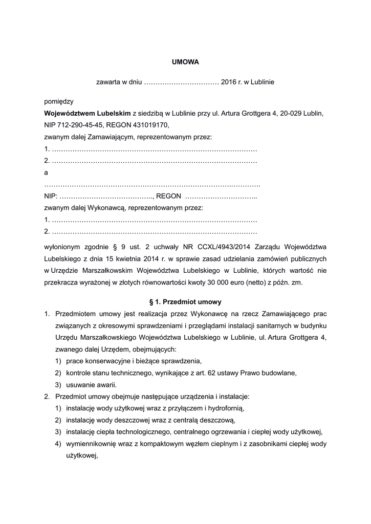 UMOWA zawarta w dniu …………………………… 2016 r. w Lublinie pomiędzy Województwem Lubelskim z siedzibą w Lublinie przy ul. Artura Grottgera 4, 20-029 Lublin, NIP 712-290-45-45, REGON 431019170, zwanym dalej Zamawiającym, reprezentowanym przez: 1. ……………………………………………………………………………… 2. ……………………………………………………………………………… a ……………………………………………………………………….…………. NIP: ………………………………….., REGON ………………………….. zwanym dalej Wykonawcą, reprezentowanym przez: 1. ……………………………………………………………………………… 2. ……………………………………………………………………………… wyłonionym zgodnie § 9 ust. 2 uchwały NR CCXL/4943/2014 Zarządu Województwa Lubelskiego z dnia 15 kwietnia 2014 r. w sprawie zasad udzielania zamówień publicznych w Urzędzie Marszałkowskim Województwa Lubelskiego w Lublinie, których wartość nie przekracza wyrażonej w złotych równowartości kwoty 30 000 euro (netto) z późn. zm. § 1. Przedmiot umowy 1. Przedmiotem umowy jest realizacja przez Wykonawcę na rzecz Zamawiającego prac związanych z okresowymi sprawdzeniami i przeglądami instalacji sanitarnych w budynku Urzędu Marszałkowskiego Województwa Lubelskiego w Lublinie, ul. Artura Grottgera 4, zwanego dalej Urzędem, obejmujących: 1) prace konserwacyjne i bieżące sprawdzenia, 2) kontrole stanu technicznego, wynikające z art. 62 ustawy Prawo budowlane, 3) usuwanie awarii. 2. Przedmiot umowy obejmuje następujące urządzenia i instalacje: 1) instalację wody użytkowej wraz z przyłączem i hydrofornią, 2) instalację wody deszczowej wraz z centralą deszczową, 3) instalację ciepła technologicznego, centralnego ogrzewania i ciepłej wody użytkowej, 4) wymiennikownię wraz z kompaktowym węzłem cieplnym i z zasobnikami ciepłej wody użytkowej, 5) instalację wody lodowej, bez agregatów wody lodowej i klimakonwektorów, 6) instalację ogrzewania podłogowego, 7) instalację glikolową odzysku ciepła, 8) instalację kanalizacji sanitarnej wraz z przyłączem i stacją podnoszenia ścieków, bez separatora substancji ropopochodnych, 9) instalację kanalizacji deszczowej wraz z przyłączem i ze zbiornikiem retencyjnym. 3. Szczegółowy zakres prac przy instalacjach określony został w opisie przedmiotu zamówienia będącego załącznikiem nr 1 do niniejszej umowy. 4. Dokumentację techniczną, o której mowa w ust. 2, Zamawiający udostępni Wykonawcy, w celu realizacji niniejszej umowy, z zastrzeżeniem określonym w § 4 pkt 6. § 2. Terminy realizacji 1. Niniejsza umowa zostaje zawarta do dnia 31 grudnia 2016 r. 2. Termin konserwacji i sprawdzeń określonych w § 1 ust 1 pkt 1 – w miesiącu wrześniu 2016 r., 3. Terminy kontroli stanu technicznego określonych w § 1 ust. 1 pkt 2: 1) pierwszy przegląd, w nieprzekraczalnym terminie, do dnia 31 maja 2016 r., 2) drugi przegląd, w nieprzekraczalnym terminie, do dnia 30 listopada 2016 r. § 3. Wymagania związane z realizacją umowy 1. Prace powinny być wykonywane w oparciu o obowiązujące przepisy i dokumentację techniczną, w tym: Prawo Budowlane, Prawo energetyczne, przepisy przeciwpożarowe i BHP, instrukcje eksploatacji, dokumentacje techniczno-ruchowe, projekty powykonawcze oraz wymagania gwarancyjne określone przez producentów urządzeń. 2. Wszelkie przeglądy muszą być zrealizowane przez osoby posiadające właściwe przygotowanie zawodowe, aktualne uprawnienia budowlane w branży sanitarnej oraz legitymujące się aktualnymi zaświadczeniami o przynależności do właściwej Izby Samorządu Zawodowego. 3. Przeglądy winny być zgłoszone przez Wykonawcę przynajmniej z tygodniowym wyprzedzeniem. 4. Czynności związane z umową Wykonawca może zrealizować po potwierdzeniu zgłoszenia oraz z udziałem przedstawiciela Zamawiającego. 5. Czynności wymagające wyłączenia dopływu wody i innych działań zakłócających pracę Urzędu, mogą być realizowane po godz.1700 w dni robocze lub w innych godzinach w dni wolne od pracy Urzędu tylko po uzyskaniu zgody od Zamawiającego i zawsze z udziałem przedstawiciela Zamawiającego. 6. Ze wszystkich czynności związanych ze sprawdzeniami lub przeglądami muszą być sporządzone odrębne protokoły podpisane przez upoważnionych przedstawicieli każdej ze stron umowy oraz dokonane wpisy w książkach eksploatacyjnych poszczególnych instalacji. Osoby upoważnione ze strony Zamawiającego: …………………………………………………………………………… …………………………………………………………………………… Osoby upoważnione ze strony Wykonawcy: …………………………………………………………………………… …………………………………………………………………………… 7. Wykonawca zobowiązany jest wykonywać przedmiot Umowy z należytą starannością, a w szczególności z poszanowaniem wszystkich zasad i warunków określonych w gwarancji udzielonej Zamawiającemu przez Generalnego Wykonawcę obiektu – firmę Budimex S.A., pod rygorem odpowiedzialności za wszystkie szkody wynikłe z tytułu nieprzestrzegania tych warunków. Kopia „Dokumentu gwarancji'' z dnia 16 listopada 2015 r. oraz kopia „Umowy na roboty budowlane”, która w § 12 i § 13 określa szczegółowe warunki gwarancji i rękojmi - stanowią załączniki nr 2 i 3 do niniejszej Umowy. 8. Jeżeli w trakcie przeglądów zostaną zauważone uszkodzenia lub innego rodzaju nieprawidłowości, fakt ten musi być odnotowany w protokole potwierdzającym sprawdzenie lub przegląd, a ponadto sporządzony, jako załącznik, protokół konieczności określający zakres techniczny, np. rodzaj usterki, przyczynę i 