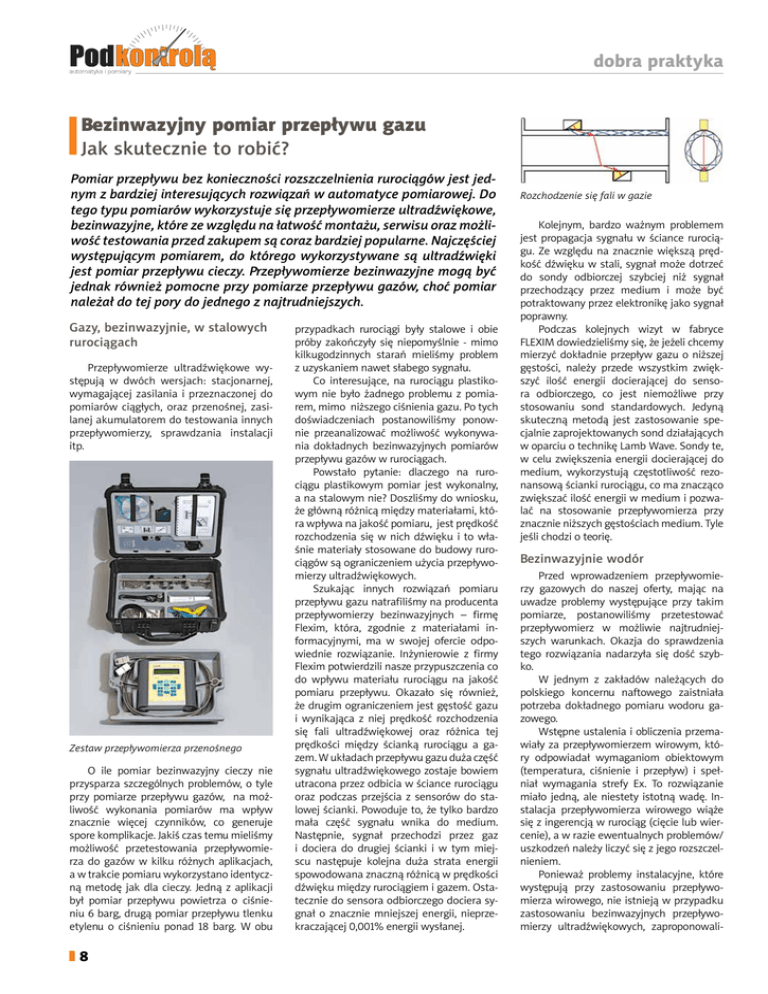 dobra praktyka Bezinwazyjny pomiar przepływu gazu Jak skutecznie to robić? Pomiar przepływu bez konieczności rozszczelnienia rurociągów jest jednym z bardziej interesujących rozwiązań w automatyce pomiarowej. Do tego typu pomiarów wykorzystuje się przepływomierze ultradźwiękowe, bezinwazyjne, które ze względu na łatwość montażu, serwisu oraz możliwość testowania przed zakupem są coraz bardziej popularne. Najczęściej występującym pomiarem, do którego wykorzystywane są ultradźwięki jest pomiar przepływu cieczy. Przepływomierze bezinwazyjne mogą być jednak również pomocne przy pomiarze przepływu gazów, choć pomiar należał do tej pory do jednego z najtrudniejszych. Gazy, bezinwazyjnie, w stalowych rurociągach Przepływomierze ultradźwiękowe występują w dwóch wersjach: stacjonarnej, wymagającej zasilania i przeznaczonej do pomiarów ciągłych, oraz przenośnej, zasilanej akumulatorem do testowania innych przepływomierzy, sprawdzania instalacji itp. Zestaw przepływomierza przenośnego O ile pomiar bezinwazyjny cieczy nie przysparza szczególnych problemów, o tyle przy pomiarze przepływu gazów, na możliwość wykonania pomiarów ma wpływ znacznie więcej czynników, co generuje spore komplikacje. Jakiś czas temu mieliśmy możliwość przetestowania przepływomierza do gazów w kilku różnych aplikacjach, a w trakcie pomiaru wykorzystano identyczną metodę jak dla cieczy. Jedną z aplikacji był pomiar przepływu powietrza o ciśnieniu 6 barg, drugą pomiar przepływu tlenku etylenu o ciśnieniu ponad 18 barg. W obu 8 przypadkach rurociągi były stalowe i obie próby zakończyły się niepomyślnie - mimo kilkugodzinnych starań mieliśmy problem z uzyskaniem nawet słabego sygnału. Co interesujące, na rurociągu plastikowym nie było żadnego problemu z pomiarem, mimo niższego ciśnienia gazu. Po tych doświadczeniach postanowiliśmy ponownie przeanalizować możliwość wykonywania dokładnych bezinwazyjnych pomiarów przepływu gazów w rurociągach. Powstało pytanie: dlaczego na rurociągu plastikowym pomiar jest wykonalny, a na stalowym nie? Doszliśmy do wniosku, że główną różnicą między materiałami, która wpływa na jakość pomiaru, jest prędkość rozchodzenia się w nich dźwięku i to właśnie materiały stosowane do budowy rurociągów są ograniczeniem użycia przepływomierzy ultradźwiękowych. Szukając innych rozwiązań pomiaru przepływu gazu natrafiliśmy na producenta przepływomierzy bezinwazyjnych – firmę Flexim, która, zgodnie z materiałami informacyjnymi, ma w swojej ofercie odpowiednie rozwiązanie. Inżynierowie z firmy Flexim potwierdzili nasze przypuszczenia co do wpływu materiału rurociągu na jakość pomiaru przepływu. Okazało się również, że drugim ograniczeniem jest gęstość gazu i wynikająca z niej prędkość rozchodzenia się fali ultradźwiękowej oraz różnica tej prędkości między ścianką rurociągu a gazem. W układach przepływu gazu duża część sygnału ultradźwiękowego zostaje bowiem utracona przez odbicia w ściance rurociągu oraz podczas przejścia z sensorów do stalowej ścianki. Powoduje to, że tylko bardzo mała część sygnału wnika do medium. Następnie, sygnał przechodzi przez gaz i dociera do drugiej ścianki i w tym miejscu następuje kolejna duża strata energii spowodowana znaczną różnicą w prędkości dźwięku między rurociągiem i gazem. Ostatecznie do sensora odbiorczego dociera sygnał o znacznie mniejszej energii, nieprzekraczającej 0,001% energii wysłanej. Rozchodzenie się fali w gazie Kolejnym, bardzo ważnym problemem jest propagacja sygnału w ściance rurociągu. Ze względu na znacznie większą prędkość dźwięku w stali, sygnał może dotrzeć do sondy odbiorczej szybciej niż sygnał przechodzący przez medium i może być potraktowany przez elektronikę jako sygnał poprawny. Podczas kolejnych wizyt w fabryce FLEXIM dowiedzieliśmy się, że jeżeli chcemy mierzyć dokładnie przepływ gazu o niższej gęstości, należy przede wszystkim zwiększyć ilość energii docierającej do sensora odbiorczego, co jest niemożliwe przy stosowaniu sond standardowych. Jedyną skuteczną metodą jest zastosowanie specjalnie zaprojektowanych sond działających w oparciu o technikę Lamb Wave. Sondy te, w celu zwiększenia energii docierającej do medium, wykorzystują częstotliwość rezonansową ścianki rurociągu, co ma znacząco zwiększać ilość energii w medium i pozwalać na stosowanie przepływomierza przy znacznie niższych gęstościach medium. Tyle jeśli chodzi o teorię. Bezinwazyjnie wodór Przed wprowadzeniem przepływomierzy gazowych do naszej oferty, mając na uwadze problemy występujące przy takim pomiarze, postanowiliśmy przetestować przepływomierz w możliwie najtrudniejszych warunkach. Okazja do sprawdzenia tego rozwiązania nadarzyła się dość szybko. W jednym z zakładów należących do polskiego koncernu naftowego zaistniała potrzeba dokładnego pomiaru wodoru gazowego. Wstępne ustalenia i obliczenia przemawiały za przepływomierzem wirowym, który odpowiadał wymaganiom obiektowym (temperatura, ciśnienie i przepływ) i spełniał wymagania strefy Ex. To rozwiązanie miało jedną, ale niestety istotną wadę. Instalacja przepływomierza wirowego wiąże się z ingerencją w rurociąg (cięcie lub wiercenie), a w razie ewentualnych problemów/ uszkodzeń należy liczyć się z jego rozszczelnieniem. Ponieważ problemy instalacyjne, które występują przy zastosowaniu przepływomierza wirowego, nie istnieją w przypadku zastosowaniu bezinwazyjnych przepływomierzy ultradźwiękowych, zaproponowali- dobra praktyka śmy Klientowi testy ultradźwiękowca na obiekcie. Argumentem jaki przekonał specjalistów zakładu był fakt, iż instalacja przepływomierza ultradźwiękowego odbywa się bez konieczności opróżniania rurociągu czy nawet zmniejszania ciśnienia medium. Co więc