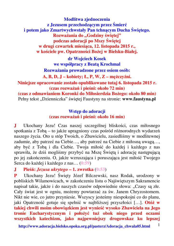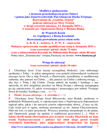 Modlitwa zjednoczenia z Jezusem przechodzącym przez Śmierć i potem jako Zmartwychwstały Pan tchnącym Ducha Świętego. Rozważania do „Godziny świętej” podczas adoracji po Mszy Świętej w drugi czwartek miesiąca, 12. listopada 2015 r., w kościele pw. Opatrzności Bożej w Bielsku-Białej. dr Wojciech Kosek we współpracy z Beatą Krochmal Rozważania prowadzone przez osiem osób: A, B, D, J – kobiety; Ł, P, W, Z – mężczyźni. Niniejsze opracowanie zostało opublikowane tutaj 6. listopada 2015 r. (czas rozważań i pieśni: około 72 min) (czas z odmawianiem Koronki do Miłosierdzia Bożego: około 80 min) Pełny tekst „Dzienniczka” świętej Faustyny na stronie: www.faustyna.pl Wstęp do adoracji (czas rozważań i pieśni: około 16 min) J Ukochany Jezu! Czas naszej szczególnej bliskości, czas miłosnego spotkania z Tobą – to jakże upragniony czas pośród różnorodnych wydarzeń naszego życia. Oto u stóp Twoich, o Zbawicielu, zasiedliśmy w modlitewnej zadumie, aby patrzeć na Ciebie…, aby patrzeć na Ciebie z miłosną uwagą…, aby być z Tobą i dla Ciebie. Twoja miłość do każdej i każdego z nas sprawiła, że dziś mogliśmy przybyć na Mszę Świętą i adorację następującą po jej zakończeniu. O, jakże wzruszająca i poruszająca jest miłość Twojego Serca do każdej i każdego z nas… (0:59) J Pieśń: Jezusa ukrytego – 1. zwrotka (0:53) P Ukochany Jezu! Święty Józef Bilczewski, nasz Rodak, urodzony w pobliskich Wilamowicach, w zakończeniu listu o Najświętszym Sakramencie napisał takie, jakże i do naszych czasów odpowiednie słowa: „Czasy są złe. Cały świat jest w ogniu, możemy powtarzać za św. Janem Chryzostomem. Nikt nie wie, co jutro przyniesie. Wszyscy jesteśmy niespokojni co do planu, jaki Opatrzność gotuje się spełnić w najbliższej przyszłości […]. Otóż w takiej chwili moim obowiązkiem jest wynieść wysoko Zbawiciela na Jego tronie Eucharystycznym i położyć tuż obok niego przed oczami wszystkich katechizm, jako najpewniejszy drogowskaz ku lepszej http://www.adoracja.bielsko.opoka.org.pl/pasterz/Adoracja_chwala05.html 1 przyszłości…”.1 O Jezu! Poruszeni słowami świętego, pragniemy w tej adoracji wysoko wynieść w sercach naszych Ciebie, przybyłego do nas w Najświętszej Eucharystii. Tobie śpiewamy pieśń miłości: (1:29) P Pieśń: Jezu w Hostii utajony – 1. zwrotka (0:41) D Najdroższy Jezu! Oto trwamy w eucharystycznym zjednoczeniu z Tobą po Mszy świętej. Nasz Rodak, święty Jan Paweł II, napisał w encyklice Ecclesia de Eucharistia (nr 25) tak: „Kult, jakim otaczana jest Eucharystia poza Mszą św., ma nieocenioną wartość w życiu Kościoła. Jest on ściśle związany ze sprawowaniem Ofiary eucharystycznej. Obecność Chrystusa pod świętymi postaciami, które są zachowane po Mszy św. – obecność, która trwa, dopóki istnieją postaci chleba i wina – wywodzi się ze sprawowania Ofiary i służy Komunii sakramentalnej i duchowej”. (1:00) D Pieśń: Serce Twe Jezu miłością goreje – 1. zwrotka (0:50) Z Ukochany Jezu! Mamy świadomość, że przyjmując Ciebie pod postaciami Przenajświętszej Hostii, dostępujemy niezwykłej łaski spotkania z samym Bogiem, Stwórcą Wszechświata, Zbawicielem całego rodzaju ludzkiego! To rzeczywiście niezwykły dar, nadzwyczajne obdarowanie… Pragniemy wyznać, że jednak nie zawsze zauważamy, że tego Daru dostępujemy pod sam koniec liturgii eucharystycznej, co też powinno stać się dla nas okazją do trwania w modlitewnej adoracji wobec Ciebie także po zakończeniu Mszy Świętej. Dziś zatem z całego serca przepraszamy Ciebie, o Panie, za zbyt pospieszne opuszczanie Ciebie, przybyłego w Komunii Świętej. (1:09) Z Pieśń: Jezusa ukrytego – 2. zwrotka (0:53) A Miłość wobec Ciebie, o Jezu, i wobec Twojej Matki Maryi, pragnę teraz wyznać słowami świętej Faustyny: „Dziękuję Ci, Oblubieńcze mój najukochańszy, za godność, którą mi darowałeś, a szczególnie za herby królewskie, które mnie od dziś zdobią, a których nawet aniołowie nie mają, to jest: krzyż, miecz i cierniowa korona. Ale, Jezu mój, ponad wszystko dziękuję Ci za Serce Twoje. – Ono mi wystarcza za wszystko. Matko Boga, Maryjo Najświętsza, Matko moja, Ty w szczególniejszy sposób teraz jesteś Matką moją, a to dlatego, że Syn Twój ukochany jest Oblubieńcem moim, a więc jesteśmy oboje dziećmi Twymi. Ze względu na Syna musisz mnie kochać. Maryjo, Matko moja najdroższa, kieruj moim życiem 1 J. Bilczewski, Listy, t. 1, s. 101. Cytowane za: J. Wołczański (redaktor), Na ścieżkach modlącego się Arcypasterza. Fragmenty z pism Sługi Bożego Józefa Bilczewskiego, Arcybiskupa Metropolity Lwowskiego ob. łac., Lwów 2000, s. 29-30. http://www.adoracja.bielsko.opoka.org.pl/pasterz/Adoracja_chwala05.html 2 wewnętrznym, aby ono było miłe Synowi Twojemu (Dzienniczek, nr 240). (1:23) A Pieśń: Matko Najświętsza do Serca Twego – 1. zwrotka (0:34) W Ukochany Zbawicielu! Święty Jan Paweł II tak napisał w encyklice Ecclesia de Eucharistia (nr 25) o spotkaniu z Tobą: „Pięknie jest zatrzymać się z Nim i jak umiłowany uczeń oprzeć głowę na Jego piersi (por. J 13,25), poczuć dotknięcie nieskończoną miłością Jego Serca. Jeżeli chrześcijaństwo ma się wyróżniać w naszych czasach przede wszystkim «sztuką modlitwy», jak nie odczuwać odnowionej potrzeby dłuższego zatrzymania się przed Chrystusem obecnym w Najświętszym Sakramencie na duchowej rozmowie, na cichej adoracji w postawie pełnej miłości? Ileż to razy, moi drodzy Bracia i Siostry, przeżywałem to doświadczenie i otrzymałem dzięki niemu siłę, pociechę i wsparcie!”. (1:14) W Pieśń: Serce Twe Jezu miłością goreje – 2. zwrotka (0:50) B Święta Faustyna od Najświętszego Sakramentu jest dla nas wzorem, jak miłować Ciebie, o Jezu. Miłość swojego serca święta tak wyznawała Tobie, o Ukoch
