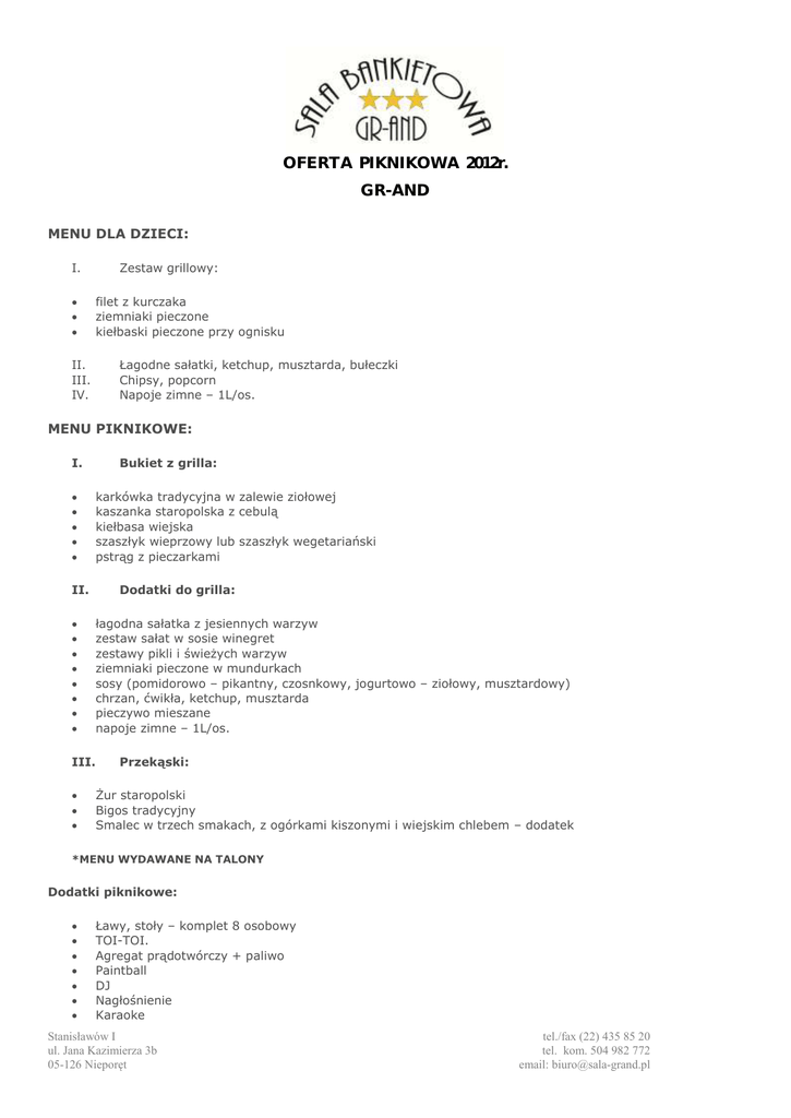 OFERTA PIKNIKOWA 2012r. GR-AND MENU DLA DZIECI: I. II. III. IV. Zestaw grillowy: filet z kurczaka ziemniaki pieczone kiełbaski pieczone przy ognisku Łagodne sałatki, ketchup, musztarda, bułeczki Chipsy, popcorn Napoje zimne – 1L/os. MENU PIKNIKOWE: I. II. III. Bukiet z grilla: karkówka tradycyjna w zalewie ziołowej kaszanka staropolska z cebulą kiełbasa wiejska szaszłyk wieprzowy lub szaszłyk wegetariański pstrąg z pieczarkami Dodatki do grilla: łagodna sałatka z jesiennych warzyw zestaw sałat w sosie winegret zestawy pikli i świeżych warzyw ziemniaki pieczone w mundurkach sosy (pomidorowo – pikantny, czosnkowy, jogurtowo – ziołowy, musztardowy) chrzan, ćwikła, ketchup, musztarda pieczywo mieszane napoje zimne – 1L/os. Przekąski: Żur staropolski Bigos tradycyjny Smalec w trzech smakach, z ogórkami kiszonymi i wiejskim chlebem – dodatek *MENU WYDAWANE NA TALONY Dodatki piknikowe: Ławy, stoły – komplet 8 osobowy TOI-TOI. Agregat prądotwórczy + paliwo Paintball DJ Nagłośnienie Karaoke Stanisławów I ul. Jana Kazimierza 3b 05-126 Nieporęt tel./fax (22) 435 85 20 tel. kom. 504 982 772 email: [email protected] Zespoły muzyczne, tradycyjne i regionalne Bilard 8 ft.(stół klubowy) Stół turniejowy 9 ft. Piłkarzyki stołowe Dart Loty pokazowe helikopterem Pokaz barmański - Show i degustacja drinków ok. 60 min. Firewalking- warsztaty chodzenia po ogniu Fire Show – tancerze ognia wykonują skomplikowane akrobacje za pomocą specjalnych akcesoriów - 4 tancerzy ognia – stroje, makijaż, + podkład muzyczny + nagłośnienie Strzelanie do tarcz full opcja: ( 4 wiatrówki – strzelanie do tarcz, 3 łuki – strzelanie do słomianych tarcz, 2 proce sportowe – strzelanie do kaczek) Samba – Andre: Show w piórach + nauka tańca ok. 1 godz. – 1.30 Michał Niemiec I. II. III. Michał + 3 tancerki + tancerz (ekipa z Jaka to melodia) Dorota Tomas Michał + 2 tancerki Michał – solo Włoski wieczór bądź mieszany z latynoskimi. Gaik zespół folklorystyczny Pokaz walki białą bronią z dialogiem Wróżka Pokaz barmański (show i degustacja drinków, czas trwania 2 godziny) Turniej Sumo Byk mechaniczny ”Rodeo” Euro bungy Ściana wspinaczkowa (5.6 m) Fajerwerki Ambulans medyczny Autokary, minibus Ochrona – patrol dwuosobowy *Ceny nie zawierają podatku VAT. Alkohole: Wina Mołdawskie Piwo Żywiec beczka 30L lub 50L Każdy rodzaj wódki *Inne alkohole według zamówienia klienta DODATKOWE ATRAKCJE KULINARNE: Stół wiejski: kiełbasy, kaszanki, salcesony, pasztety, bigos, chleb wiejski, smalec w trzech smakach, ogórki kiszone, siwucha x 2 but. po 0,5L. - stół wiejski można wzbogacać o udziec wieprzowy lub prosiaka w całości Stół myśliwski: udziec z dzika, kiełbasy z sarny i dzika, pasztet z zająca, bażant w pierzu, comber z sarny, szynka z jelenia, grzyby, żurawina, galaretka z bażanta Stół śródziemnomorski: ośmiornica, raki, małże, kalmary, krewetki, kraby, łosoś marynowany Stół sushi Sushi Live – Kucharz przez 4 godziny przygotowuje na żywo dania, w trakcie pokazu przedstawiana jest historia Japońskiej tradycji sushi oraz informacje o używanych produktach i serwowanych daniach. Stanisławów I ul. Jana Kazimierza 3b 05-126 Nieporęt tel./fax (22) 435 85 20 tel. kom. 504 982 772 email: [email protected] Stół grecki: krem z ikry dorsza, jogurt grecki, ostra pasta serowa, mus z bakłażanów, sałatka z owoców morza, liście winogron z mięsem i ziołami, panierowany kozi ser, koktajl z krewetek, mięsne kuleczki z czosnkiem, ośmiornica w oliwie i occie winnym, marynowana papryka z serem feta, wybór oliwek, pita Deska dzikiego ptactwa Ryba w całości (jesiotr, łosoś, sum) – ok. 3-4kg Kosz ryb prosto z wędzarni Indyk w całości Przygotowywanie dań przez kucharzy na sali (polędwica wołowa, krewetki, polędwiczki wieprzowe, polędwiczki drobiowe, makarony, sosy, dodatki , 1 kucharz na 100 os.) Bażant w pierzu Prosię pieczone w całości z kaszą gryczaną i surówką wiejską Dzik z kaszą gryczaną pieczony Jagnię pieczone z białą kaszą gryczaną Udziec wieprzowy pieczony w całości z ziemniakami po polsku i bukietem warzyw ATRAKCJE DLA DZIECI: I. Zjeżdżalnie: Samuraj Titanic Pirat Winnetou Dżungla Bajdocja II. Zamki do skakania Samuraj Saloon Żyrafa Merlin Mini Jeep Pajace III. Urządzenia dla dzieci Tajemniczy ogród Zestaw dla przedszkolaków Kącik dziecięcy Basen(z piłkami) Rycerz Statek Piracki Basen Dżungla Basen Dynia Kolejka elektryczna Góra Kilimandżaro Karuzela Dino UWAGI: menu jest tylko propozycją i na Państwa życzenie zawsze może ulec zmianie parking jest nie strzeżony tzn. że Gr-and nie ponosi odpowiedzialności za auto i rzeczy w nim pozostawione, parking jest nadzorowany przez pracownika i zamykany na noc. ostateczną liczbę uczestników należy podać nie później niż na 7 dni przed pobytem zabrania się wnoszenia własnego alkoholu na teren sali bankietowej Gr-and bez uprzednich ustaleń Stanisławów I ul. Jana Kazimierza 3b 05-126 Nieporęt tel./fax (22) 435 85 20 tel. kom. 504 982 772 email: [email protected]