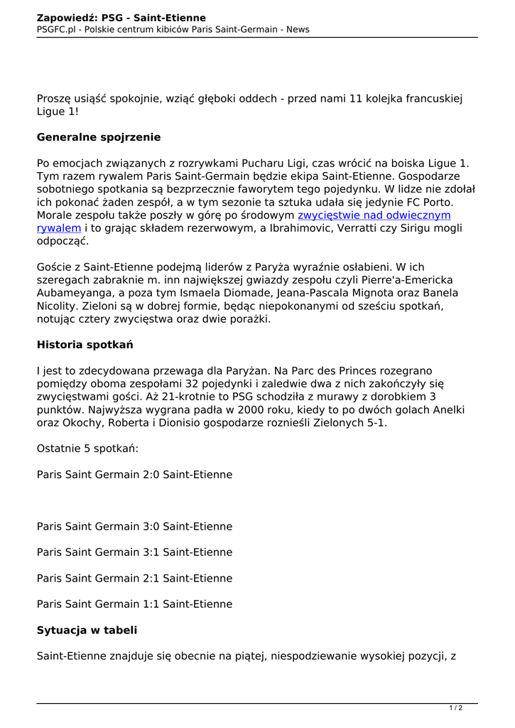 Zapowiedź: PSG - Saint-Etienne PSGFC.pl - Polskie centrum kibiców Paris Saint-Germain - News Proszę usiąść spokojnie, wziąć głęboki oddech - przed nami 11 kolejka francuskiej Ligue 1! Generalne spojrzenie Po emocjach związanych z rozrywkami Pucharu Ligi, czas wrócić na boiska Ligue 1. Tym razem rywalem Paris Saint-Germain będzie ekipa Saint-Etienne. Gospodarze sobotniego spotkania są bezprzecznie faworytem tego pojedynku. W lidze nie zdołał ich pokonać żaden zespół, a w tym sezonie ta sztuka udała się jedynie FC Porto. Morale zespołu także poszły w górę po środowym zwycięstwie nad odwiecznym rywalem i to grając składem rezerwowym, a Ibrahimovic, Verratti czy Sirigu mogli odpocząć. Goście z Saint-Etienne podejmą liderów z Paryża wyraźnie osłabieni. W ich szeregach zabraknie m. inn największej gwiazdy zespołu czyli Pierre'a-Emericka Aubameyanga, a poza tym Ismaela Diomade, Jeana-Pascala Mignota oraz Banela Nicolity. Zieloni są w dobrej formie, będąc niepokonanymi od sześciu spotkań, notując cztery zwycięstwa oraz dwie porażki. Historia spotkań I jest to zdecydowana przewaga dla Paryżan. Na Parc des Princes rozegrano pomiędzy oboma zespołami 32 pojedynki i zaledwie dwa z nich zakończyły się zwycięstwami gości. Aż 21-krotnie to PSG schodziła z murawy z dorobkiem 3 punktów. Najwyższa wygrana padła w 2000 roku, kiedy to po dwóch golach Anelki oraz Okochy, Roberta i Dionisio gospodarze roznieśli Zielonych 5-1. Ostatnie 5 spotkań: Paris Saint Germain 2:0 Saint-Etienne Paris Saint Germain 3:0 Saint-Etienne Paris Saint Germain 3:1 Saint-Etienne Paris Saint Germain 2:1 Saint-Etienne Paris Saint Germain 1:1 Saint-Etienne Sytuacja w tabeli Saint-Etienne znajduje się obecnie na piątej, niespodziewanie wysokiej pozycji, z 1/2 Zapowiedź: PSG - Saint-Etienne PSGFC.pl - Polskie centrum kibiców Paris Saint-Germain - News dorobkiem 15 punktów. To zasługa dobrej passy, jaką kontynuuje zespół od pięciu kolejek. Początki nie były takie dobre, gdyż zaczęli od dwóch porażek oraz ledwie jednego zwycięstwa. Celem zespołu na ten sezon jest awans do Europejskich Pucharów. Jeśli zdołają uniknąć plagi kontuzji, jest to możliwe do osiągnięcia. PSG usadowił się na fotelu lidera i nie odda go tak łatwo, szczególnie że OM rozegrało jedno spotkanie mniej z powodu przełożonego meczu z OL. Paryżanie mają najlepszy bilans bramkowy ze wszystkich drużyn, wyprzedzając o jedną bramkę zajmujące drugie miejsce Saint-Etienne. Autor: kublu 2/2 Powered by TCPDF (www.tcpdf.org)