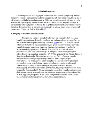 1 Jałtańskie organy Chociaż podczas wakacyjnych wędrówek po Krymie spotykamy dawne kościoły, obecnie zamienione na kina, magazyny lub hale sportowe, to nie ma w nich żadnego śladu istnienia organów. Nikt nie potrafi powiedzieć, czy w tych kościołach były organy lub co z nimi się stało. Obecnie na Krymie istnieje 4 instrumenty i to wyłącznie w Jałcie. Są to jednak instrumenty zupełnie nowe: w kościele dominikanów, w cerkwi ormiańskiej i w szkole muzycznej oraz w sali organowej (Organny Zał) w Liwadii [1]. 1. Organy w kościele dominikanów Neogotycki kościół został zbudowany na początku XX w. przez katolicką wspólnotę. Prawdopodobnie nie było tam jeszcze organów, bo nie dokończono w pełni budowy kościoła. [2] Po 1937 r. kościół został odebrany katolikom z uzasadnieniem, że grozi mu zawalenie z powodu wcześniejszego trzęsienia ziemi na Krymie. Mimo tego w kościele urządzono halę sportową. W latach 80-tych XX w. kościół został przeznaczony na salę koncertową i w związku z tym zarząd miejski zdecydował się na zakup organów. W 1988 r. czeska firma Rieger-Kloss z Karniova zbudowała, 34-głosowe organy, op. 3611. Organy zostały umieszczone na miejscu głównego ołtarza. Szafa organów jest bezstylowa. Na podbudowie szały znajduje się dwupiętrowy prospekt, Jego dolna część jest złożona z czterech płaszczyzn piszczałkowych zwieńczonych jakby trzema dwuspadzistymi daszkami. Skrajne płaszczyzny prospektu zawierają drewniane, kryte i pomalowane na biało piszczałki Pryncypału 8'. Na zwieńczeniu prospektu zostały umieszczone dwie płaszczyzny piszczałkowe zwieńczone analogicznymi daszkami jak w niższej partii prospektu. Cała szafa jest pomalowana na kolor biały z zachowaniem naturalnej barwy drewna na zadaszeniach. 2 Klawiatury organów wbudowano w przednią ścianę szafy. Głosy organowe we wnętrzu szafy zostały rozmieszczone na trzech piętrach: manuał I - na II piętrze, manuał II - na III piętrze, manuał III - na I piętrze (w szafie ekspresyjnej) i sekcja pedału z tyłu szafy. Organy mają następującą dyspozycję: Man. I (C-a3) Man. II (C-a3) Gedeckt-pommer 16' Principal 8' Rohrflöte 8' Weidenpfeife 8' Oktave 4' Blockflöte 4' Hohlflöte 2' Mixtur 5 x 1 1/3' Trompete 8' Gedeckt 8' Gemshorn 8' Principal 4' Gedeckt-flöte 4' Oktave 2' Quinta 1 1/3' Sesquialtera 2 x 2 2/3' Krumhorn 8' (Tremolo) Man. III (C-a3) Ped. (C-a1) Koppelflöte 8' Principal 4' Nachthorn 4' Nasard 2 2/3' Querflöte 2' Kontrabass 16' Subbass 16' Pommer trans. 16' Rauschpfeife 4 x 2 2/3' 3 Terz 1 3/5' Hellflöte 1' Plein jeu 4 x 2' Oboe 8' (Tremolo) Principal 8' Bassflöte 8' Tenoroktave 4' Posaune 16' Połączenia między sekcjami, registry zbiorowe: Pl.1, Pl. 2, Tutti, 4 wolne kombinacje dla manuałów i 2 wolne kombinacje dla pedału. Traktura mechaniczna dla manuałów, elektromagnetyczna dla pedału. Wiatrownice zasuwowo-klapowe obsługiwane elektromagnesami. Połączenie pomiędzy manuałami mechaniczne włączane elektromagnesem. Połączenia manuałów z pedałem, registry zbiorowe i wolne kombinacje działają przy pomocy elektromagnesów. Jest to dobrze brzmiący instrument. Każda sekcja wykazuje samodzielność pod względem brzmienia. Należy docenić logicznie ułożoną dyspozycję każdej z sekcji. Pewne zastrzeżenia budzi dyspozycja III manuału, umieszczonego w szafie ekspresyjnej, a to ze względu na styl. Z reguły głosy z szafy ekspresyjnej pomagają w wykonywaniu takich utworów, które wymagają stosowania crescendo i decrescendo. Zestaw umieszczonych tam głosów nie przypomina typowych dyspozycji, czyli takich które stosuje się w szafie ekspresyjnej, tzn. - z większą liczbą głosów 8-stopowych, z głosami smyczkowymi z nisko brzmiącymi głosami mieszanymi Wydaje się, że o układzie dyspozycji III manuału zadecydował brak miejsca dla 8-stopowych otwartych piszczałek. Mimo tego, nie musiała tam być aż taka liczba głosów brzmiących wysoko. Podobnie brak miejsca wpłynął na zastosowanie w Pryncypale 8' I manuału, co rzadko się spotyka, 14 drewnianych krytych piszczałek o dość wąskiej menzurze Pryncypał został jednak tak zintonowany, że nie słychać przejścia od piszczałek drewnianych do metalowych. Obecnie organy są wykorzystywane przede wszystkim do liturgii. Natomiast w sezonie wakacyjnym w kościele odbywają się prawie codziennie recitale organowe lub inne koncerty z towarzyszeniem organów. Wakacyjne koncerty cieszą się dużym zainteresowaniem. 2. Organy w Liwadii (Sala Organowa - Organny Zał) W latach 80-tych XX w. Włodzimierz Anatoljewicz Chromczenko [3] adaptował na salę koncertową pomieszczenie dawnej elektrowni pałacowej. Tutaj właśnie zbudował 64-głosowe organy o 4 manuałach z pedałem. W informatorach stale powtarza się, że organy w Liwadii mają aż 4600 piszczałek. Szafa organów została umieszczona jakby na chórze muzycznym, a na balustradzie chóru znajdują się jeszcze dwa bliźniacze pozytywy. Pod względem 4 architektury i zdobnictwa główny prospekt i pozytywy nawiązują do XIXwiecznych neostylów (neobaroku i neoklasycyzmu). Na froncie głównego prospektu, w połowie wysokości, pomiędzy centralnymi płaszczyznami piszczałkowymi zostały umieszczone poziomo tuby językowego głosu Trompetu. Traktura manuałów jest mechaniczna. Natomiast registry głosowe, registry zbiorowe, wszelkie połączenia i tzw. zecer zostały wykonane z zastosowaniem elektromagnesów wspomagających i zaawansowanej elektroniki. Dyspozycja organów[4]: Man. I (C-a3) Man. II (C-a3) Man. III (C-a3) Rohrpommer 16' Praestant 8' Rohrflöte 8' Gemshorn 8' Oktave 4' Spitzflote 4' Quinte 2 2/3' Oktave 2' Hohlflöte 2' Cornett 5 x Mixtur 4x 2' Zimbel 3x 2/3' Fagot 16' Trompere 8' Gedeckt 8' Quintadena 8' Salizional 8' Prinzipal 4' Rohrflöte 4' Oktave 2' Waldflöte 2' Quinte 1 1/3' Oktave 1' Sesquialtera 2x Scharff 4x 1' Rankett 16' Krumhorn 8' (Tremolo) Bordun 16' 