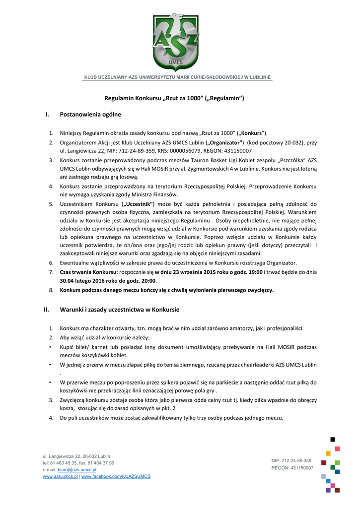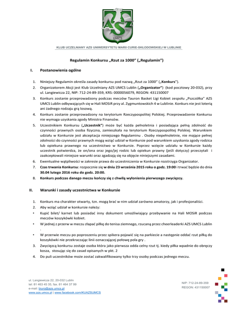 KLUB UCZELNIANY AZS UNIWERSYTETU MARII CURIE-SKŁODOWSKIEJ W LUBLINIE Regulamin Konkursu „Rzut za 1000” („Regulamin”) I. Postanowienia ogólne 1. Niniejszy Regulamin określa zasady konkursu pod nazwą „Rzut za 1000” („Konkurs”). 2. Organizatorem Akcji jest Klub Uczelniany AZS UMCS Lublin („Organizator”) (kod pocztowy 20-032), przy ul. Langiewicza 22, NIP: 712-24-89-359, KRS: 0000056079, REGON: 431150007 3. Konkurs zostanie przeprowadzony podczas meczów Tauron Basket Ligi Kobiet zespołu „Pszczółka” AZS UMCS Lublin odbywających się w Hali MOSiR przy al. Zygmuntowskich 4 w Lublinie. Konkurs nie jest loterią ani żadnego rodzaju grą losową. 4. Konkurs zostanie przeprowadzony na terytorium Rzeczypospolitej Polskiej. Przeprowadzenie Konkursu nie wymaga uzyskania zgody Ministra Finansów. 5. Uczestnikiem Konkursu („Uczestnik”) może być każda pełnoletnia i posiadająca pełną zdolność do czynności prawnych osoba fizyczna, zamieszkała na terytorium Rzeczypospolitej Polskiej. Warunkiem udziału w Konkursie jest akceptacja niniejszego Regulaminu . Osoby niepełnoletnie, nie mające pełnej zdolności do czynności prawnych mogą wziąć udział w Konkursie pod warunkiem uzyskania zgody rodzica lub opiekuna prawnego na uczestnictwo w Konkursie. Poprzez wzięcie udziału w Konkursie każdy uczestnik potwierdza, że on/ona oraz jego/jej rodzic lub opiekun prawny (jeśli dotyczy) przeczytali i zaakceptowali niniejsze warunki oraz zgadzają się na objęcie niniejszymi zasadami. 6. Ewentualne wątpliwości w zakresie prawa do uczestniczenia w Konkursie rozstrzyga Organizator. 7. Czas trwania Konkursu: rozpocznie się w dniu 23 września 2015 roku o godz. 19:00 i trwać będzie do dnia 30.04 lutego 2016 roku do godz. 20:00. 8. Konkurs podczas danego meczu kończy się z chwilą wyłonienia pierwszego zwycięzcy. II. Warunki i zasady uczestnictwa w Konkursie 1. Konkurs ma charakter otwarty, tzn. mogą brać w nim udział zarówno amatorzy, jak i profesjonaliści. 2. Aby wziąć udział w konkursie należy: • Kupić bilet/ karnet lub posiadać inny dokument umożliwiający przebywanie na Hali MOSiR podczas meczów koszykówki kobiet. • W jednej z przerw w meczu złapać piłkę do tenisa ziemnego, rzucaną przez cheerleaderki AZS UMCS Lublin . • W przerwie meczu po poproszeniu przez spikera pojawić się na parkiecie a następnie oddać rzut piłką do koszykówki nie przekraczając linii oznaczającej połowę pola gry . 3. Zwycięzcą konkursu zostaje osoba która jako pierwsza odda celny rzut tj. kiedy piłka wpadnie do obręczy kosza, stosując się do zasad opisanych w pkt. 2 4. Do puli uczestników może zostać zakwalifikowany tylko trzy osoby podczas jednego meczu. ul. Langiewicza 22, 20-032 Lublin tel: 81 463 45 35, fax. 81 464 37 99 e-mail: [email protected] www.azs.umcs.pl | www.facebook.com/KUAZSUMCS NIP: 712-24-89-359 REGON: 431150007 KLUB UCZELNIANY AZS UNIWERSYTETU MARII CURIE-SKŁODOWSKIEJ W LUBLINIE III. Nagrody, zasady przyznawania nagród, wydanie nagród 1. Nagrodą w konkursie jest 1000 zł. 2. Organizator zastrzega, że nagroda może zostać podwyższona. 3. Organizator nie przewiduje nagród dla uczestników, którzy nie oddali celnego rzutu. 4. Nagroda obniżona zostanie o kwotę podatku dochodowego w wysokości 10% zgodnie z z art. 30 ust.1 pkt 2 ustawy o podatku dochodowym od osób fizycznych. IV. Prawa do wykorzystania wizerunku 1. Organizator ma prawo do nieodpłatnego wykorzystania utrwalonego w formie fotografii lub zapisu wideo wizerunku Uczestnika, na co Uczestnik wyraża zgodę. 2. Uczestnik udziela Organizatorowi nieodpłatnej licencji na wykorzystanie utrwalonego wizerunku na następujących polach eksploatacji: a) Utrwalanie i zwielokrotnienie jakąkolwiek znaną techniką oraz rozpowszechnianie w dowolnej formie; b) Udostępnianie sponsorom oraz oficjalnym partnerom Konkursu egzemplarza lub kopii, na której utrwalono wizerunek, w celu wykorzystania do promocji sponsora lub oficjalnego partnera w kontekście jego udziału w Konkursie; c) Wprowadzenie do pamięci komputera i/lub do sieci multimedialnej i/lub sieci Internet; d) Zwielokrotnianie poprzez zapis utrwalonego wizerunku na dowolnych nośnikach i materiałach; e) Publiczne wystawienie, wyświetlenie, odtworzenie oraz nadawanie i reemitowanie, a także publiczne udostępnianie w taki sposób, aby każdy mógł mieć do niego dostęp w miejscu i w czasie przez siebie wybranym. f) Zamieszczanie i publikowanie w prasie, na stronach internetowych, plakatach i bilbordach, serwisach społecznościowych, forach oraz innych nośnikach i materiałach o charakterze informacyjnym, promocyjnym lub marketingowym itp. itd. (materiały drukowane, reklamowe, inne) g) Emitowanie w przekazach telewizyjnych i radiowych 3. Organizator zastrzega sobie prawo do udzielenia sublicencji na wykorzystanie utrwalonego wizerunku Uczestnika oficjalnym partnerom oraz sponsorom Konkursu. V. Postanowienia końcowe 1. Regulamin dostępny jest do wglądu w siedzibie Organizatora oraz na Stronie. 2. Niniejszy Regulamin wchodzi w życie w chwili rozpoczęcia Konkursu. 3. Treść Regulaminu może ulec zmianie w czasie trwania Konkursu. Ewentualne Zmiany zostaną ogłoszone na Stronie. 4. W sprawach nieuregulowanych w Regulaminie zastosowanie mają odpowiednie przepisy Kodeksu cywilnego. ul. Langiewicza 22, 20-032 Lublin tel: 81 463 45 35, fax. 81 464 37 99 e-mail: [email protected] www.azs.umcs.pl | www.facebook.com/KUAZSUMCS NIP: 712-24-89-359 REGON: 431150007 KLUB UCZELNIANY AZS UNIWERSYTETU MARII CURIE-SKŁODOWSKIEJ W LUBLINIE 5. Naruszenie przez Uczestnika któregokolwiek z postanowień niniejszego Regulaminu, upoważnia Organizatora do wyłączenia Uczestnika z Konkursu oraz powoduje utratę prawa do Nagrody, nawet w przypadku spełnienia innych wymagań przewidzianych postanowieniami niniejszego regulaminu. 6. Ewentualne spory związane z Konkursem będą rozstrzygane przez sąd właściwy dla