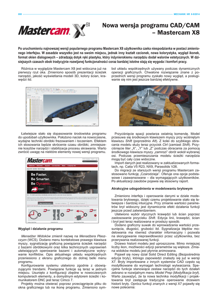 000 MECHANIK NR 8-9/2014 Nowa wersja programu CAD/CAM – Mastercam X8 Po uruchomieniu najnowszej wersji popularnego programu Mastercam X8 użytkownika czeka niespodzianka w postaci zmienionego interfejsu. W zasadzie wszystko jest na swoim miejscu, jednak inny kształt czcionek, nowa kolorystyka, wygląd ikonek, format okien dialogowych – zdradzają dotyk ręki plastyka, który inżynierskiemu narzędziu dodał walorów estetycznych. W dzisiejszych czasach obok tradycyjnie rozwijanej funkcjonalności coraz bardziej istotne stają się wygoda i komfort pracy. Różnica w wyglądzie Mastercam X8 jest widoczna już na pierwszy rzut oka. Zmieniono sposób prezentacji ścieżek narzędzi, jakość wyświetlania modeli 3D, kolory ścian, krawędzi itd. bol układu współrzędnych używany podczas dynamicznych operacji graficznych. Chwalone rozwiązanie znane z poprzednich wersji programu zyskało nowy wygląd, a posługiwanie się nim jest jeszcze bardziej efektywne. Łatwiejsze stało się dopasowanie środowiska programu do upodobań użytkownika. Położono nacisk na nowoczesne, wydajne techniki obróbki frezowaniem i toczeniem. Efektem ich stosowania będzie skrócenie czasu obróbki, zmniejszenie kosztów narzędzi i stabilizacja procesu skrawania. Warto zwrócić uwagę na niektóre elementy nowej wersji programu. Przyciśnięcie spacji powtarza ostatnią komendę. Model przesuwa się środkowym klawiszem myszy przy wciśniętym klawiszu Shift (poprzednio Alt). Z kolei do szybkiego obracania modelu służy teraz przycisk Ctrl (zamiast Shift). Przyciśnięcie liter „X”, „Y” lub „Z” podczas obracania za pomocą środkowego klawisza myszy „zamrozi” obrót wokół wybranej osi. Podczas przemieszczania modelu ścieżki narzędzia mogą być cały czas widoczne. Import danych jest realizowany w zaktualizowanych formatach, np. Catia V5 R23, NX9, Parasolids V26. Do migracji ze starszych wersji programu Mastercam zastosowano funkcję „Czarodzieja”. Oferuje ona opcje podstawowe i zaawansowane – dla wymagających użytkowników. Po aktualizacji zasobów pojawia się stosowny raport. Atrakcyjne udogodnienia w modelowaniu bryłowym Wygląd i działanie programu Menadżer Widoków zmienił nazwę na Menadżera Płaszczyzn (WCS). Dodano menu kontekstowe prawego klawisza myszy, sygnalizację graficzną powiązania ścieżek narzędzi z bazami obróbkowymi oraz kilka technicznych usprawnień ułatwiających operowanie bazami i automatyczne wykrywanie konfliktów. Opis aktualnego układu współrzędnych przeniesiono z ekranu graficznego do dolnej belki menu programu. Konfigurowanie systemu ułatwiono zgodnie z obowiązującymi trendami. Powiązane funkcje są teraz w jednym miejscu. Usunięto z konfiguracji zbędne w nowoczesnych komputerach elementy, a domyślnym edytorem ścieżki i komunikatorem DNC jest teraz Cimco 7. Projekty można otwierać poprzez przeciągnięcie pliku do okna graficznego lub na ikonę programu. Zmieniono sym- Zmieniono interfejs i operowanie danymi w dziale modelowania bryłowego, dzięki czemu projektowanie stało się łatwiejsze i bardziej intuicyjne. Przy zmianie wartości parametrów brył widoczny jest dynamicznie efekt działania funkcji jeszcze przed zatwierdzeniem. Ułatwiono wybór stycznych krawędzi lub ścian poprzez zastosowanie przycisku Shift. Edycja linii, krawędzi, ścian i brył jest teraz realizowana w prostszy sposób. Dodano graficzny suwak do wprowadzania wartości przesunięcia, długości, grubości itd. Sygnalizacja błędów modelowania ma również charakter informacyjny i pozwala na skorygowanie nieprawidłowości przez użytkownika, bez przerywania realizowanej funkcji. Drzewo historii modelu jest uproszczone. Mimo mniejszej liczby ikon, możliwości edycji parametrów są większe. Zmiana widoków modelu jest płynnie animowana. Pojawił się nowy dział Solid Direct Editing (Bezpośrednia edycja bryły), którego zapowiedzi znalazły się już w wersji X7. Bryły importowane z innych systemów CAD często są modyfikowane do wymagań technologii wytwarzania. Specjalne funkcje stanowiące zestaw narzędzi do tych działań zebrano w rozwijalnym menu Model Prep (Modyfikacja brył). Warto zauważyć, że ta nowa technika modyfikacji i projektowania brył zastępuje tradycyjne operowanie drzewem historii bryły. Oprócz funkcji znanych z wersji X7 pojawiły się nowe polecenia: 000 ● Push/Pull (wepchnij/wyciągnij) – służy do tworzenia i modyfikacji bryły za pomocą przesuwania ścian lub krawędzi, ● Move (przesuń) – pozwala na przesuwanie, obrót, kopiowanie i pochylanie ścian, ● Split (podziel) – dzieli istniejącą ścianę na potrzeby edycji innymi funkcjami, ● Simplify (uprość) – upraszcza definicję bryły do dalszej edycji. MECHANIK NR 8-9/2014 Code Expert Mastercama obsługuje teraz dowolną liczbę strumieni kodu NC wieloosiowych centrów tokarsko-frezarskich. Rozbudowano graficzne techniki synchronizacji strumieni. Ulepszono funkcjonalność konfigurowania środowiska Code Expert, a domyślne konfiguracje oparto na typowych rodzajach obrabiarek. Frezowanie krawędziowe Ścieżki 2D HST wykorzystują technologię obliczeń wielordzeniowych procesora podczas obróbki wielu obszarów. Ścieżki 3D HST, bazujące na przejściach w płaszczyźnie XY, kroki w płaszczyźnie Z obliczają także w formie kolejnych wątków obliczeniowych. Połączono funkcjonalność Dynamic Area, Core i Rest Mill w jedną operację Dynamic, a funkcjonalność Area, Core i Rest Mill w jedną operację Area. Prymitywy geometryczne mogą być teraz bryłowe lub powierzchniowe. Ulepszono powiązanie konturów z bryłami w podstawowych operacjach modelowania. Modyfikacja konturów wymaga tylko regeneracji bryły, bez konieczności ponownego ich wskazania. Rozbudowano obsługę i uatrakcyjniono wizualizację krawędzi brył. Pozwala to na uproszczenie definiowania granic podczas projektowania obróbki. Nowy Air Region de