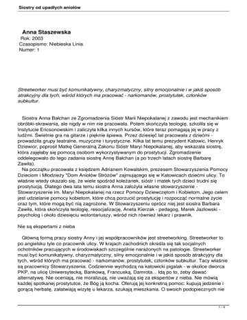 Siostry od upadłych aniołów Anna Staszewska Rok: 2003 Czasopismo: Niebieska Linia Numer: 1 Streetworker musi być komunikatywny, charyzmatyczny, silny emocjonalnie i w jakiś sposób atrakcyjny dla tych, wśród których ma pracować - narkomanów, prostytutek, członków subkultur. Siostra Anna Bałchan ze Zgromadzenia Sióstr Marii Niepokalanej z zawodu jest mechanikiem obróbki-skrawania, ale nigdy w nim nie pracowała. Potem skończyła teologię, szkoliła się w Instytucie Ericsonowskim i zaliczyła kilka innych kursów, które teraz pomagają jej w pracy z ludźmi. Świetnie gra na gitarze i pięknie śpiewa. Przez dziesięć lat pracowała z dziećmi prowadziła grupy teatralne, muzyczne i turystyczne. Kilka lat temu prezydent Katowic, Henryk Dziewior, poprosił Matkę Generalną Zakonu Sióstr Maryi Niepokalanej, aby wskazała siostrę, która zajęłaby się pomocą osobom wykorzystywanym do prostytucji. Zgromadzenie oddelegowało do tego zadania siostrę Annę Bałchan (a po trzech latach siostrę Barbarę Zawiła). Na początku pracowała z księdzem Adrianem Kowalskim, prezesem Stowarzyszenia Pomocy Dzieciom i Młodzieży "Dom Aniołów Stróżów" zajmującego się w Katowicach dziećmi ulicy. To właśnie wtedy okazało się, że wiele spośród koleżanek, sióstr i matek tych dzieci trudni się prostytucją. Dlatego dwa lata temu siostra Anna założyła własne stowarzyszenie Stowarzyszenie im. Maryi Niepokalanej na rzecz Pomocy Dziewczętom i Kobietom. Jego celem jest udzielanie pomocy kobietom, które chcą porzucić prostytucję i rozpocząć normalne życie oraz tym, które mogą być nią zagrożone. W Stowarzyszeniu oprócz niej jest siostra Barbara Zawiła, która skończyła teologię, resocjalizację, Aneta Kierzak - pedagog, Marek Jazłowski psycholog i około dziesięciu wolontariuszy, wśród nich również lekarz i prawnik. Nie są ekspertami z nieba Główną formą pracy siostry Anny i jej współpracowników jest streetworking. Streetworker to po angielsku tyle co pracownik ulicy. W krajach zachodnich określa się tak socjalnych ochotników pracujących w środowiskach szczególnie narażonych na patologie. Streetworker musi być komunikatywny, charyzmatyczny, silny emocjonalnie i w jakiś sposób atrakcyjny dla tych, wśród których ma pracować - narkomanów, prostytutek, członków subkultur. Tacy właśnie są pracownicy Stowarzyszenia. Codziennie wychodzą na katowicki pigalak - w okolice dworca PKP, na ulicę Uniwersytecką, Bankową, Francuską, Damrota... Idą po to, żeby dawać alternatywę. Nie oceniają, nie moralizują, nie uważają się za ekspertów z nieba. Nie mówią każdej spotkanej prostytutce, że Bóg ją kocha. Oferują jej konkretną pomoc: kupują jedzenie i gorącą herbatę, załatwiają wizytę u lekarza, szukają mieszkania. O swoich podopiecznych nie 1/4 Siostry od upadłych aniołów mówią "prostytutki". Nazywają je kobietami w kryzysie, ofiarami społeczeństwa, zagubionymi dziewczynami. Mówią im: To jest twoje życie i ty decydujesz, co z nim zrobisz. Jednak jeśli chciałabyś coś zmienić, zawsze możesz do mnie przyjść. Mówią też, że jeszcze nigdy nie spotkały dziewczyny, która byłaby szczęśliwa z tego powodu, że uprawia prostytucję. Bo żadna kobieta nie chce być traktowana jak narzędzie. Ich zdaniem prostytucja to objaw sytuacji społecznej i gospodarczej Polski oraz tego, co dzieje się w rodzinach. Wiele spośród dziewcząt to ofiary przemocy seksualnej i psychicznej w swoich domach rodzinnych. Prawie każda z nich była ofiarą albo świadkiem przemocy. Nigdy nie jest tak, że dziewczyna budzi się rano z postanowieniem: wychodzę na ulicę. Ona do takiej decyzji długo dojrzewa. A czasem po prostu pada ofiarą kogoś, o kim myśli, że w trudnym momencie życia, chce jej podać pomocną dłoń. Dziewczyny, które trafiają na ulicę - jak mówią pracownicy Stowarzyszenia im. Marii Niepokalanej - to nie są osoby, które w swoich domach rodzinnych zasiadały do niedzielnych obiadów, a potem szły z rodzicami na spacer do zoo. Ich dom nie był ani ciepły, ani bezpieczny. Dlatego wiele z nich woli iść na ulicę. Są zdesperowane. Czasem mówią nawet, że mogą to robić z każdym, tylko nie z tatusiem... Kobiety te często chciałyby skończyć z prostytucją, ale po pierwsze, nie wierzą, że to jest możliwe, a po drugie, państwo nie ma dla nich realnej oferty pomocowej. Z reguły są to osoby, które nie mają żadnego wykształcenia, nie skończyły żadnej szkoły i trudno im znaleźć pracę. Sutenerzy zaś niejednokrotnie zapewniają im mieszkanie, a nawet, jeśli trzeba, opiekę do dzieci. Zdarza się, że dziewczyna idzie na ulicę za aprobatą lub pod presją rodziny, bo trzeba utrzymać dom, nakarmić dzieci, zapłacić za czynsz i prąd. Często mówią sobie: postoję rok, dwa, zarobię trochę pieniędzy, otworzę mały sklep i zacznę inne życie. Ale im dłużej pracują w branży, tym trudniej im odmienić swój los. Brak kwalifikacji zawodowych, stałego miejsca zamieszkania, ubezpieczenia - to wszystko wyrzuca je poza nawias społeczny. Konsekwencją jest potęgująca się demoralizacja i zagubienie. Do tego dochodzi ryzyko zarażenia wirusem HIV i innymi chorobami przenoszonymi drogą płciową oraz ryzyko uzależnienia od środków odurzających, które większość z nich zażywa, żeby "się znieczulić". Trafić na odpowiedni moment Trudno powiedzieć, ile osób uprawia prostytucję. Nie jest ona w Polsce karalna, więc urzędy nie prowadzą żadnych statystyk. Z nieoficjalnych danych policyjnych wynika, że w samych tylko Katowicach prostytucją trudni się około tysiąc kobiet. Sytuację utrudnia fakt, że w naszym kraju powszechnie akceptuje się prostytucję i jednocześnie pogardza kobietami, które ją uprawiają. Nikt nie myśli o tym, że gdyby nie było popytu, to nie byłoby również podaży. Niewiele zmieniło się więc od czasów, o których 