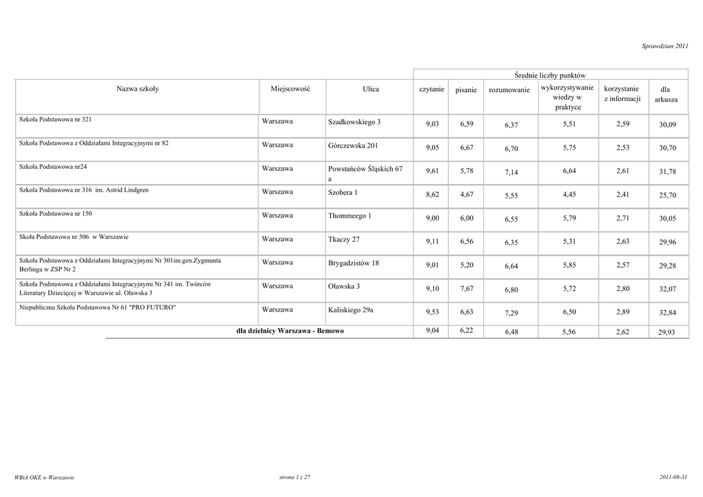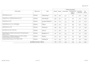 Sprawdzian 2011 Średnie liczby punktów Nazwa szkoły Miejscowość Ulica czytanie pisanie rozumowanie wykorzystywanie wiedzy w praktyce korzystanie z informacji dla arkusza Szkoła Podstawowa nr 321 Warszawa Szadkowskiego 3 9,03 6,59 6,37 5,51 2,59 30,09 Szkoła Podstawowa z Oddziałami Integracyjnymi nr 82 Warszawa Górczewska 201 9,05 6,67 6,70 5,75 2,53 30,70 Szkoła Podstawowa nr24 Warszawa Powstańców Śląskich 67 a 9,61 5,78 7,14 6,64 2,61 31,78 Szkola Podstawowa nr 316 im. Astrid Lindgren Warszawa Szobera 1 8,62 4,67 5,55 4,45 2,41 25,70 Szkoła Podstawowa nr 150 Warszawa Thommeego 1 9,00 6,00 6,55 5,79 2,71 30,05 Skoła Podstawowa nr 306 w Warszawie Warszawa Tkaczy 27 9,11 6,56 6,35 5,31 2,63 29,96 Szkoła Podstawowa z Oddziałami Integracyjnymi Nr 301im.gen.Zygmunta Berlinga w ZSP Nr 2 Warszawa Brygadzistów 18 9,01 5,20 6,64 5,85 2,57 29,28 Szkoła Podstawowa z Oddziałami Integracyjnymi Nr 341 im. Twórców Literatury Dziecięcej w Warszawie ul. Oławska 3 Warszawa Oławska 3 9,10 7,67 6,80 5,72 2,80 32,07 Niepubliczna Szkoła Podstawowa Nr 61 "PRO FUTURO" Warszawa Kaliskiego 29a 9,53 6,63 7,29 6,50 2,89 32,84 9,04 6,22 6,48 5,56 2,62 29,93 dla dzielnicy Warszawa - Bemowo WBiA OKE w Warszawie strona 1 z 27 2011-08-31 Sprawdzian 2011 Średnie liczby punktów Nazwa szkoły Miejscowość Ulica czytanie pisanie rozumowanie wykorzystywanie wiedzy w praktyce korzystanie z informacji dla arkusza Szkoła Podstawowa Nr 231 Warszawa Juranda ze Spychowa 10 9,19 6,93 6,66 5,60 2,57 30,94 Społeczna Szkoła Podstawowa nr 2 STO Warszawa Dziatwy 6 9,53 7,53 7,22 7,06 3,00 34,34 Szkoła Podstawowa Nr 112 z Oddziałami Integracyjnymi im. Marii Kownackiej w Warszawie Warszawa Ostródzka 175 8,82 6,13 5,68 4,44 2,44 27,51 Szkoła Podstawowa nr 31 im. Kardynała Stefana Wyszyńskiego w Zespole Szkół nr 43 Warszawa Kobiałka 49 8,98 5,86 6,14 5,19 2,50 28,67 Szkoła Podstawowa Nr 154 z Oddziałami Integracyjnymi im. Pawła Edmunda Strzeleckiego w Warszawie Warszawa Leśnej Polanki 63/65 8,29 6,85 4,96 3,58 2,16 25,85 Szkoła Podstawowa nr110 im.Kazimierza Jeżewskiego Warszawa Bohaterów 41 8,69 6,71 5,81 4,52 2,35 28,08 Szkoła podstawowa nr 118 im. Przyjaciół Mazowsza w Warszawie Warszawa Leszczynowa 5 8,47 5,97 5,87 4,60 2,33 27,23 Szkoła Podstawowa nr 314 im. Przyjaciół Ziemi w Warszawie Warszawa Porajów 3 8,92 6,19 6,02 4,88 2,47 28,49 Szkoła Podstawowa z Oddziałami Integracyjnymi Nr 342 im. Jana Marcina Szancera w Warszawie Warszawa Strumykowa 21A 9,13 5,81 6,28 5,17 2,56 28,95 Szkoła Podstawowa z Oddziałami Integracyjnymi nr 344 im. Powstania Warszawskiego Warszawa Erazma z Zakroczymia 15 9,03 6,81 6,58 5,08 2,62 30,10 Szkoła Podstawowa nr 257 im. prof. Mariana Falskiego w Warszawie Warszawa Podróżnicza 11 9,26 7,47 6,45 5,90 2,66 31,74 Niepubliczna Szkoła Podstawowa "Nasza Szkoła" Warszawa ul. Myśliborska 53 9,71 7,29 7,43 7,71 3,00 35,14 8,98 6,50 6,20 5,08 2,53 29,29 dla dzielnicy Warszawa - Białołęka WBiA OKE w Warszawie strona 2 z 27 2011-08-31 Sprawdzian 2011 Średnie liczby punktów Nazwa szkoły Miejscowość Ulica czytanie pisanie rozumowanie wykorzystywanie wiedzy w praktyce korzystanie z informacji dla arkusza Szkoła Podstawowa Nr 53 im. gen. Mariusza Zaruskiego w Warszawie Warszawa Rudzka 6 9,11 7,43 6,71 5,77 2,70 31,71 Szkoła Podstawowa nr 289 im. Henryka Sienkiewicza w Warszawie Warszawa Broniewskiego 99a 8,94 6,81 6,43 5,43 2,44 30,06 Szkoła Podstawowa nr 293 im.Jana Kochanowskiego w Warszawie Warszawa Kochanowskiego 8 9,08 6,83 6,27 5,20 2,44 29,83 Szkoła Podstawowa nr 80 im. Marii Kownackiej w Warszawie Warszawa Aspekt 48 8,93 6,88 6,01 4,90 2,44 29,17 Szkoła Podstawowa Niepubliczna nr 74 im. Bł. Honorata Koźmińskiego Warszawa Smoleńskiego 31 9,25 6,42 7,13 5,79 2,29 30,88 Społeczna Szkoła Podstawowa Integracyjna nr 100 STO Warszawa Wolumen 3 9,77 6,31 7,08 7,23 3,00 33,38 Szkoła Podstawowa nr 79 im. Zygmunta Sokołowskiego Warszawa Arkuszowa 202 8,92 6,86 6,14 4,64 2,58 29,14 Szkoła Podstawowa Nr 133 im. Stefana Czarnieckiego Warszawa Fontany 3 8,53 4,42 5,80 3,84 2,33 24,93 Społeczna Szkoła Podstawowa nr 13 im. Lotników Amerykańskich Warszawa Wóycickiego 1/3 bud.13 9,28 7,39 7,44 6,50 2,39 33,00 Szkoła Podstawowa nr 263 im. Powstańców Wielkopolskich w Zespole Szkół nr 52 w Warszawie Warszawa Szegedyńska 11 8,83 6,24 6,08 4,94 2,49 28,58 Szkoła Podstawowa nr 214 z Oddziałami Integracyjnymi im.Stanisława Skrypija w Zespole Szkół nr 56 z Oddziałami IIntegracyjnymi w Warszawie Warszawa Fontany 1 8,43 5,43 5,86 4,71 2,14 26,57 Szkoła Podstawowa nr 209 im Hanki Ordonówny Warszawa Reymona 25 9,13 5,81 6,12 5,18 2,57 28,81 Szkoła Podstawowa nr 187 im. Adama Mickiewicza Warszawa L. Staffa 21 9,14 6,46 6,62 5,51 2,68 30,41 Szkoła Podstawowa nr 273 Warszawa Balcerzaka 1 8,48 5,28 5,13 4,19 2,41 25,48 Szkoła Podstawowa z Oddziałami Integracyjnymi Nr 223 Warszawa Kasprowicza 107 8,94 6,89 6,32 5,38 2,60 30,13 WBiA OKE w Warszawie strona 3 z 27 2011-08-31 Sprawdzian 2011 Średnie liczby punktów Nazwa szkoły Miejscowość Ulica czytanie pisanie rozumowanie wykorzystywanie wiedzy w praktyce korzystanie z informacji dla arkusza Szkoła Podstawowa nr 77 im. Wandy Zieleńczyk w Warszawie Warszawa Samogłoski 9 8,85 7,47 6,51 5,43 2,83 31,09 Szkoła Podstawowa z Oddziałami Integracyjnymi nr 247 im. Kazimierza Lisieckiego "Dziadka". Warszawa Wrzeciono 9 8,20 5,88 4,63 3,63 2,18 24,50 Katolicka Szkoła Podstawowa nr 109 im. Świętej Rodziny Fundacji Na Rzecz Rodziny w Warszawie Warszawa Wóycickiego 1/3 bud. 18 9,27 5,73 6,64 5,27 2,36 29,27 Szkoła Podstawowa nr 3 Przymierza Rodzin im. ks. Jerzego Popiełuszki Warszawa 9,61 7,14 7,49 7,08 2,82 34,14 8,94 6,46 6,23 5,16 2,50 29,29 WBiA OKE w Warszawie Nocznickiego Tomasza 7 dla dzielnicy Warszawa - Bielany strona 4 z 27 2011-08-31 Sprawdzian 2011 Średnie liczby punktów Nazwa szkoły Miejscowość Ulica czytanie pisanie rozumowanie wykorzystywanie wiedzy w praktyce korzystanie 