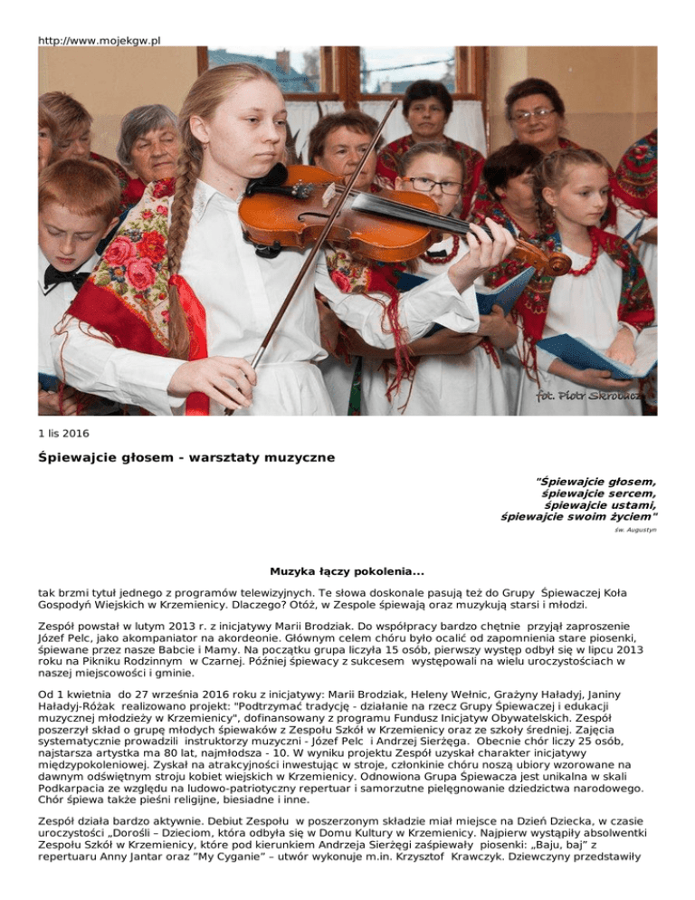 http://www.mojekgw.pl 1 lis 2016 Śpiewajcie głosem - warsztaty muzyczne "Śpiewajcie głosem, śpiewajcie sercem, śpiewajcie ustami, śpiewajcie swoim życiem" św. Augustyn Muzyka łączy pokolenia... tak brzmi tytuł jednego z programów telewizyjnych. Te słowa doskonale pasują też do Grupy Śpiewaczej Koła Gospodyń Wiejskich w Krzemienicy. Dlaczego? Otóż, w Zespole śpiewają oraz muzykują starsi i młodzi. Zespół powstał w lutym 2013 r. z inicjatywy Marii Brodziak. Do współpracy bardzo chętnie przyjął zaproszenie Józef Pelc, jako akompaniator na akordeonie. Głównym celem chóru było ocalić od zapomnienia stare piosenki, śpiewane przez nasze Babcie i Mamy. Na początku grupa liczyła 15 osób, pierwszy występ odbył się w lipcu 2013 roku na Pikniku Rodzinnym w Czarnej. Później śpiewacy z sukcesem występowali na wielu uroczystościach w naszej miejscowości i gminie. Od 1 kwietnia do 27 września 2016 roku z inicjatywy: Marii Brodziak, Heleny Wełnic, Grażyny Haładyj, Janiny Haładyj-Różak realizowano projekt: "Podtrzymać tradycję - działanie na rzecz Grupy Śpiewaczej i edukacji muzycznej młodzieży w Krzemienicy", dofinansowany z programu Fundusz Inicjatyw Obywatelskich. Zespół poszerzył skład o grupę młodych śpiewaków z Zespołu Szkół w Krzemienicy oraz ze szkoły średniej. Zajęcia systematycznie prowadzili instruktorzy muzyczni - Józef Pelc i Andrzej Sierżęga. Obecnie chór liczy 25 osób, najstarsza artystka ma 80 lat, najmłodsza - 10. W wyniku projektu Zespół uzyskał charakter inicjatywy międzypokoleniowej. Zyskał na atrakcyjności inwestując w stroje, członkinie chóru noszą ubiory wzorowane na dawnym odświętnym stroju kobiet wiejskich w Krzemienicy. Odnowiona Grupa Śpiewacza jest unikalna w skali Podkarpacia ze względu na ludowo-patriotyczny repertuar i samorzutne pielęgnowanie dziedzictwa narodowego. Chór śpiewa także pieśni religijne, biesiadne i inne. Zespół działa bardzo aktywnie. Debiut Zespołu w poszerzonym składzie miał miejsce na Dzień Dziecka, w czasie uroczystości „Dorośli – Dzieciom, która odbyła się w Domu Kultury w Krzemienicy. Najpierw wystąpiły absolwentki Zespołu Szkół w Krzemienicy, które pod kierunkiem Andrzeja Sierżęgi zaśpiewały piosenki: „Baju, baj” z repertuaru Anny Jantar oraz ”My Cyganie” – utwór wykonuje m.in. Krzysztof Krawczyk. Dziewczyny przedstawiły publiczności nie tylko talent wokalny, ale także umiejętność gry na różnych instrumentach. Później Zespół zaprezentował się w całej okazałości, scena z trudem pomieściła wszystkich występujących. Artyści popisali się bogatym repertuarem. Wykonali pieśni ludowe, takie jak: „W moim ogródeczku”, „Gąski”, „Z tamtej strony jeziora”, „Pasała Kasieńka” oraz utwory: „Uśmiechaj się”, „Raduje się serce, raduje się dusza”. Premierowy występ okazał się bardzo udany. Młodzi śpiewacy w nagrodę za zaangażowanie się w działalność chóru otrzymali artystyczne poduszki, które uszyła przewodnicząca KGW – Krystyna Guzek. W czasie wakacji Zespół prezentował głównie pieśni religijne. Przygotował oprawę Mszy Św. odpustowych w Krzemienicy, poświęconych św. Jakubowi – Patronowi starego kościoła oraz Matce Bożej Pocieszenia – Patronce nowej świątyni. Wyróżnił się na Koncercie Maryjnym w Dąbrówkach przede wszystkim tym, że jako jedyna Grupa Śpiewacza ma w swym składzie tak wielu młodych wykonawców. We wrześniu śpiewacy wzięli udział w Przeglądzie Zespołów Artystycznych działających w naszej miejscowości, która odbyła się w Domu Kultury w Krzemienicy. Byli wielką atrakcją na uroczystości otwarcia Izby Pamięci Kobiety Wiejskiej w naszej wsi. Wykonali kilka pieśni ludowych, m.in. zaśpiewali utwór pt.”Wiejska dziewczyno” nawiązujący do tematyki spotkania. Warta podkreślenia jest też prezentacja przez młodą artystkę wiersza Marii Konopnickiej pt.”Pieśń o domu”, na tle melodii wykonanej na skrzypcach. Kobiety i dziewczyny w swoich barwnych strojach pięknie prezentowały się na tle starych wiejskich mebli i zgromadzonych eksponatów, dodały uroku temu małemu muzeum. Zakończenie realizacji projektu odbyło się w czasie warsztatów wyjazdowych w Cierpiszu. Zespół przygotował oprawę muzyczną Mszy Św. w kościele pw. św. Jana Chrzciciela, po południu wystąpił dla mieszkańców wsi prezentując Koncert Pieśni Ludowych. Wieczorem przy ognisku miało miejsce wspólne śpiewanie i muzykowanie chóru oraz zaproszonych gości. Artyści mogli się jeszcze lepiej poznać i zintegrować. Trzeba przyznać, że mimo dużej różnicy wieku młodzi i starsi śpiewacy doskonale się dogadują i rozumieją. Kobiety z wielką serdecznością przyjęły dzieci i młodzież do Zespołu, otoczyły ich troskliwą opieką. Młodzi wykonawcy chętnie uczestniczą w zajęciach i występach. Dziewczyny z dumą prezentują ludowy strój, który podkreśla ich młodość i urodę. Podsumowując, realizacja projektu powiodła się. Udało się "odmłodzić" Zespół Śpiewaczy KGW w naszej wsi, który powiększył się o 12 młodych śpiewaków. Dla wszystkich skompletowano śpiewniki. Uzupełniono stroje ludowe w haftowane fartuszki, spódnice, chusty i korale. Odbyły się liczne koncerty dla mieszkańców wsi i okolic, w czasie których występujący zaprezentowali swoje umiejętności wokalne i muzyczne, a także promowali Krzemienicę i gminę Czarna. Istnienie Zespołu możliwe jest dzięki umiłowaniu śpiewania i poczuciu tego, że jest on nośnikiem kultury ludowej i wartości narodowych. Grażyna Haładyj Krzysztof S. z Koło Gospodyń Wiejskich w Krzemienicy-"Krzemieniczanki"