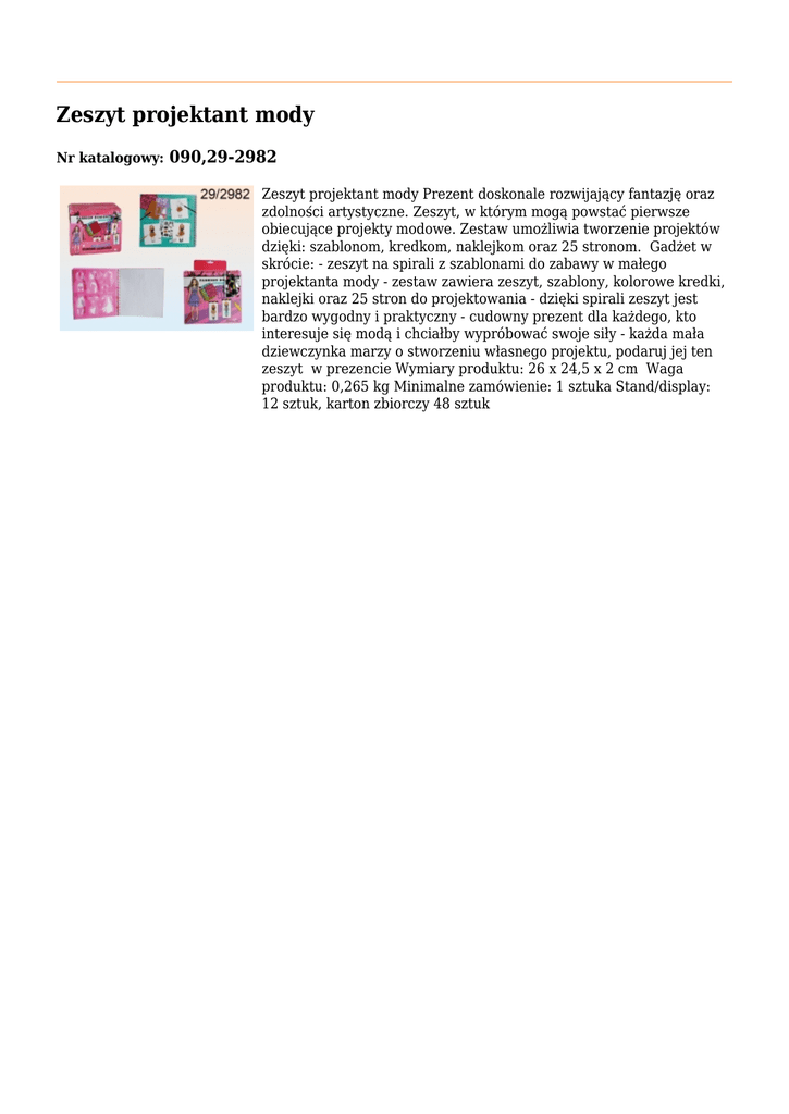 Zeszyt projektant mody Nr katalogowy: 090,29-2982 Zeszyt projektant mody Prezent doskonale rozwijający fantazję oraz zdolności artystyczne. Zeszyt, w którym mogą powstać pierwsze obiecujące projekty modowe. Zestaw umożliwia tworzenie projektów dzięki: szablonom, kredkom, naklejkom oraz 25 stronom. Gadżet w skrócie: - zeszyt na spirali z szablonami do zabawy w małego projektanta mody - zestaw zawiera zeszyt, szablony, kolorowe kredki, naklejki oraz 25 stron do projektowania - dzięki spirali zeszyt jest bardzo wygodny i praktyczny - cudowny prezent dla każdego, kto interesuje się modą i chciałby wypróbować swoje siły - każda mała dziewczynka marzy o stworzeniu własnego projektu, podaruj jej ten zeszyt w prezencie Wymiary produktu: 26 x 24,5 x 2 cm Waga produktu: 0,265 kg Minimalne zamówienie: 1 sztuka Stand/display: 12 sztuk, karton zbiorczy 48 sztuk