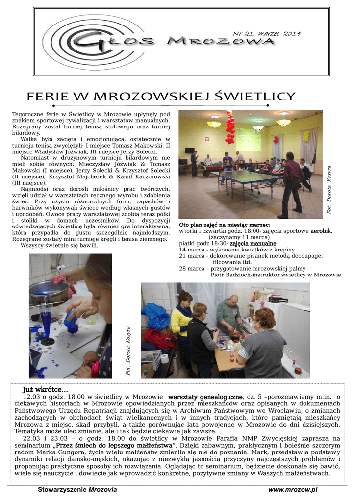 21,, marzec 2014 Nr 21 Oto plan plan zajęć na miesiąc marzec: w torki i czwartki godz. 18:00- zajęcia sportowe aerobik. aerobik (zaczynamy 11 marca) piątki godz 18:30- zajęcia manualne 14 marca - w ykonanie kw iatków z krepiny 21 marca - dekorowanie pisanek metodą decoupage, filcowania itd. 28 marca – przygotowanie mrozowskiej palmy Piotr Badzioch-instruktor św ietlicy w Mrozow ie Fot. Dorota Kozyra Tegoroczne ferie w Św ietlicy w Mrozow ie upłynęły pod znakiem sportowej rywalizacji i warsztatów manualnych. Rozegrany został turniej tenisa stołowego oraz turniej bilardowy. Walka była zacięta i emocjonująca, ostatecznie w turnieju tenisa zwyciężyli: I miejsce Tomasz Makowski, II miejsce Władysław Jóźw iak, III miejsce Jerzy Solecki. Natomiast w drużynowym turnieju bilardowym nie mieli sobie równych: Mieczysław Jóźw iak & Tomasz Makowski (I miejsce), Jerzy Solecki & Krzysztof Solecki (II miejsce), Krzysztof Majcherek & Kamil Kaczorowski (III miejsce). Najmłodsi oraz dorośli miłośnicy prac twórczych, wzięli udział w warsztatach ręcznego wyrobu i zdobienia św iec. Przy użyciu różnorodnych form, zapachów i barwników wykonywali św iece według własnych gustów i upodobań. Owoce pracy warsztatowej zdobią teraz półki i stoliki w domach uczestników. Do dyspozycji odw iedzających św ietlicę była również gra interaktywna, która przypadła do gustu szczególnie najmłodszym. Rozegrane zostały mini turnieje kręgli i tenisa ziemnego. Wszyscy św ietnie się baw ili. Fot. Dorota Kozyra FERIE W MROZOWSKIEJ ŚWIETLICY Już wkrótce… 12.03 o godz. 18.00 w św ietlicy w Mrozow ie w arsztaty genealogiczne, genealogiczne cz. 5 –porozmaw iamy m.in. o ciekaw ych historiach w Mrozow ie opow iedzianych przez mieszkańców oraz opisanych w dokumentach Państwowego Urzędu Repatriacji znajdujących się w Archiwum Państwow ym we Wrocław iu, o zmianach zachodzących w obchodach św iąt w ielkanocnych i w innych tradycjach, które pamiętają mieszkańcy Mrozowa z miejsc, skąd przybyli, a także porównując lata powojenne w Mrozow ie do dni dzisiejszych. Tematyka może ulec zmianie, ale i tak będzie ciekaw ie jak zawsze. 22.03 i 23.03 – o godz. 18.00 do św ietlicy w Mrozow ie Parafia NMP Zw ycięskiej zaprasza na seminarium „Przez śmiech do lepszego małżeństwa”. małżeństwa Dzięki zabawnym, praktycznym i boleśnie szczerym radom Marka Gungora, życie w ielu małżeństw zmieniło się nie do poznania. Mark, przedstaw ia podstaw y dynamiki relacji damsko-męskich, ukazując z niezw ykłą jasnością przyczyny najczęstszych problemów i proponując praktyczne sposoby ich rozw iązania. Oglądając to seminarium, będziecie doskonale się baw ić, w iele się nauczycie i dow iecie jak wprowadzić konkretne, pozytywne zmiany w Waszych małżeństwach. Stowarzyszenie Mrozovia www.mrozow.pl DZIELNICE MROZOWA Niegdyś "ścieżka" była znacznie szersza i pewnie anektowała pas czyjegoś pola, ale służyła wszystkim jako wygodny trakt po runo leśne, a i chrust – wzorem Sanacji – niektóre babiny transportowały na własnych plecach. Znoszono też tędy (w iosną) całe w iązki prętów leszczynowych, służących jako podpórki fasoli i pomidorów. Z lasu pozyskiwano także maliny i grzyby, głównie tych szlachetniejszych gatunków, a kto zapuścił się głębiej – w okolicę „Lisiej górki” - mógł zebrać sporą ilość niebieskofioletowych jagód. Warto jednak podkreślić, że było to w erze „komuny”, tj. powszechnego i wolnego dostępu praktycznie do każdej posesji. I rzadko kto prosił też właścicieli zagrody o zezwolenie na przejście. Po prostu przechodziło się, skracając w ten sposób drogę do lasu, cmentarza, a także do Wojnow ic. To ostatnie było szczególnie użyteczne dla uczniów Szkoły Podstawowej – chodząc „przez ogrody”, znacznie skracali sobie drogę do domu. Na całym tym terenie (obszar A na szkicu) królowały zboża i ziemniaki, a dopiero w latach siedemdziesiątych pojaw iły się truskawki, potem porzeczki, drzewka w iśniowe i aronia. Dziś pozostały tylko resztki upraw, a ich miejsce w dużej części zajęły nowe zabudowania. Tak po prawdzie – słusznie, bo ziemia tam nigdy nie była najlepsza, gdzieś w okolicach klasy V. Dziać się coś zaczęło w początkach lat sześćdziesiątych, a rozpoczęto od gruntownego utwardzenia, a później wysypania żw irem drogi do Wojnow ic. Z pewnością nie z myślą o uruchomieniu linii autobusowej. Gdy Polska urosła w siłę, a ludziom polepszyło, droga otrzymała nowy dywanik bitumiczny, chicagowski model odrutowania telefonicznego zastąpiono jednym kablem w ielożyłowym, a początek ul. Cmentarnej udekorowano gustownymi, niebieskimi skrzynkami na kurzych łapkach. Pozostały tylko pojedyncze drzewa czereśniowe, którymi wcześniejsi mieszkańcy gęsto obsadzili drogę do Wojnow ic. I o zbiór owoców ludzie już tak się nie dobijali; jak w latach 50. i początku 60. Możliwe, że z powodu zagrożenia ołow iem, gdyż społeczeństwo się dwusuwowo, masowo motoryzowało, a ekologiczne rowery powoli wychodziły z mody. Trzeba jednak przyznać, że niedoścignione w smaku i w ielkości były czereśnie tylko w dwóch miejscach: przy gajówce, pod lasem oraz na terenie dawnej leśniczówki. Do dzisiaj nie spotkałem choćby zbliżonych smakowo Stowarzyszenie Mrozovia lub gatunkowo, a i starzy Mrozow ianie to potw ierdzali. Koneserzy natomiast wypraw iali się do lasu północnego na czereśnie dzikie, rosnące w okolicy Lisiej Górki. Wielkość drzew ani owoców nie powalała, ale smak był równie niepow tarzalny. Mieszkańcy Wojnow ic, w znacznej części pracujący we Wrocław iu, od zawsze byli zmuszeni do codziennych wycieczek zarówno do stacji kolejowej, jak i, najmłodsi do szkoły. Może część Mrozow ian nie w ie, a niektórzy już zapomnieli: we wsi była szkoła, która wydała w ielu synów, i to w najlepszy