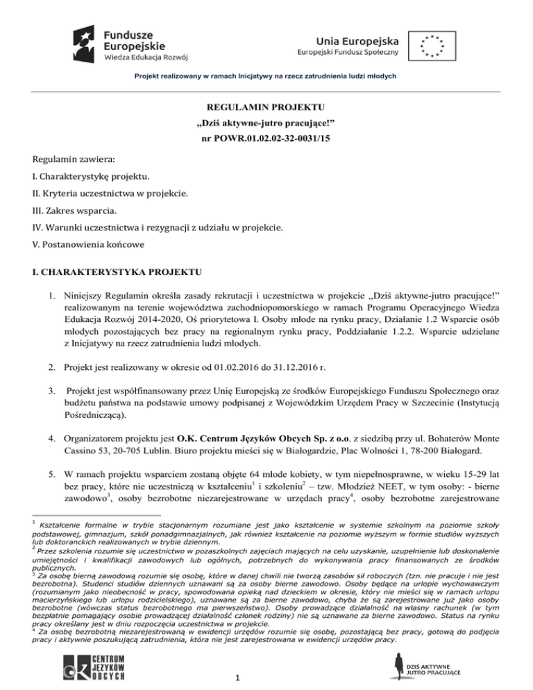 Projekt realizowany w ramach Inicjatywy na rzecz zatrudnienia ludzi młodych REGULAMIN PROJEKTU ,,Dziś aktywne-jutro pracujące!” nr POWR.01.02.02-32-0031/15 Regulamin zawiera: I. Charakterystykę projektu. II. Kryteria uczestnictwa w projekcie. III. Zakres wsparcia. IV. Warunki uczestnictwa i rezygnacji z udziału w projekcie. V. Postanowienia końcowe I. CHARAKTERYSTYKA PROJEKTU 1. Niniejszy Regulamin określa zasady rekrutacji i uczestnictwa w projekcie ,,Dziś aktywne-jutro pracujące!” realizowanym na terenie województwa zachodniopomorskiego w ramach Programu Operacyjnego Wiedza Edukacja Rozwój 2014-2020, Oś priorytetowa I. Osoby młode na rynku pracy, Działanie 1.2 Wsparcie osób młodych pozostających bez pracy na regionalnym rynku pracy, Poddziałanie 1.2.2. Wsparcie udzielane z Inicjatywy na rzecz zatrudnienia ludzi młodych. 2. Projekt jest realizowany w okresie od 01.02.2016 do 31.12.2016 r. 3. Projekt jest współfinansowany przez Unię Europejską ze środków Europejskiego Funduszu Społecznego oraz budżetu państwa na podstawie umowy podpisanej z Wojewódzkim Urzędem Pracy w Szczecinie (Instytucją Pośredniczącą). 4. Organizatorem projektu jest O.K. Centrum Języków Obcych Sp. z o.o. z siedzibą przy ul. Bohaterów Monte Cassino 53, 20-705 Lublin. Biuro projektu mieści się w Białogardzie, Plac Wolności 1, 78-200 Białogard. 5. W ramach projektu wsparciem zostaną objęte 64 młode kobiety, w tym niepełnosprawne, w wieku 15-29 lat bez pracy, które nie uczestniczą w kształceniu1 i szkoleniu2 – tzw. Młodzież NEET, w tym osoby: - bierne zawodowo3, osoby bezrobotne niezarejestrowane w urzędach pracy4, osoby bezrobotne zarejestrowane 1 Kształcenie formalne w trybie stacjonarnym rozumiane jest jako kształcenie w systemie szkolnym na poziomie szkoły podstawowej, gimnazjum, szkół ponadgimnazjalnych, jak również kształcenie na poziomie wyższym w formie studiów wyższych lub doktoranckich realizowanych w trybie dziennym. 2 Przez szkolenia rozumie się uczestnictwo w pozaszkolnych zajęciach mających na celu uzyskanie, uzupełnienie lub doskonalenie umiejętności i kwalifikacji zawodowych lub ogólnych, potrzebnych do wykonywania pracy finansowanych ze środków publicznych. 3 Za osobę bierną zawodową rozumie się osobę, które w danej chwili nie tworzą zasobów sił roboczych (tzn. nie pracuje i nie jest bezrobotna). Studenci studiów dziennych uznawani są za osoby bierne zawodowo. Osoby będące na urlopie wychowawczym (rozumianym jako nieobecność w pracy, spowodowana opieką nad dzieckiem w okresie, który nie mieści się w ramach urlopu macierzyńskiego lub urlopu rodzicielskiego), uznawane są za bierne zawodowo, chyba że są zarejestrowane już jako osoby bezrobotne (wówczas status bezrobotnego ma pierwszeństwo). Osoby prowadzące działalność na własny rachunek (w tym bezpłatnie pomagający osobie prowadzącej działalność członek rodziny) nie są uznawane za bierne zawodowo. Status na rynku pracy określany jest w dniu rozpoczęcia uczestnictwa w projekcie. 4 Za osobę bezrobotną niezarejestrowaną w ewidencji urzędów rozumie się osobę, pozostającą bez pracy, gotową do podjęcia pracy i aktywnie poszukującą zatrudnienia, która nie jest zarejestrowana w ewidencji urzędów pracy. 1 Projekt realizowany w ramach Inicjatywy na rzecz zatrudnienia ludzi młodych w urzędach pracy5, osoby długotrwale bezrobotne6, które zamieszkują na obszarze województwa zachodniopomorskiego w rozumieniu przepisów Kodeksu Cywilnego, należących do gr.: kobiet samotnie wychowujących dzieci i/lub osób z terenów wiejskich. II. KRYTERIA UCZESTNICTWA W PROJEKCIE Profil Uczestniczki Projektu: Projekt skierowany jest do 64 młodych kobiety, w tym niepełnosprawnych, w wieku 15-29 lat bez pracy, które nie uczestniczą w kształceniu i szkoleniu – tzw. Młodzież NEET, w tym osoby: - bierne zawodowo, osoby bezrobotne niezarejestrowane w urzędach pracy, osoby bezrobotne zarejestrowane w urzędach pracy, osoby długotrwale bezrobotne , które zamieszkują na obszarze województwa zachodniopomorskiego w rozumieniu przepisów Kodeksu Cywilnego, należących do gr.: kobiet samotnie wychowujących dzieci i/lub osób z terenów wiejskich. Osoby te nie mogą być7: - młodzieżą z pieczy zastępczej opuszczającą pieczę (do roku po opuszczeniu instytucji pieczy) ze szczególnym uwzględnieniem: wychowanków pieczy zastępczej powyżej 15 roku życia, którzy po zakończeniu pobytu w instytucjach pieczy zastępczej powrócili do rodzin naturalnych, wychowanków pieczy zastępczej powyżej 18 roku życia, którzy założyli własne gospodarstwo domowe, wychowanków pieczy zastępczej powyżej 18 roku życia, którzy usamodzielniają się i mają trudności ze znalezieniem zatrudnienia po zakończeniu pobytu w instytucjach pieczy zastępczej, - matkami opuszczającymi pieczę (do roku po opuszczeniu instytucji pieczy), - absolwentami młodzieżowych ośrodków wychowawczych i młodzieżowych ośrodków socjoterapii (do roku po opuszczeniu), - absolwentami specjalnych ośrodków szkolno-wychowawczych i specjalnych ośrodków wychowawczych (do roku po opuszczeniu), - matkami przebywającymi w domach samotnej matki, - osobami młodymi opuszczającymi zakłady karne lub areszty śledcze (do roku po opuszczeniu). Warunkiem zakwalifikowania do udziału w projekcie jest: 1. Spełnienie wymogów formalnych. 2. Zapoznanie się z niniejszym regulaminem oraz złożenie kompletu dokumentów listownie lub osobiście w siedzibie Biura Projektu: a) formularza rekrutacyjnego zawierającego oświadczenie potwierdzające spełnienie kryteriów grupy docelowej, b) orzeczenia o niepełnosprawności w przypadku osób niepełnosprawnych, c) zaświadczenia z Urzędu Pracy o statusie osoby bezrobotnej – w przypadku osób zarejestrowanych jako bezrobotne 5 Za osobę bezrobotną zarejestrowaną w ewidencji urzędów pracy rozumie się osobę, pozostającą b