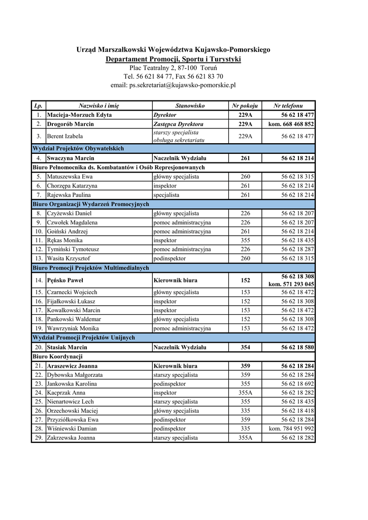 Urząd Marszałkowski Województwa Kujawsko-Pomorskiego Departament Promocji, Sportu i Turystyki Plac Teatralny 2, 87-100 Toruń Tel. 56 621 84 77, Fax 56 621 83 70 email: [email protected] Lp. Nazwisko i imię 1. Macieja-Morzuch Edyta 2. Drogorób Marcin 3. Berent Izabela Stanowisko Dyrektor Zastępca Dyrektora starszy specjalista obsługa sekretariatu Nr pokoju 229A 229A Nr telefonu 56 62 18 477 kom. 668 468 852 229A 56 62 18 477 261 56 62 18 214 główny specjalista inspektor specjalista 260 261 261 56 62 18 315 56 62 18 214 56 62 18 214 główny specjalista pomoc administracyjna pomoc administracyjna inspektor pomoc administracyjna podinspektor 226 226 261 355 226 260 56 62 18 207 56 62 18 207 56 62 18 214 56 62 18 435 56 62 18 287 56 62 18 315 14. Pęńsko Paweł Kierownik biura 152 15. 16. 17. 18. 19. główny specjalista inspektor inspektor główny specjalista pomoc administracyjna 153 152 153 152 153 56 62 18 308 kom. 571 293 045 56 62 18 472 56 62 18 308 56 62 18 472 56 62 18 308 56 62 18 472 Naczelnik Wydziału 354 56 62 18 580 Wydział Projektów Obywatelskich 4. Swaczyna Marcin Naczelnik Wydziału Biuro Pełnomocnika ds. Kombatantów i Osób Represjonowanych 5. Matuszewska Ewa 6. Chorzępa Katarzyna 7. Rajewska Paulina Biuro Organizacji Wydarzeń Promocyjnych 8. 9. 10. 11. 12. 13. Czyżewski Daniel Czwołek Magdalena Goiński Andrzej Rękas Monika Tymiński Tymoteusz Wasita Krzysztof Biuro Promocji Projektów Multimedialnych Czarnecki Wojciech Fijałkowski Łukasz Kowalkowski Marcin Pankowski Waldemar Wawrzyniak Monika Wydział Promocji Projektów Unijnych 20. Stasiak Marcin Biuro Koordynacji 21. 22. 23. 24. 25. 26. 27. 28. 29. Araszewicz Joanna Dybowska Małgorzata Jankowska Karolina Kacprzak Anna Nienartowicz Lech Orzechowski Maciej Przyziółkowska Ewa Wiśniewski Damian Zakrzewska Joanna Kierownik biura starszy specjalista podinspektor inspektor starszy specjalista główny specjalista podinspektor podinspektor starszy specjalista 359 359 355 355A 355 335 359 335 355A 56 62 18 284 56 62 18 284 56 62 18 692 56 62 18 282 56 62 18 435 56 62 18 418 56 62 18 284 kom. 784 951 992 56 62 18 282 Wydział Turystyki 30. Habel Marcin 56 62 18 217 kom. 602 726 342 Naczelnik 336 podinspektor podinspektor główny specjalista inspektor 337 335a 335a 337a inspektor 337a 36. Kornacki Marek kierownik biura 247 37. Domagalska Anna starszy specjalista 247 38. Maszewska Katarzyna 39. Tyburska-Myrta Beata starszy specjalista główny specjalista 247 247 56 62 18 464 kom. 698 641 715 56 62 18 464 kom.797 304 120 56 62 18 464 56 62 18 541 starszy specjalista inspektor starszy specjalista specjalista inspektor podinspektor inspektor 246 246 246 245 245 245 245 kom. 664 775 558 kom. 668 031 258 kom. 883 359 308 kom. 571 293 030 kom. 883 359 310 kom. 883 353 688 kom. 604 086 278 Biuro ds. Rozwoju Turystyki 31. 32. 33. 34. Budzichowska Wiesława Grzecznowska-Homik Agata Komorowska Agnieszka Stokłosa Małgorzata 35. Wiśniewski Marek 56 62 18 212 56 62 18 423 56 62 18 423 56 62 18 453 56 62 18 453 kom. 795 536 701 Biuro ds. Usług Turystycznych Wydział Sportu i Kultury Fizycznej 40. 41. 42. 43. 44. 45. 46. Cyrankowski Artur Gołębiewski Arkadiusz Kosiewicz-Wawrzonkowska Dominika Majchrzak Patrycja Paduszek-Knasiak Anna Rutkowski Michał Sawka Anna