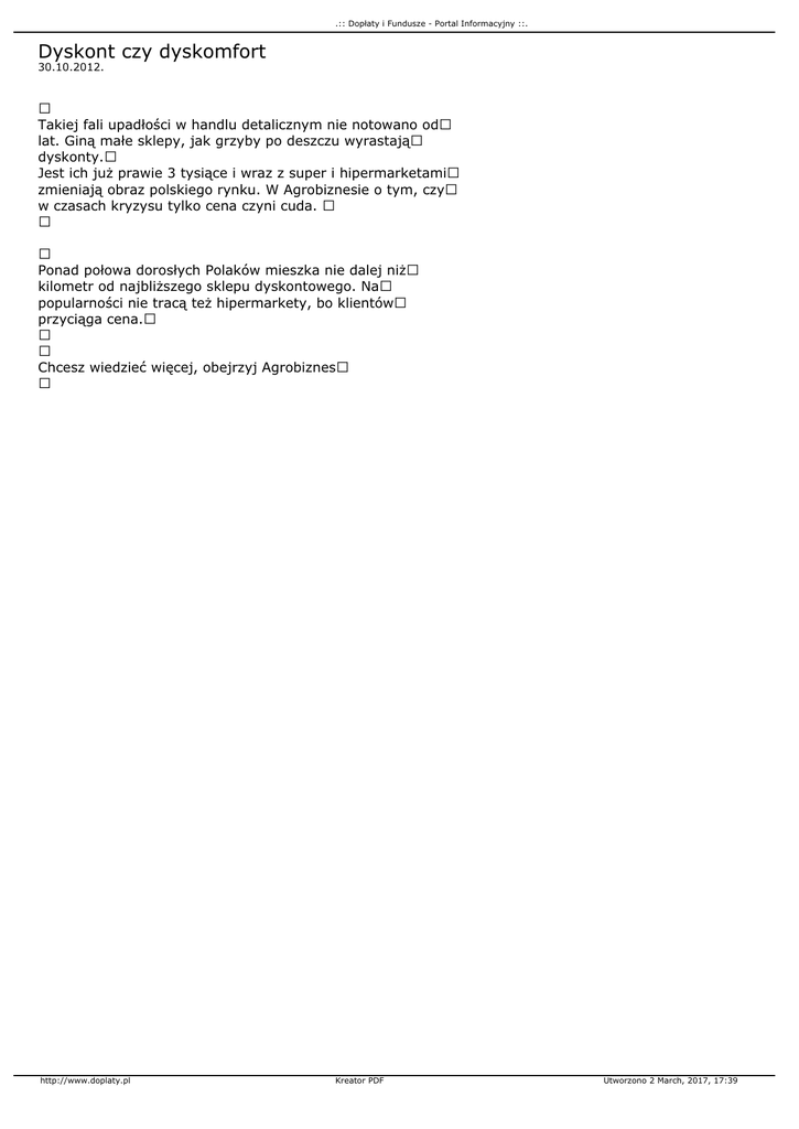 .:: Dopłaty i Fundusze - Portal Informacyjny ::. Dyskont czy dyskomfort 30.10.2012. Takiej fali upadłości w handlu detalicznym nie notowano od lat. Giną małe sklepy, jak grzyby po deszczu wyrastają dyskonty. Jest ich już prawie 3 tysiące i wraz z super i hipermarketami zmieniają obraz polskiego rynku. W Agrobiznesie o tym, czy w czasach kryzysu tylko cena czyni cuda. Ponad połowa dorosłych Polaków mieszka nie dalej niż kilometr od najbliższego sklepu dyskontowego. Na popularności nie tracą też hipermarkety, bo klientów przyciąga cena. Chcesz wiedzieć więcej, obejrzyj Agrobiznes http://www.doplaty.pl Kreator PDF Utworzono 2 March, 2017, 17:39