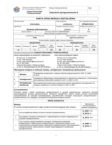 Państwowa Wyższa Szkoła Zawodowa im. H. Cegielskiego w Gnieźnie Instytut Informatyki i Telekomunikacji Nazwa modułu/przedmiotu Kod Inżynieria oprogramowania II KARTA OPISU MODUŁU KSZTAŁCENIA Kierunek studiów Profil kształcenia Informatyka Kurs (obligatoryjny/obieralny) obligatoryjny praktyczny Specjalność Przedmiot oferowany w języku: Systemy informatyczne Punkty ECTS (liczba i %) 4 polskim Obszar(y) kształcenia: nauki techniczne Stopień studiów: 1 100% Status przedmiotu w programie studiów (podstawowy, kierunkowy, inny ogólnouczelniany, z innego kierunku inny ogólnouczelniany Forma studiów i godziny zajęć w danym semestrze stacjonarne Wykłady Ćwiczenia Laborat. -30 - 15 niestacjonarne Projekty / seminaria Jednostka prowadząca przedmiot: Instytut Rok/ Semestr Wykłady Ćwiczenia Laborat. Projekty / seminaria Rok/ Semestr 3/5 20 - 20 - 3/6 Informatyki i Telekomunikacji Osoba odpowiedzialna za przedmiot / wykładowca: Lista osób prowadzących zajęcia: Dr hab. Inż. A. Domańska Dr inż. Piotr Remlein e-mail: [email protected] tel. 61 424 2942 Instytut Informatyki i Telekomunikacji ul. Ks. S. Wyszyńskiego 36, 62-200 Gniezno Dr hab. Inż. A. Domańska Dr inż. Piotr Remlein e-mail: [email protected] tel. 61 424 2942 Instytut Informatyki i Telekomunikacji ul. Ks. S. Wyszyńskiego 36, 62-200 Gniezno Wymagania wstępne w zakresie wiedzy, umiejętności, kompetencji społecznych: Podstawowe wiadomości z zakresu technik programowania K_W07, K_W08, K_W12 1 Wiedza: 2 Umiejętności: jako wybranym kierunkiem studiów K_U01, K_U06, K_U10 3 Kompetencje społeczne Umiejętność efektywnego samokształcenia w dziedzinach związanych z informatyką Ma świadomość konieczności poszerzania swoich kompetencji oraz gotowość do podjęcia współpracy w ramach zespołu K_K02, K_K04 Cel przedmiotu: Poznanie zasad i metod wytwarzania oprogramowania w sposób systematyczny: wybieranie narzędzi wspomagających budowę oprogramowania. Uzyskanie umiejętności: doboru modelu procesu wytwarzania oprogramowania do specyfiki przedsięwzięcia; specyfikowania wymagań dotyczących oprogramowania i przeprowadzania ich przeglądu; zarządzania konfiguracją oprogramowania. Efekty kształcenia Wiedza. W wyniku przeprowadzonych zajęć student powinienosiągnąć stan wiedzy: Odniesienie do Kierunkowych Efektów Kształcenia ma szczegółową wiedzę na temat inżynierii oprogramowania; K_W07 +++ K_W19 ++ 2 ma wiedzę o trendach rozwojowych i najistotniejszych nowych osiągnięciach w inżynierii oprogramowania K_W12 +++ 3 zna i rozumie zasady określania wymagań, modelowania systemów, projektowania i refaktoryzacji oprogramowania, zapewniania jakości w tym niezawodności oprogramowania, testowania oprogramowania, dokumentowania oprogramowania, wykorzystania narzędzi wspomagających wytwarzanie oprogramowania. K_W06 ++ K_W10 ++ 1 1 Inżynieria oprogramowania II Umiejętności. W wyniku przeprowadzonych zajęć student będzie potrafił: Odniesienie do Kierunkowych Efektów Kształcenia 1 potrafi - zgodnie z zadaną specyfikacją - zaprojektować oraz zrealizować prosty system informatyczny, używając właściwych metod, technik i narzędzi K_U07 +++ K_U08 2 ma umiejętność posługiwania się przynajmniej jednym z najbardziej popularnych systemów zarządzania wersjami K_U08 +++ K_U09 ++ 3 potrafi posługiwać się technikami informacyjno-komunikacyjnymi wykorzystywanymi przy realizacji przedsięwzięć informatycznych K_U13 ++ K_U04 ++ 4 sformułować specyfikację funkcjonalną w formie przypadków użycia, refaktoryzować oprogramowanie oraz wykorzystywać wzorce projektowe K_U15 + Kompetencje społeczne. W wyniku przeprowadzonych zajęć student zdobędzie następujące kompetencje: Odniesienie do Kierunkowych Efektów Kształcenia 1 Rozumie potrzebę permanentnego kształcenia się i przekazywania w sposób zrozumiały informacji z najbliższym otoczeniem w działalności zawodowej. K_K01 2 Rozumie pozatechniczne ( w tym ekologiczne) skutki swojego działania i jego wpływu na środowisko, szczególnie w zakresie elektrotechniki. K_K02 Sposoby sprawdzenia efektów kształcenia Wykład pisemny test – sprawdzenie wiedzy (6 pytań), ocenianie ciągłe na każdych zajęciach (premiowanie aktywności i jakości percepcji). Ćwiczenia laboratoryjne: sprawdzian i premiowanie przyrostu wiedzy niezbędnej do realizacji postawionych problemów w danym obszarze tematyki przedmiotu; ocenianie ciągłe, na każdych zajęciach - premiowanie przyrostu umiejętności posługiwania się poznanymi zasadami i metodami; ocena poprawności działania w ramach pracy własnej. Uzyskiwanie punktów dodatkowych za aktywność podczas zajęć, a szczególnie za: proponowanie omówienia dodatkowych aspektów zagadnienia; efektywność zastosowania zdobytej wiedzy podczas rozwiązywania zadanego problemu; umiejętność współpracy w ramach zespołu praktycznie realizującego zadanie szczegółowe w laboratorium; uwagi związane z udoskonaleniem materiałów dydaktycznych; staranność estetyczną opracowywanych sprawozdań i zadań – w ramach nauki własnej; wskazywanie trudności percepcyjnych studentów umożliwiające bieżące doskonalenia procesu dydaktycznego. Treści programowe Zarządzanie przedsięwzięciem programistycznym. Szacowanie złożoności, czasu i rozmiaru produktu. Metodyki tworzenia oprogramowania, ewolucja oprogramowania. Model CMMI. Przegląd wybranych technologii programowych 2 Inżynieria oprogramowania II Literatura podstawowa: 1. Sommerville I., Inżynieria oprogramowania. WNT, Warszawa 2005. 2. Gamma E., Helm R., Johnson R., Vlissides J., Wzorce projektowe. Elementy oprogramowania obiektowego wielokrotnego użytku, WNT, 2008 Literatura uzupełniająca: 1. Sacha, Inżynieria oprogramowania, PWN, 2010. 2. Jaszkiewicz A., Inżynieria oprogramowania. Helion, Gliwice 1997 3. Pressman R., Praktyczne podejście do inżynierii oprogramowania. WNT, Warszawa 2004. Obciążenie pr