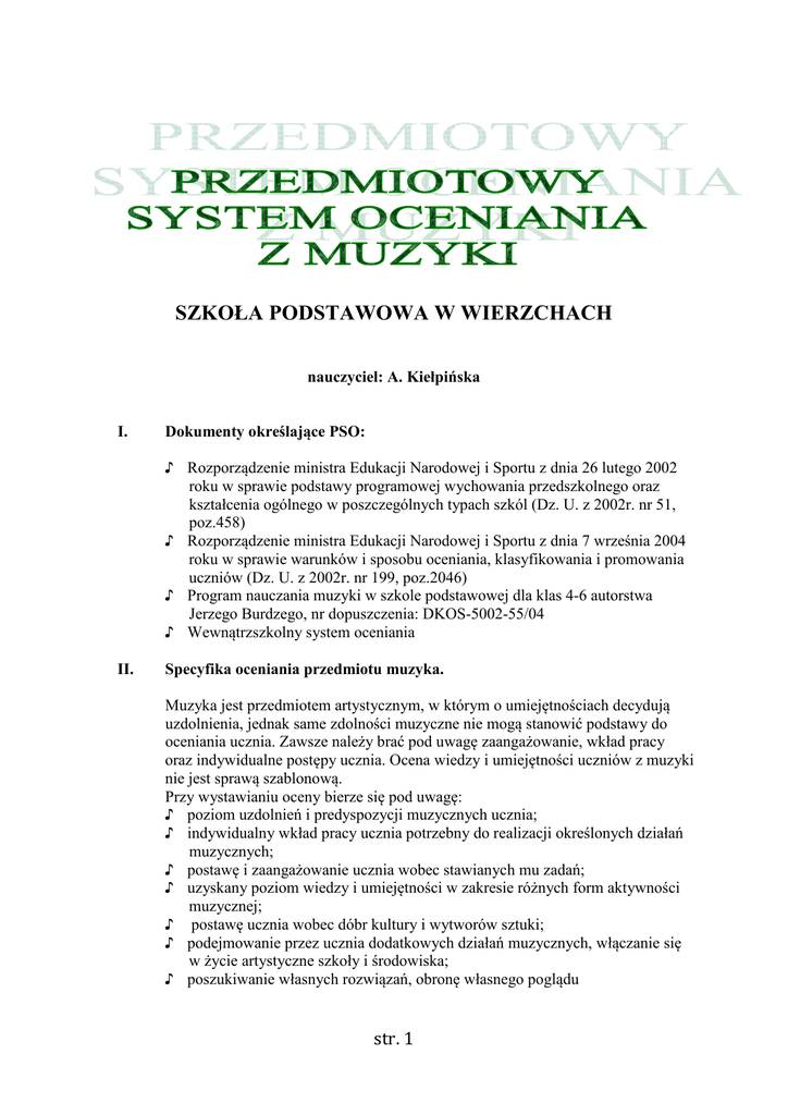 SZKOŁA PODSTAWOWA W WIERZCHACH nauczyciel: A. Kiełpińska I. Dokumenty określające PSO: ♪ Rozporządzenie ministra Edukacji Narodowej i Sportu z dnia 26 lutego 2002 roku w sprawie podstawy programowej wychowania przedszkolnego oraz kształcenia ogólnego w poszczególnych typach szkól (Dz. U. z 2002r. nr 51, poz.458) ♪ Rozporządzenie ministra Edukacji Narodowej i Sportu z dnia 7 września 2004 roku w sprawie warunków i sposobu oceniania, klasyfikowania i promowania uczniów (Dz. U. z 2002r. nr 199, poz.2046) ♪ Program nauczania muzyki w szkole podstawowej dla klas 4-6 autorstwa Jerzego Burdzego, nr dopuszczenia: DKOS-5002-55/04 ♪ Wewnątrzszkolny system oceniania II. Specyfika oceniania przedmiotu muzyka. Muzyka jest przedmiotem artystycznym, w którym o umiejętnościach decydują uzdolnienia, jednak same zdolności muzyczne nie mogą stanowić podstawy do oceniania ucznia. Zawsze należy brać pod uwagę zaangażowanie, wkład pracy oraz indywidualne postępy ucznia. Ocena wiedzy i umiejętności uczniów z muzyki nie jest sprawą szablonową. Przy wystawianiu oceny bierze się pod uwagę: ♪ poziom uzdolnień i predyspozycji muzycznych ucznia; ♪ indywidualny wkład pracy ucznia potrzebny do realizacji określonych działań muzycznych; ♪ postawę i zaangażowanie ucznia wobec stawianych mu zadań; ♪ uzyskany poziom wiedzy i umiejętności w zakresie różnych form aktywności muzycznej; ♪ postawę ucznia wobec dóbr kultury i wytworów sztuki; ♪ podejmowanie przez ucznia dodatkowych działań muzycznych, włączanie się w życie artystyczne szkoły i środowiska; ♪ poszukiwanie własnych rozwiązań, obronę własnego poglądu str. 1 III. Kontrakt z uczniami. ♪ Nie ocenia się ucznia po dłuższej nieobecności w szkole. ♪ Ocenie podlegają wszystkie obszary aktywności ucznia. ♪ Każdy uczeń powinien otrzymać w ciągu semestru minimum trzy oceny. ♪ Nauczyciel ma prawo dokonać sprawdzianu pisemnego, informując wcześniej uczniów o zakresie materiału objętego sprawdzianem. ♪ Krótkie sprawdziany mogą być nie zapowiadane. ♪ Uczeń powinien znać na pamięć tekst opracowywanych pieśni obowiązkowych. ♪ Podstawą oceny za śpiew, grę na instrumencie, odtwarzanie rytmów jest stopień zaangażowania i wysiłek włożony w przygotowanie odpowiedzi. ♪ Uczeń ma możliwość poprawy oceny niedostatecznej w ciągu dwóch tygodni, w indywidualnych przypadkach ( np.: dłuższa nieobecność) w terminie ustalonym przez nauczyciela. ♪ Każdy uczeń ma prawo do dodatkowej oceny za wykonane prace nadobowiązkowe. ♪ Uczeń mający kłopoty z opanowaniem materiału może zwrócić się do nauczyciela w celu ustalenia jaka forma wyrównania braków lub pokonania trudności będzie odpowiednia. ♪ Każdy uczeń ma prawo do zgłoszenia na początku lekcji nieprzygotowania jeden raz w ciągu jednego semestru. ♪ Nauczyciel obniża poziom wymagań przy pisemnej opinii Poradni PP stwierdzającej trudności w uczeniu się, uniemożliwiające sprostanie wymaganiom wynikającym z programu nauczania. ♪ Na koniec semestru nie przewiduje się sprawdzianu zaliczeniowego. I. Obszary aktywności. Na lekcjach muzyki oceniane są następujące obszary aktywności ucznia: ♪ Wykonywanie praktycznych ćwiczeń muzycznych: rytmicznych, melodycznych, ruchowych, słuchowych (np. wyklaskiwanie rytmu, śpiewanie wzorów melodycznych, realizację ruchową tematów muzycznych, określanie odległości interwałowych między dźwiękami) ♪ Aktywne działania w zakresie różnych form muzycznych: śpiewu solo, śpiewu w grupie, gry na instrumencie, słuchania muzyki, ruchu przy muzyce, twórczości muzycznej (np. śpiewanie pieśni i piosenek, kanonów - dwu, trzygłosowych, przyśpiewek ludowych, granie akompaniamentu, rozpoznawanie stylu muzycznego epoki w słuchanych utworach, brzmienia instrumentów i głosów ludzkich, budowy formalnej utworu, wykonywanie kroków i figur określonego tańca, tworzenie melodii, ilustracji muzycznych do tekstów wiersza) ♪ Odpowiedzi ustne z zakresu znajomości: zasad muzyki ( np. elementów muzyki, znaków chromatycznych, interwałów muzycznych, trójdźwięków, budowy gam majorowych i minorowych), historii muzyki (np. znajomość epok muzycznych, twórczości kompozytorów), form muzycznych ♪ Quizy, krzyżówki i konkursy muzyczne. ♪ Prace pisemne: sprawdziany, kartkówki. ♪ Prace domowe. ♪ Prace dodatkowe (np. referaty, prezentacje) str. 2 II. Kryteria oceniania: 1. Umiejętności w zakresie: ♪ Śpiew i nauka piosenki; ♪ Gra na instrumentach; ♪ Tworzenie muzyki; ♪ Ruch przy muzyce i taniec; ♪ Tworzenie wypowiedzi o muzyce, np. na temat wysłuchanych utworów 2. Wiedza o muzyce: ♪ Zagadnienia teoretyczne-znajomość podstawowych pojęć muzycznych i umiejętność ich stosowania w wypowiedziach o muzyce; ♪ wiadomości o kompozytorach; ♪ znajomość aparatu wykonawczego muzyki wokalnej i instrumentalnej (soliści, zespoły, chóry, orkiestry); ♪ opanowanie zagadnień z zakresu szeroko pojętej kultury muzycznej; 3. Postępy, zaangażowanie, wkład pracy w działania muzyczne: ♪ aktywność na lekcjach wynikająca z zainteresowania przedmiotem; ♪ umiejętność pracy w grupie – współpraca i wzajemna pomoc; ♪ prezentacja dokonań; ♪ kreatywność. III. Narzędzia pomiaru. 1. 2. 3. 4. 5. IV. Sprawdzian wiadomości – w zależności od potrzeb Odpowiedź ustna – może być jedna w semestrze Praca domowa – co najmniej jedna w semestrze. Aktywność ucznia na lekcji Aktywność ucznia pozalekcyjna. Kryteria oceny poszczególnych narzędzi pomiaru: 1. Ocena prac pisemnych: 0 – 29 % materiału - ocena niedostateczna 30 – 49 % materiału - ocena dopuszczająca 50 – 74 % materiału - ocena dostateczna 75 – 89 % materiału - ocena dobra 90 –100 % materiału - ocena bardzo dobra 100% materiału + zadanie na 6 – ocena celująca 2. Ocena odpowiedzi ustnych: ♪ samodzielna odpowie