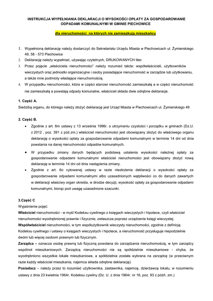 INSTRUKCJA WYPEŁNIANIA DEKLARACJI O WYSOKOŚCI OPŁATY ZA GOSPODAROWANIE ODPADAMI KOMUNALNYMI W GMINIE PIECHOWICE dla nieruchomości na których nie zamieszkują mieszkańcy 1. Wypełnioną deklarację należy dostarczyć do Sekretariatu Urzędu Miasta w Piechowicach ul. Żymierskiego 49, 58 - 573 Piechowice 2. Deklarację należy wypełniać, używając czytelnych, DRUKOWANYCH liter. 3. Przez pojęcie „właściciela nieruchomości” należy rozumieć także: współwłaścicieli, użytkowników wieczystych oraz jednostki organizacyjne i osoby posiadające nieruchomość w zarządzie lub użytkowaniu, a także inne podmioty władające nieruchomością. 4. W przypadku nieruchomości, która w części stanowi nieruchomość zamieszkałą a w części nieruchomość nie zamieszkałą a powstają odpady komunalne, właściciel składa dwie odrębne deklaracje. 1. Część A. Siedzibą organu, do którego należy złożyć deklarację jest Urząd Miasta w Piechowicach ul. Żymierskiego 49 2. Część B. Zgodnie z art. 6m ustawy z 13 września 1996r. o utrzymaniu czystości i porządku w gminach (Dz.U. z 2012 , poz. 391 z póź.zm.) właściciel nieruchomości jest obowiązany złożyć do właściwego organu deklarację o wysokości opłaty za gospodarowanie odpadami komunalnymi w terminie 14 dni od dnia powstania na danej nieruchomości odpadów komunalnych. W przypadku zmiany danych będących podstawą ustalenia wysokości należnej opłaty za gospodarowanie odpadami komunalnymi właściciel nieruchomości jest obowiązany złożyć nową deklarację w terminie 14 dni od dnia nastąpienia zmiany. Zgodnie z art. 6o cytowanej ustawy w razie niezłożenia deklaracji o wysokości opłaty za gospodarowanie odpadami komunalnymi albo uzasadnionych wątpliwości co do danych zawartych w deklaracji właściwy organ określa, w drodze decyzji, wysokość opłaty za gospodarowanie odpadami komunalnymi, biorąc pod uwagę uzasadnione szacunki. 3.Część C Wyjaśnienie pojęć: Właściciel nieruchomości - w myśl Kodeksu cywilnego o księgach wieczystych i hipotece, czyli właściciel nieruchomości wyodrębnionej prawnie i fizycznie, zwłaszcza poprzez urządzenie księgi wieczystej. Współwłaściciel nieruchomości, w tym współużytkownik wieczysty nieruchomości, zgodnie z definicją Kodeksu cywilnego i ustawy o księgach wieczystych i hipotece, a nieruchomość przysługuje niepodzielnie dwóm lub więcej osobom prawnym lub fizycznym. Zarządca – oznacza osobę prawną lub fizyczną powołana do zarządzania nieruchomością, w tym zarządcy wspólnot mieszkaniowych. Zarządcą nieruchomości nie są spółdzielnie mieszkaniowe - chyba, że wyodrębniono wszystkie lokale mieszkaniowe, a spółdzielnia została wybrana na zarządcę (w przeciwnym razie każdy właściciel mieszkania, najemca składa odrębne deklarację) Posiadacz – należy przez to rozumieć użytkownika, zastawnika, najemcę, dzierżawcę lokalu, w rozumieniu ustawy z dnia 23 kwietnia 1964r. Kodeksu cywilny (Dz. U. z dnia 1964r. nr 16, poz. 93 z późń. zm.) 4. Część D W przypadku składania deklaracji przez pełnomocnika – należy dołączyć pełnomocnictwo na piśmie i złożyć z deklaracją w oryginale lub formie uwierzytelnionego odpisu wraz z uiszczoną opłatą skarbową (17zł). Należy podać czy pełnomocnicy mogą działać samodzielnie czy też posiadają pełnomocnictwo łączne. 5. Część E Dla każdej nieruchomości należy złożyć odrębną deklarację. Przez zbieranie selektywne odpadów komunalnych na nieruchomości należy rozumieć odrębne zbieranie następujących frakcji odpadów: a) szkło – w osobnym pojemniku lub worku, koloru zielonego albo w pojemniku lub worku z napisem „szkło” (odbiór 1 raz na miesiąc z godnie z ustalonym harmonogramem ); b) odpady ulegające biodegradacji (odpady kuchenne i zielone) - w pojemniku lub worku koloru brązowego albo w worku koloru czarnego z napisem „bio” - (odbiór nie rzadziej niż raz na tydzień, w okresie od 1 kwietnia do 31 października, a w pozostałym okresie nie rzadziej niż raz na dwa tygodnie); c) odpady zmieszane – w pojemniku lub worku koloru czarnego albo w pojemniku lub worku z napisem „zmieszane”. (odbiór nie rzadziej niż raz na dwa tygodnie zgodnie z ustalonym harmonogramem z podmiotem uprawnionym); oraz nie mieszanie ich z odpadami wymienionymi w art. 4 ust. 2 pkt. 1 ppkt. a ustawy o utrzymaniu czystości i porządku w gminach tj. przeterminowanych leków i chemikaliów, zużytych baterii i akumulatorów, zużytego sprzętu elektrycznego i elektronicznego, mebli i innych odpadów wielkogabarytowych, odpadów budowlanych i rozbiórkowych, zużytych opon. Takie zbieranie spełnia wymóg selektywnej zbiórki odpadów do której ma zastosowanie niższa opłata od pojemnika. Dodatkowo bioodpady zamiast gromadzić w pojemniku lub w worku można poddać procesowi kompostowania w przydomowych kompostownikach. Przez kompostownik należy rozumieć specjalną skrzynkę lub pojemnik służące do kompostowania bioodpadów; nie jest kompostownikiem miejsce - pryzma na gruncie, na którym składowane są bioodpady. W przypadku zakreślenia wyboru selektywnej zbiórki odpadów lub gromadzenia bioodpaów w kompostowniku – będzie ona podlegała bieżącej kontroli. W przypadku nie wywiązania się z selektywnego zbierania odpadów komunalnych lub braku kompostownika organ w drodze decyzji nalicza opłatę za odpady zbierane w sposób nieselektywny. Niezależne od tego istnieje możliwość przekazywania odpadów komunalnych do punktów selektywnego zbierania odpadów komunalnych tzw. „gniazd”, zlokalizowanych na terenie gminy, w następujący sposób: a) do pojemników koloru niebieskiego – papier i opakowania wielomateriałowe; b) do pojemników koloru zielonego – szkło; c) do pojemników koloru żółtego oraz pojemników siatkowych – opakowania z tworzyw sztucznych i metale. Zgodnie z § 8 pkt. 1 Regula