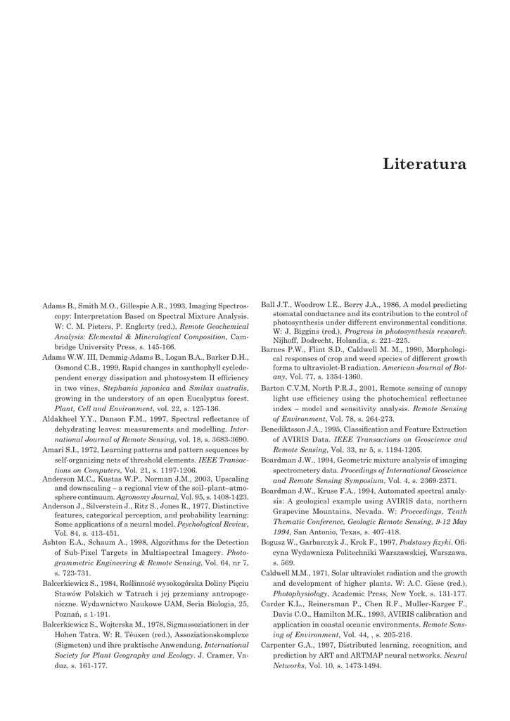 Literatura Adams B., Smith M.O., Gillespie A.R., 1993, Imaging Spectroscopy: Interpretation Based on Spectral Mixture Analysis. W: C. M. Pieters, P. Englerty (red.), Remote Geochemical Analysis: Elemental & Mineralogical Composition, Cambridge University Press, s. 145-166. Adams W.W. III, Demmig-Adams B., Logan B.A., Barker D.H., Osmond C.B., 1999, Rapid changes in xanthophyll cycledependent energy dissipation and photosystem II efficiency in two vines, Stephania japonica and Smilax australis, growing in the understory of an open Eucalyptus forest. Plant, Cell and Environment, vol. 22, s. 125-136. Aldakheel Y.Y., Danson F.M., 1997, Spectral reflectance of dehydrating leaves: measurements and modelling. International Journal of Remote Sensing, vol. 18, s. 3683-3690. Amari S.I., 1972, Learning patterns and pattern sequences by self-organizing nets of threshold elements. IEEE Transactions on Computers, Vol. 21, s. 1197-1206. Anderson M.C., Kustas W.P., Norman J.M., 2003, Upscaling and downscaling – a regional view of the soil–plant–atmosphere continuum. Agronomy Journal, Vol. 95, s. 1408-1423. Anderson J., Silverstein J., Ritz S., Jones R., 1977, Distinctive features, categorical perception, and probability learning: Some applications of a neural model. Psychological Review, Vol. 84, s. 413-451. Ashton E.A., Schaum A., 1998, Algorithms for the Detection of Sub-Pixel Targets in Multispectral Imagery. Photogrammetric Engineering & Remote Sensing, Vol. 64, nr 7, s. 723-731. Balcerkiewicz S., 1984, Roślinność wysokogórska Doliny Pięciu Stawów Polskich w Tatrach i jej przemiany antropogeniczne. Wydawnictwo Naukowe UAM, Seria Biologia, 25, Poznań, s 1-191. Balcerkiewicz S., Wojterska M., 1978, Sigmassoziationen in der Hohen Tatra. W: R. Tèuxen (red.), Assoziationskomplexe (Sigmeten) und ihre praktische Anwendung. International Society for Plant Geography and Ecology. J. Cramer, Vaduz, s. 161-177. Ball J.T., Woodrow I.E., Berry J.A., 1986, A model predicting stomatal conductance and its contribution to the control of photosynthesis under different environmental conditions. W: J. Biggins (red.), Progress in photosynthesis research. Nijhoff, Dodrecht, Holandia, s. 221–225. Barnes P.W., Flint S.D., Caldwell M. M., 1990, Morphological responses of crop and weed species of different growth forms to ultraviolet-B radiation. American Journal of Botany, Vol. 77, s. 1354-1360. Barton C.V.M, North P.R.J., 2001, Remote sensing of canopy light use efficiency using the photochemical reflectance index – model and sensitivity analysis. Remote Sensing of Environment, Vol. 78, s. 264-273. Benediktsson J.A., 1995, Classification and Feature Extraction of AVIRIS Data. IEEE Transactions on Geoscience and Remote Sensing, Vol. 33, nr 5, s. 1194-1205. Boardman J.W., 1994, Geometric mixture analysis of imaging spectrometery data. Procedings of International Geoscience and Remote Sensing Symposium, Vol. 4, s. 2369-2371. Boardman J.W., Kruse F.A., 1994, Automated spectral analysis: A geological example using AVIRIS data, northern Grapevine Mountains. Nevada. W: Proceedings, Tenth Thematic Conference, Geologic Remote Sensing, 9-12 May 1994, San Antonio, Texas, s. 407-418. Bogusz W., Garbarczyk J., Krok F., 1997, Podstawy fizyki. Oficyna Wydawnicza Politechniki Warszawskiej, Warszawa, s. 569. Caldwell M.M., 1971, Solar ultraviolet radiation and the growth and development of higher plants. W: A.C. Giese (red.), Photophysiology, Academic Press, New York, s. 131-177. Carder K.L., Reinersman P., Chen R.F., Muller-Karger F., Davis C.O., Hamilton M.K., 1993, AVIRIS calibration and application in coastal oceanic environments. Remote Sensing of Environment, Vol. 44, , s. 205-216. Carpenter G.A., 1997, Distributed learning, recognition, and prediction by ART and ARTMAP neural networks. Neural Networks, Vol. 10, s. 1473-1494. 106 Ocena przydatności sieci neuronowych i danych hiperspektralnych do klasyfikacji roślinności Tatr Wysokich Carpenter G.A., Grossberg S., 1987, A massively parallel architecture for a self organizing neural pattern recognition machine. Computer Vision, Graphics, and Image Processing, nr 37, s. 54-115. Carpenter G.A., Grossberg S., 1990, ART 3: Hierarchical search using chemical transmitters in self-organizing pattern recognition architectures. Neural Networks, Vol. 3, s. 129-152. Carpenter G.A., Grossberg S., 2003, Adaptive Resonance Theory. W: M.A. Arbib (red.), The Handbook of Brain Theory and Neural Networks, 2nd Edition. MIT Press, Cambridge, Mass.MA, s. 344. Carpenter G.A., Grossberg S., Markuzon N., Reynolds J.H., Rosen D.B., 1992, Fuzzy ARTMAP: A neural network architecture for incremental supervised learning of analog multidimensional maps. IEEE Transactions on Neural Networks, 3, s. 698-713. Carpenter G.A., Grossberg S., Reynolds J.H., 1991, ARTMAP: A self-organizing neural network architecture for fast supervised learning and pattern recognition. Neural Networks, Vol. 4, s. 565-588. Carpenter G.A., Grossberg S., Reynolds J.H., 1995, A Fuzzy ARTMAP Nonparametric Probability Estimator for Nonstationary Pattern Recognition Problems. IEEE Transactions on Neural Networks, Vol. 6, nr 6, s. 1330-1336. Carpenter G.A., Grossberg S., Rosen D.B., 1991, Fuzzy ART: Fast stable learning and categorization of analog patterns by an adaptive resonance system. Neural Networks, Vol. 4, s. 759-771. Carrère V., Conel J., 1993, Recovery of atmospheric water vapor total column abundance from imaging spectrometer data around 940 nm – Sensitivity analysis and application to Airborne Visible/Infrared Imaging Spectrometer (AVIRIS) data. Remote Sensing of Environment, Vol. 44, s. 179-204. Carter G.A., 1994, Ratios of leaf reflectance in narrow wavebands as indicators of plant stress. International Journal of Remote Sensing, Vol. 15, s. 697-703. Chang C.-I., 2003, Hyperspectral Imaging: Techniques for Spectral Detection and Classification. Kluwer Academic/ Plenum Publishers, New York, s. 374. Chang C.-I. D