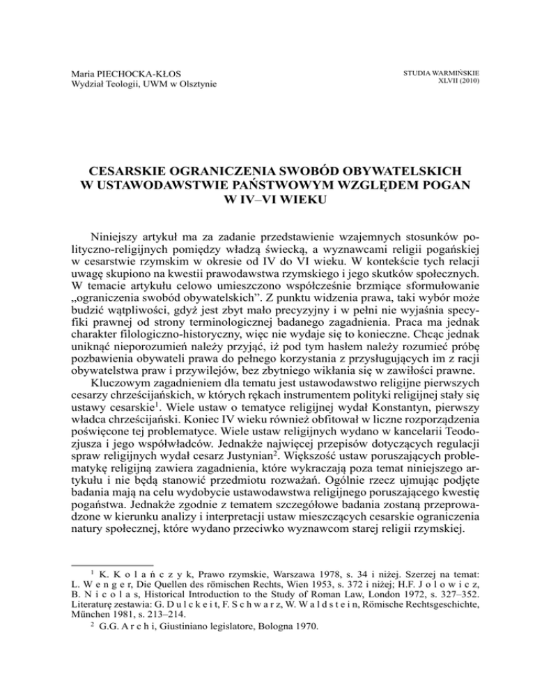 Maria PIECHOCKA-KŁOS Wydział Teologii, UWM w Olsztynie STUDIA WARMIŃSKIE XLVII (2010) cESARSKIE OgRANIczENIA SWObóD ObyWATElSKIcH W USTAWODAWSTWIE PAŃSTWOWyM WzglęDEM POgAN w iV–VI WIEKU Niniejszy artykuł ma za zadanie przedstawienie wzajemnych stosunków polityczno-religijnych pomiędzy władzą świecką, a wyznawcami religii pogańskiej w cesarstwie rzymskim w okresie od IV do VI wieku. W kontekście tych relacji uwagę skupiono na kwestii prawodawstwa rzymskiego i jego skutków społecznych. W temacie artykułu celowo umieszczono współcześnie brzmiące sformułowanie „ograniczenia swobód obywatelskich”. Z punktu widzenia prawa, taki wybór może budzić wątpliwości, gdyż jest zbyt mało precyzyjny i w pełni nie wyjaśnia specyfiki prawnej od strony terminologicznej badanego zagadnienia. Praca ma jednak charakter filologiczno-historyczny, więc nie wydaje się to konieczne. Chcąc jednak uniknąć nieporozumień należy przyjąć, iż pod tym hasłem należy rozumieć próbę pozbawienia obywateli prawa do pełnego korzystania z przysługujących im z racji obywatelstwa praw i przywilejów, bez zbytniego wikłania się w zawiłości prawne. Kluczowym zagadnieniem dla tematu jest ustawodawstwo religijne pierwszych cesarzy chrześcijańskich, w których rękach instrumentem polityki religijnej stały się ustawy cesarskie1. Wiele ustaw o tematyce religijnej wydał Konstantyn, pierwszy władca chrześcijański. Koniec IV wieku również obfitował w liczne rozporządzenia poświęcone tej problematyce. Wiele ustaw religijnych wydano w kancelarii Teodozjusza i jego współwładców. Jednakże najwięcej przepisów dotyczących regulacji spraw religijnych wydał cesarz Justynian2. Większość ustaw poruszających problematykę religijną zawiera zagadnienia, które wykraczają poza temat niniejszego artykułu i nie będą stanowić przedmiotu rozważań. Ogólnie rzecz ujmując podjęte badania mają na celu wydobycie ustawodawstwa religijnego poruszającego kwestię pogaństwa. Jednakże zgodnie z tematem szczegółowe badania zostaną przeprowadzone w kierunku analizy i interpretacji ustaw mieszczących cesarskie ograniczenia natury społecznej, które wydano przeciwko wyznawcom starej religii rzymskiej. 1 K. K o l a ń c z y k, Prawo rzymskie, Warszawa 1978, s. 34 i niżej. Szerzej na temat: L. W e n g e r, Die Quellen des römischen Rechts, Wien 1953, s. 372 i niżej; H.F. J o l o w i c z, B. N i c o l a s, Historical Introduction to the Study of Roman Law, London 1972, s. 327–352. Literaturę zestawia: G. D u l c k e i t, F. S c h w a r z, W. W a l d s t e i n, Römische Rechtsgeschichte, München 1981, s. 213–214. 2 G.G. A r c h i, Giustiniano legislatore, Bologna 1970. 80 MARIA PIECHOCKA-KŁOS W pierwszej kolejności analizie zostaną poddane rozporządzenia umieszczone w ogłoszonym w 438 roku Kodeksie Teodozjańskim3. W dalszej części z zachowaniem ram chronologicznych przeanalizowane zostaną akty prawne zawarte w zbiorze Nowel Poteodozjańskich, które datuję się na V wiek. Z tego samego okresu pochodzą również ustawy ze zbioru Constitutiones Sirmondianae4. Dużą grupę źródeł materiału badawczego stanowić będą rozporządzenia pochodzące z Kodeksu Justyniańskiego5. Jako ostanie poddane analizie zostaną ustawy ogłoszone jako Nowele przez Justyniana6. Prawodawstwo wymierzone w starą religię rzymską ma związek z chrystianizacją świata śródziemnomorskiego. Proces ten był jednak powolny, a nowa religia potrzebowała aż czterech wieków, aby jej wyznawcy zaczęli stanowić większość mieszkańców Imperium. Powolność w szerzeniu się chrześcijaństwa na terenie cesarstwa nie dziwi, bowiem przyjęcie chrześcijaństwa łączyło się z zerwaniem starego sposobu myślenia, działania i odczuwania. Mogło to nastąpić dopiero w wyniku przełomu spowodowanego gotowością ludzi do zmian. Chrześcijanie wówczas bytowali na marginesie własnych społeczności i często budzili niepokój7, zaś zdecydowana większość mieszkańców cesarstwa nadal praktykowała tradycyjny kult. Sytuacja ta zmieniła się w III wieku. W wyniku walki o władzę wewnątrz cesarstwa i ataków zewnętrznych na granice Imperium został obalony mit o rzymskiej niezwyciężoności. Pogłębiający się kryzys w państwie sprzyjał poszukiwaniom nowych bogów, którzy mogliby zapewnić spokój ducha i dobrobyt, jakim niegdyś cieszyli się ich przodkowie. Bez wątpienia jednak chrystianizacja Imperium była długim procesem, gdyż starożytnym z trudnością przychodziło rozstanie się ze starymi bogami i tradycjami pogańskimi. Przyjęcie nowej religii, której siłą i głównym fundamentem był bezkompromisowy monoteizm wymagało kilku wieków na głębokie przekształcenie starego sposobu myślenia i życia. Aż do połowy III wieku nie istniało coś, co można byłoby nazwać polityką cesarzy wobec Kościoła, jednak przyznanie się do wyznania chrześcijaństwa mogło być uznane za podstawę do wydania nawet wyroku śmierci. Najwierniejszych wyznawców pogaństwo posiadało wśród elity rządzącej państwem, czyli wśród senatorów i ekwitów. Bardzo trudno chrystianizacji ulegali także chłopi, którzy byli bardzo silnie przywiązani do tradycyjnego porządku moralnego i religijnego. Chrystianizacja Imperium kosztem starej rzymskiej religii zaczęła zdecydowanie szybciej postępować po nawróceniu na nową religię Konstantyna8. Ten krok cesarza przyniósł zmianę polityki państwa względem pogaństwa. Chrześcijaństwo powoli zaczęło zyskiwać ochronę prawną. Theodosiani Libri XVI cum Constitutionibus Sirmondianis, ed. Th. Mommsen, Berlin 1905. Constitutiones Sirmondianae w: Theodosiani Libri XVI, jw. 5 Codex Iustinianus, w: Corpus Iuris Civilis, ed. P. Krüger, t. 2, Berlin 1954. 6 Novellae, w: Corpus Iuris Civilis, ed. R. Schöll, G. Kroll, t. 3, Berlin 1905. 7 Wszelkiego rodzaju zarzuty i gwałtowne ataki kierowane przeciwko chr