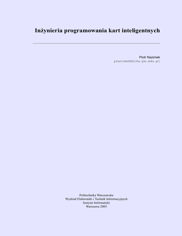 Inżynieria programowania kart inteligentnych Piotr Nazimek [email protected] Politechnika Warszawska Wydział Elektroniki i Technik Informacyjnych Instytut Informatyki Warszawa 2005 Inżynieria programowania kart inteligentnych Ksiażka ˛ ta przeznaczona jest dla osób pragnacych ˛ poznać tematyk˛e programowania kart procesorowych i tworzenia systemów informatycznych z ich wykorzystaniem. Zawiera ona przeglad ˛ interfejsów w różnych j˛ezykach programowania oraz najpopularniejszych systemów, których głównym elementem jest karta inteligentna. Wi˛ekszość prezentowanych problemów została opatrzona praktycznymi przykładami implementacji. Piotr Nazimek [email protected] W ksiażce ˛ użyto znaków towarowych. Pomini˛eto symbol znaku towarowego, wyst˛epujacy ˛ z zastrzeżona˛ nazwa˛ towaru. Użyto samej tylko nazwy, z taka˛ intencja˛ aby było to z korzyścia˛ dla właściciela znaku, bez zamiaru naruszania znaku towarowego. Nazwa taka zaczyna si˛e w tekście wielka˛ litera.˛ Utwór może być powielany i rozpowszechniany za pomoca˛ urzadzeń ˛ elektronicznych, mechanicznych, kopiujacych, ˛ nagrywajacych ˛ i innych bez pisemnej zgody posiadacza praw autorskich. Autor dołożył wszelkich starań, aby zapewnić najwyższa˛ jakość merytoryczna˛ tej publikacji. Autor nie jest jednak w żadnym wypadku odpowiedzialny za jakiekolwiek szkody b˛edace ˛ skutkiem wykorzystania informacji zawartych w tej ksiażce. ˛ ISBN 00-000-0000-0 wydanie pierwsze Podziekowania ˛ Dzi˛ekuj˛e Panu dr. inż. Jackowi Wytr˛ebowiczowi za pomysł oraz liczne uwagi krytyczne, zarówno podczas, jak i po zakończeniu pisania tej ksiażki. ˛ Bezcenny był również czas jaki poświ˛ecili mi dr Ryszard Kossowski i mgr inż. Grzegorz Wojtenko. Dzi˛ekuj˛e mojej Rodzinie, Przyjaciołom i Znajomym za to, że zawsze wspieraja˛ mnie w drodze, która˛ podażam. ˛ i Spis treści Wst˛ep . . . . . . . . . . . . . . . . . . . . . . . . . . . . . . . . . . . . . . . . . . . . . . . . . 1 1. Wprowadzenie . . . . . . . . . . 1.1. Rodzaje kart . . . . . . . . 1.1.1. Karty tłoczone . . 1.1.2. Karty magnetyczne 1.1.3. Karty elektroniczne 1.2. Karty z pami˛ecia˛ optyczna˛ . 1.3. Historia kart procesorowych 1.4. Obszary zastosowań . . . . Karty pami˛eciowe . . . . . Karty mikroprocesorowe . Karty bezstykowe . . . . . 1.5. Organizacje standaryzujace ˛ Uwagi bibliograficzne . . . . . . . . . . . . . . . . . . . . . . . . . . . . . . . . . . . . . . . . . . . . . . . . . . . . . . . . . . . . . . . . . . . . . . . . . . . . . . . . . . . . . . . . . . . . . . . . . . . . . . . . . . . . . . . . . . . . . . . . . . . . . . . . . . . . . . . . . . . . . . . . . . . . . . . . . . . . . . . . . . . . . . . . . . . . . . . . . . . . . . . . . . . . . . . . . . . . . . . . . . . . . . . . . . . . . . . . . . . . . . . . . . . . . . . . . . . . . . . . . . . . . . . . . . . . . . . . . . . . . . . . . . . . . . . . . . . . . . . . . . . . . . . . . . . . . . . . . . . . . . . . . . . . . . . . . . . . . . . . . . . . . . . . . . . . . . . . . . . . . . . . . . . . . . . . . . . . . . . . . . . . . . . . . . . . . . . . . . . . . . . . . . . . . . . . . . . . . . . . . . . . . . . . . . . . . . . . . . . . . . 2 2 2 2 2 4 4 4 4 4 5 5 5 2. Budowa kart elektronicznych . . . . . . . 2.1. Własności fizyczne . . . . . . . . . . 2.1.1. Wymiary kart . . . . . . . . . 2.1.2. Wyglad ˛ karty i zabezpieczenia 2.2. Własności elektryczne . . . . . . . . . 2.2.1. Styki . . . . . . . . . . . . . . 2.2.2. Aktywacja i dezaktywacja karty 2.3. Mikrokontrolery . . . . . . . . . . . . 2.3.1. Rodzaje procesorów . . . . . 2.3.2. Rodzaje pami˛eci . . . . . . . 2.3.3. Dodatkowy osprz˛et . . . . . . 2.4. Karty stykowe . . . . . . . . . . . . . 2.5. Karty bezstykowe . . . . . . . . . . . Uwagi bibliograficzne . . . . . . . . . . . . . . . . . . . . . . . . . . . . . . . . . . . . . . . . . . . . . . . . . . . . . . . . . . . . . . . . . . . . . . . . . . . . . . . . . . . . . . . . . . . . . . . . . . . . . . . . . . . . . . . . . . . . . . . . . . . . . . . . . . . . . . . . . . . . . . . . . . . . . . . . . . . . . . . . . . . . . . . . . . . . . . . . . . . . . . . . . . . . . . . . . . . . . . . . . . . . . . . . . . . . . . . . . . . . . . . . . . . . . . . . . . . . . . . . . . . . . . . . . . . . . . . . . . . . . . . . . . . . . . . . . . . . . . . . . . . . . . . . . . . . . . . . . . . . . . . . . . . . . . . . . . . . . . . . . . . . . . . . . . . . . . . . . . . . . . . . . . . . . . . . . . . . . . . . . . . . . . . . . . . . . . . 6 6 6 6 7 7 8 9 9 9 10 10 11 12 3. Transmisja danych . . . . . . . . . . . . . . . 3.1. Warstwa fizyczna . . . . . . . . . . . . . 3.2. Odpowiedź na zerowanie (ATR) . . . . . 3.2.1. Struktura ATR . . . . . . . . . . 3.2.2. Praktyczne przykłady ATR . . . 3.3. Wybór typu protokołu (PTS) . . . . . . 3.4. Protokoły transmisji danych . . . . . . . 3.4.1. Synchroniczna transmisja danych 3.4.2. Protokół T=0 . . . . . . . . . . . 3.4.3. Protokół T=1 . . . . . . . . . . . 3.4.4. Protokół T=2 . . . . . . . . . . . 3.5. APDU . . . . . . . . . . . . . . . . . . 3.5.1. Struktura rozkazu . . . . . . . . 3.5.2. Struktura odpowiedzi . . . . . . 3.6. Zabezpieczenie danych . . . . . . . . . . Tryb autentyczności . . . . . . . . . . . Tryb łaczony ˛ . . . . . . . . . . . . . . . Licznik rozkazów . . . . . . . . . . . . . 3.7. Kanały logiczne . . . . . . . . . . . . . Uwagi bibliograficzne . . . . . . . . . . . . . . . . . . . . . . . . . . . . . . . . . . . . . . . . . . . . . . . . . . . . . . . . . . . . . . . . . . . . . . . . . . . . . . . . . . . . . . . . . . . . . . . . . . . . . . . . . . . . . . . . . . . . . . . . . . . . . . . . . . . . . . . . . . . . . . . . . . . . . . . . . . . . . . . . . . . . . . . . . . . . . . . . . . . . . . . . . . . . . . . . . . . . . . . . . . . . . . . . . . . . . . . . . . . . . . . . . . . . . . . . . . . . . . . . . . . . . . . . . .