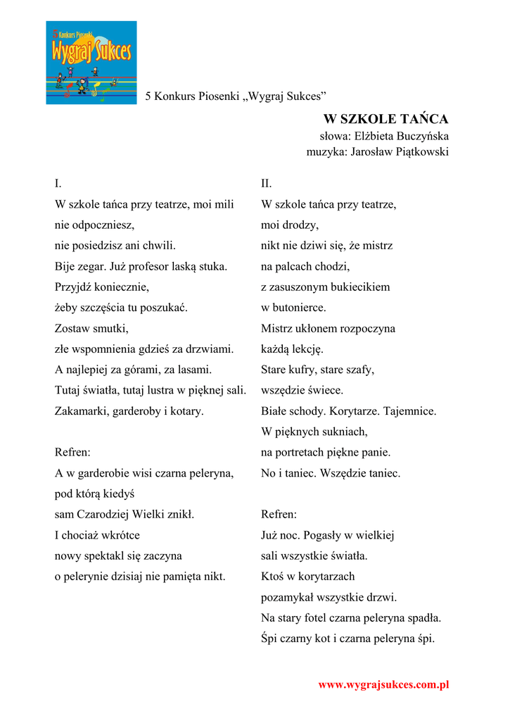5 Konkurs Piosenki „Wygraj Sukces” W SZKOLE TAŃCA słowa: Elżbieta Buczyńska muzyka: Jarosław Piątkowski I. II. W szkole tańca przy teatrze, moi mili W szkole tańca przy teatrze, nie odpoczniesz, moi drodzy, nie posiedzisz ani chwili. nikt nie dziwi się, że mistrz Bije zegar. Już profesor laską stuka. na palcach chodzi, Przyjdź koniecznie, z zasuszonym bukiecikiem żeby szczęścia tu poszukać. w butonierce. Zostaw smutki, Mistrz ukłonem rozpoczyna złe wspomnienia gdzieś za drzwiami. każdą lekcję. A najlepiej za górami, za lasami. Stare kufry, stare szafy, Tutaj światła, tutaj lustra w pięknej sali. wszędzie świece. Zakamarki, garderoby i kotary. Białe schody. Korytarze. Tajemnice. W pięknych sukniach, Refren: na portretach piękne panie. A w garderobie wisi czarna peleryna, No i taniec. Wszędzie taniec. pod którą kiedyś sam Czarodziej Wielki znikł. Refren: I chociaż wkrótce Już noc. Pogasły w wielkiej nowy spektakl się zaczyna sali wszystkie światła. o pelerynie dzisiaj nie pamięta nikt. Ktoś w korytarzach pozamykał wszystkie drzwi. Na stary fotel czarna peleryna spadła. Śpi czarny kot i czarna peleryna śpi. www.wygrajsukces.com.pl