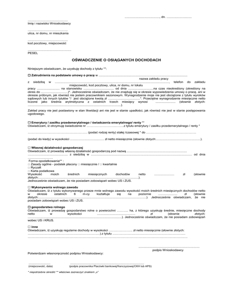........................................, dn. ............................. .............................................. Imię i nazwisko Wnioskodawcy .............................................. ulica, nr domu, nr mieszkania .............................................. kod pocztowy, miejscowość .................................................. PESEL OŚWIADCZENIE O OSIĄGANYCH DOCHODACH Niniejszym oświadczam, że uzyskuję dochody z tytułu **: Zatrudnienia na podstawie umowy o pracę w ...................................................................................................... nazwa zakładu pracy z siedzibą w ..................................................................................................................................., telefon do zakładu miejscowość, kod pocztowy, ulica, nr domu, nr lokalu pracy .......................... na stanowisku ................................... od dnia .............................na czas nieokreślony (określony na okres do ...............................)*. Jednocześnie oświadczam, że nie znajduję się w okresie wypowiedzenia umowy o pracę, ani w okresie próbnym, jak również nie jestem pracownikiem sezonowym. Wynagrodzenie moje nie jest obciążone z tytułu wyroków sądowych lub innych tytułów */ jest obciążone kwotą zł .....................................*. Przeciętne wynagrodzenie miesięczne netto liczone jako średnia arytmetyczna z ostatnich trzech miesięcy wynosi ....................... (słownie złotych: ...........................................................................................................). Zakład pracy nie jest postawiony w stan likwidacji ani nie jest w stanie upadłości, jak również nie jest w stanie postępowania ugodowego. Emerytury / zasiłku przedemerytalnego / świadczenia emerytalnego/ renty ** Oświadczam, iż otrzymuję świadczenie nr ……………………….……..z tytułu emerytury / zasiłku przedemerytalnego / renty * ………………………………………………… (podać rodzaj renty) stałej /czasowej * do ………………………………………… (podać do kiedy) w wysokości ....................................... zł netto miesięcznie (słownie złotych:...................................................). Własnej działalności gospodarczej Oświadczam, iż prowadzę własną działalność gospodarczą pod nazwą ..................................................................... .............................................. z siedzibą w .................................................................................................................... od dnia ............................. Forma opodatkowania** : Zasady ogólne - podatek płacony miesięcznie / kwartalnie Ryczałt Karta podatkowa Wysokość moich średnich miesięcznych dochodów netto ....................... zł (słownie złotych:...................................................................................................................). Jednocześnie oświadczam, że nie posiadam zobowiązań wobec US i ZUS. Wykonywania wolnego zawodu Oświadczam, iż z tytułu wykonywanego przeze mnie wolnego zawodu wysokość moich średnich miesięcznych dochodów netto w okresie ostatnich 6 m-cy kształtuje się na poziomie ...................... zł (słownie złotych:............................................................................................................................). Jednocześnie oświadczam, że nie posiadam zobowiązań wobec US i ZUS. gospodarstwa rolnego Oświadczam, iż prowadzę gospodarstwo rolne o powierzchni ……….. ha, z którego uzyskuję średnie, miesięczne dochody netto w wysokości ............................................ zł (słownie złotych: ............................................................................................................). Jednocześnie oświadczam, że nie posiadam zobowiązań wobec US i KRUS. inne Oświadczam, iż uzyskuję regularne dochody w wysokości ………………….. zł netto miesięcznie (słownie złotych: ……………………………………………………………).z tytułu ………………………………………….………………… ……………………………………………………………………………………………………………………………………… ...................................................................... podpis Wnioskodawcy Potwierdzam własnoręczność podpisu Wnioskodawcy: ......................... (miejscowość, data) ..................................................................................... (podpis pracownika Placówki bankowej/franczyzowej/CKH lub APS) * niepotrzebne skreślić ** właściwe zaznaczyć znakiem „x”