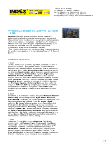 INDEX - Biuro Podróży, ul. Stawowa 5/7, 40-095 Katowice tel: 32 7818341, 32 7818340, 32 7817924 32 7817925, 32 2583524, 32 2097878 [email protected], www.indexpolska.com.pl WYCIECZKA SZKOLNA DO LONDYNU - SAMOLOT - 4 DNI: Londyn królewski, stolica imperium, potęgi morskiej i kolonialnej wciąż żyje pomiędzy nowoczesnymi biurowcami, klubami i centrami handlowymi, a stary Big Ben odlicza godziny obok znaku trzeciego tysiąclecia – London Eye. To miasto, w którym obok tego co tradycyjnie angielskie znajdziemy to, co najbardziej światowe, tworząc niepowtarzalny klimat. Zapraszamy w podróż po królewskim mieście. "Gdy człowiek jest zmęczony Londynem, jest zmęczony życiem, bo Londyn ma wszystko, co życie może zaoferować" dr Samuel Jonson RAMOWY PROGRAM: 1 dzień Zbiórka na lotnisku, spotkanie z pilotem, wylot do Londynu w godzinach rannych . przejazd do hotelu, zakwaterowanie. Przejazd komunikacją miejską do centrum, spacer po mieście i zwiedzanie. Przez Most Westminsterski przejdziemy wprost do dzielnicy Westminster, gdzie skupia się całość brytyjskiej władzy. Zobaczymy Parlament ze słynnym Big Benem, Opactwo Westminsterskie – nieprzerwanie od 950 lat miejsce koronacji wszystkich władców Anglii i Wielkiej Brytanii; ulicą Whitehall, tworzącą centrum dzielnicy rządowej, mijając Downing Street - siedzibę premierów brytyjskich, dotrzemy do Trafalgar Square z Kolumną Nelsona. Czas wolny na wizytę w National Gallery z imponującą kolekcją malarstwa europejskiego. Na koniec przejażdżka na London Eye największym na świecie diabelskim kole. Powrót do hotelu i nocleg. 2 dzień Śniadanie, c.d. zwiedzania miasta. Wizyta w Muzeum Historii Naturalnej. Następnie spacer od Hyde Parku do Pałacu Buckingham – dowiemy się co nam pozostawił Wellington oraz jak mieszka i pracuje królowa. Przez St. James's Park i dzielnicę St. James's (by sprawdzić czym dla Anglików jest tradycja i co dla tutejszej arystokracji znaczy prawdziwa elegancja) dotrzemy do Piccadilly Circus, gdzie zaczyna się londyński West End – dzielnica wszelkiej rozrywki, podzielona na Soho, Covent Garden i Chinatown. Tam każdy znajdzie coś dla ciała i dla ducha - najlepsze kina, rewie i teatry (w tym słynna Opera i Teatr Królewski) oraz kulinarna podróż na krańce świata. Powrót do hotelu, nocleg. 3 dzień śniadanie. Przejazd Do centrum Londynu. Zwiedzanie rozpoczniemy od Muzeum Figur Woskowych Maddame Tussaud's – to niepowtarzalna okazja by przytulić swojego ulubionego celebrytę. Zamiennie proponujemy wizytę w Museum of London, gdzie w interaktywny sposób można poznać historię i sekrety tego wyjątkowego miasta. Od St. Paul's Cathedral po twierdzę Tower of London rozciąga się the City - najstarsza część miasta, a obecnie dzielnica 1/3 londyńskiej finansjery. Twierdza Tower of London to świadek niemalże tysiącletniej historii miasta, pełniąca rozmaite funkcje od królewskiej rezydencji po królewskie więzienie; wizyta w Skarbcu Koronnym pozostawi niezapomniane wrażenia. Most Tower Bridge to z kolei jedna z architektonicznych ikon współczesnego Londynu. Rejs statkiem po Tamizie do Greenwich – kolebki morskiej potęgi Anglików, miejsca, gdzie wschód dosłownie spotyka się z zachodem. Powrót do hotelu. Nocleg. 4 dzień Śniadanie, wykwaterowanie. Przejazd do British Museum, gdzie podczas indywidualnego zwiedzania można odbyć prawdziwą podróż w czasie i przestrzeni, podziwiając zabytki kultury i sztuki powstałe w ciągu kilku tysięcy lat na wszystkich kontynentach. Na zakończenie Oxford Street, przy której znajdziemy największe domy towarowe, ponad 300 światowych marek i butiki mody, tworzące handlowe centrum Londynu. Przejazd na lotnisko. Przelot do Polski. ZAKWATEROWANIE: Hotel - np. hotel sieci Ibis, hotel Solomon - pokoje 3,4 osobowe z łazienkami CENA ZA OSOBĘ: Grupa 30 osób + 2 opiekunów - 1 669,00 zł* Grupa 40 osób + 3 opiekunów - 1 599,00 zł* Grupa 45 osób + 3 opiekunów - 1 569,00 zł* Uwaga - Cena kalkulowana jest wg aktualnie obowiązujących cen przelotów, z założeniem kosztu biletu 750 zł/os. CENA ZAWIERA: przelot tanimi liniami lotniczymi do Londynu/Luton , opłaty lotniskowe, opłata za 1 bagaż podręczny o wymiarach nieprzekraczających 42x32x25 (bagaż ten musi się mieścić pod siedzeniem przed pasażerem), 3 noclegi (pokoje 3,4-os. z łazienkami), 3 śniadania, opiekę pilota, ubezpieczenie Signal Iduna Travel, miejsca gratis dla opiekunów CENA NIE ZAWIERA: Kosztów wstępów oraz przejazdów komunikacją miejską transferów z/na lotnisko ok. 20 GBP/os. dopłat za obiadokolacje, koszt 1 obiadokolacji 60 zł Dopłat za bagaż (Jeśli wymiary bagażu podręcznego są większe niż wymiary małego bagażu podręcznego, ale nie przekraczają 56 x 45 x 25 cm, można zabrać go na pokład za określoną opłatą. Bagaż ten musi się mieścić w schowku nad siedzeniami pasażerów. Pasażer musi być w stanie osobiście umieścić bagaż w schowku.) UWAGI: Ceny biletów wstępu są cenami orientacyjnymi i mogą one ulec 2/3 zmianie niezależnie od Biura Podróży Index, dlatego prosimy o powiększenie funduszu na pokrycie ewentualnych podwyżek cen biletów. 3/3 Powered by TCPDF (www.tcpdf.org)