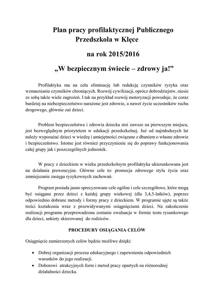 Plan pracy profilaktycznej Publicznego Przedszkola w Klęce na rok 2015/2016 „W bezpiecznym świecie – zdrowy ja!” Profilaktyka ma na celu eliminację lub redukcję czynników ryzyka oraz wzmacnianie czynników chroniących. Rozwój cywilizacji, oprócz dobrodziejstw, niesie ze sobą także wiele zagrożeń. I tak na przykład rozwój motoryzacji powoduje, że coraz bardziej na niebezpieczeństwo narażone jest zdrowie, a nawet życie uczestników ruchu drogowego, głównie zaś dzieci. Problem bezpieczeństwa i zdrowia dziecka stoi zawsze na pierwszym miejscu, jest bezwzględnym priorytetem w edukacji przedszkolnej. Już od najmłodszych lat należy wyposażać dzieci w wiedzę i umiejętności związane z dbaniem o własne zdrowie i bezpieczeństwo. Istotne jest również przyczynienie się do poprawy funkcjonowania całej grupy jak i poszczególnych jednostek. W pracy z dzieckiem w wieku przedszkolnym profilaktyka ukierunkowana jest na działania prewencyjne. Główne cele to: promocja zdrowego stylu życia oraz zmniejszanie zasięgu ryzykownych zachowań. Program posiada jasno sprecyzowane cele ogólne i cele szczegółowe, które mogą być osiągane przez dzieci z każdej grupy wiekowej (dla 3,4,5-latków), poprzez odpowiednio dobrane metody i formy pracy z dzieckiem. W programie ujęte są także treści kształcenia wraz z przewidywanymi osiągnięciami dzieci. Na zakończenie realizacji programu przeprowadzona zostanie ewaluacja w formie testu rysunkowego dla dzieci, ankiety skierowanej do rodziców. PROCEDURY OSIĄGANIA CELÓW Osiągnięcie zamierzonych celów będzie możliwe dzięki: Dobrej organizacji procesu edukacyjnego i zapewnieniu odpowiednich warunków do jego realizacji. Doborowi atrakcyjnych form i metod pracy opartych na różnorodnej działalności dziecka. Tworzeniu sytuacji umożliwiających zdobycie wiedzy i umiejętności w zakresie dbania o własne bezpieczeństwo i zdrowie np. poprzez spotkania z różnymi osobami: - policjantem: na temat bezpiecznego poruszania się na drodze; ograniczonego zaufania do obcych; sposobów informowania o niebezpiecznym zdarzeniu; - lekarzem lub pielęgniarką: na temat zapobiegania wypadkom domowym; profilaktyki chorób; prawidłowej postawy ciała; racjonalnego odżywiania; - osobami, które propagują i prowadzą zdrowy tryb życia - dentystą na temat dbania o higienę jamy ustnej - strażakiem: na temat przeciwdziałania bezmyślnym zabawom: wodą, zapałkami, urządzeniami mogącymi wywołać pożar (zapalniczką, kuchenką gazową lub elektryczną, grzejnikiem itp.); - psychologiem i pedagogiem - na temat zagrożeń ze strony dorosłych, CELE GŁÓWNE: 1. Wyposażenie dzieci w niezbędne sprawności, umiejętności i wiadomości dotyczące dbania o własne zdrowie (zarówno psychiczne jak i fizyczne) i bezpieczeństwo. 2. Upowszechnienie wiedzy o zdrowiu i właściwych zachowaniach jemu służących oraz promocja zdrowego stylu życia. 3. Kształtowanie osobowości dziecka i wspieranie jego rozwoju. CELE SZCZEGÓŁOWE: Dziecko przestrzega określonych zasad dotyczących bezpieczeństwa podczas pobytu w przedszkolu /w sali, na podwórku, w łazience, podczas zajęć, itp./. Nabywa umiejętność bezpiecznego poruszania się na terenie przedszkola i ogrodu przedszkolnego. Orientuje się w bezpiecznym poruszaniu się po drogach i korzystaniu ze środków transportu. Jest uwrażliwiane na potrzebę ochrony życia i zdrowia własnego i kolegów. Wie, jak trzeba zachować się w sytuacji zagrożenia, gdzie można prosić o pomoc, umie o nią prosić. Dba o higienę osobistą. Dba o higienę jamy ustnej. Rozumie potrzebę pobytu na świeżym powietrzu bez względu na porę roku. Zna sposoby zapobiegania chorobom. Zna zasady zdrowego odżywiania. Unika zagrożeń płynących z prowadzenia zabaw w niedozwolonych miejscach, zabaw zapałkami, ostrymi narzędziami i innymi niebezpiecznymi przedmiotami. Buduje poczucie własnej wartości i wiary w siebie. Uczy się postawy ograniczonego zaufania wobec " obcych" osób. Niniejszy program został podzielony na następujące bloki tematyczne: 1. W bezpiecznym świecie… 2. Zdrowy ja! Treści kształcenia, zgodne są z realizowanymi w poszczególnych obszarach celami wychowania przedszkolnego tj.: Budowanie systemu wartości; Kształtowanie odporności emocjonalnej; Rozwijanie umiejętności społecznych; Troska o zdrowie dzieci i ich sprawność fizyczną; Kształtowanie u dzieci poczucia przynależności społecznej. TREŚCI KSZTAŁCENIA I W BEZPIECZNYM ŚWIECIE… 1. 2. 3. 4. Bezpieczne przedszkole. Bezpieczny na drodze. Policjant, strażak – przyjaciel dzieci. Nie rozmawiam z obcymi. II …ZDROWY JA! 1. Co zrobić żeby być zdrowym. 2. Jak mnie widzą, tak mnie piszą. 3. W zdrowym ciele zdrowy duch. ROZKŁAD TREŚCI KSZTAŁCENIA WRAZ Z CELAMI OPERACYJNYM I W BEZPIECZNYM ŚWIECIE… 1. Bezpieczne przedszkole. Potrafi przewidywać i unikać zagrożeń w pomieszczeniach placówki. Identyfikuje osoby, które mogą mu pomóc na terenie placówki. Umie właściwie korzystać ze sprzętu w ogrodzie przedszkolnym, zgodnie z jego przeznaczeniem. Wie, jak zachować się w razie skaleczeń i urazów. Wie, jak należy korzystać z nożyczek i innych przedmiotów wykorzystywanych podczas zajęć. Wie, że należy się bawić w miejscach do tego przeznaczonych. Wie, że nie należy bawić się nieznanymi przedmiotami, narzędziami, lekarstwami czy substancjami. 2. Bezpieczny na drodze. Umie przechodzić przez jezdnię w miejscu nieoznaczonym i na pasach. Porusza się bezpiecznie w grupie podczas spacerów i wycieczek. Zna rodzaje środków transportu. Zna znaczenie elementów odblaskowych. Zna zasady bezpiecznego korzystania ze środków transportu prywatnego (fotelik dla dziecka, zapinanie pasów przez dorosłych; wsiadanie i wysiadanie od strony chodnika). Zna pojazdy uprzywilejowane. Wie jak korzystać ze środków komunikacji publicznej (właściwe zachowanie się na przystanku, podcz