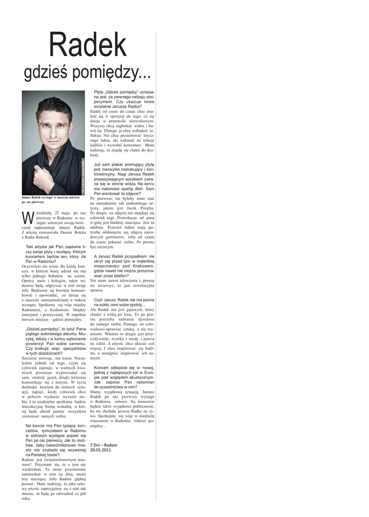 Radek gdzieś pomiędzy... Fot. archiwum Janusza Radka Płyta „Gdzieś pomiędzy” uznawana jest za pewnego rodzaju eksperyment. Czy ukazuje nowe wcielenie Janusza Radka? Radek od czasu do czasu chce znaleźć się w opozycji do tego, co się dzieje w przemyśle rozrywkowym. Wszyscy chcą zagłaskać widza i bawić się. Dlatego ja chcę wzbudzić refleksje. Nie chcę prezentować lirycznego lukru, ale wskazać na relacje ludzkie i wywołać komentarz. Mam nadzieję, że znajdą się chętni do dyskusji. Janusz Radek wystąpi w naszym mieście po raz pierwszy niedzielę, 22 maja, po raz pierwszy w Radomiu w występie solowym swoją twórczość zaprezentuje Janusz Radek. Z artystą rozmawiała Dorota Rokita z Radia Rekord. W Taki artysta jak Pan, zapewne liczy swoje płyty i występy. Którym koncertem będzie ten, który da Pan w Radomiu? Oczywiście nie wiem. Bo każdy koncert, w którym biorę udział nie ma tylko jednego bohatera na scenie. Oprócz mnie i kolegów, także widzowie będą odgrywać w nim swoje role. Będziemy się bowiem komunikować i opowiadać, co dzieje się z naszymi namiętnościami w trakcie występu. Spotkamy się więc między Radomiem, a Krakowem. Między emocjami i przeżyciami. W zupełnie nowym miejscu – gdzieś pomiędzy. „Gdzieś pomiędzy”, to tytuł Pana piątego autorskiego albumu. Muzykę, teksty i w końcu wykonanie powierzył Pan sobie samemu. Czy brakuje więc specjalistów w tych dziedzinach? Szczerze mówiąc, nie wiem. Niezależnie jednak od tego, czym się człowiek zajmuje, w ważnych kwestiach powinien wypowiadać się sam, znaleźć język, dzięki któremu komunikuje się z innymi. W życiu dochodzi bowiem do różnych sytuacji, napięć, kiedy człowiek chce w pełnym wydaniu wyrazić siebie. I to niedzielne spotkanie będzie interakcyjną formą wokalną, w której będę chciał pomóc wszystkim zrozumieć samych siebie. Na koncie ma Pan tysiące koncertów, tymczasem w Radomiu w solowym występie pojawi się Pan po raz pierwszy. Jak to możliwe, żeby ćwierćmilionowe miasto nie znalazło się wcześniej na Pańskiej trasie? Radom jest ćwierćmilionowym miastem?. Przyznam się, że o tym nie wiedziałem. To może powinienem zamieszkać w nim na dwa, może trzy miesiące, żeby Radom głębiej poznać. Mam nadzieję, że jako solowy artysta zaprzyjaźnię się z nim tak mocno, że będę go odwiedzał co pół roku. Już sam plakat promujący płytę jest niezwykle zaskakujący i kontrowersyjny. Nagi Janusz Radek przeszywającym wzrokiem zwraca się w stronę widza. Na sercu ma natomiast opartą dłoń. Sam Pan aranżował to zdjęcie? Po pierwsze, nie byłoby mnie stać na zatrudnienie tak znakomitego artysty, jakim jest Jacek Poręba. Po drugie, na zdjęciu nie znajduje się człowiek nagi. Prowokacja od pasa w górę jest bardziej znacząca. Jest to odsłona. Przecież ludzie mają potrzebę odsłonięcia się, zdjęcia zawodowych garniturów, żeby od czasu do czasu pokazać siebie. Po prostu być szczerym. A Janusz Radek przypadkiem nie ukrył się przed tym w maleńkiej miejscowości pod Krakowem, gdzie nawet nie można porozmawiać przez telefon? Nie mam nawet telewizora i, proszę mi uwierzyć, to jest rewelacyjna sprawa. Czyli Janusz Radek nie ma parcia na szkło, ceni sobie spokój... Ale Radek nie jest gajowym, który chodzi z witką po lesie. To po prostu potrzeba nabrania dystansu do samego siebie. Pomaga on człowiekowi uprawiać sztukę, a nie rzemiosło. Właśnie to drugie jest przewidywalne, wynika z mody i parcia na szkło. A artysta chce ukazać coś więcej. I chce inspirować się ludźmi, a następnie inspirować ich samych. Koncert odbędzie się w nowej, jednej z najlepszych sal w Europie pod względem akustycznym. Jak zaprosi Pan radomian do uczestnictwa w nim? Mamy wyjątkową sytuację. Janusz Radek po raz pierwszy wystąpi w Radomiu solowo. Na koncercie będzie także wyjątkowa publiczność, bo nie słuchała jeszcze Radka na żywo. Spotkajmy się więc w niedzielę wieczorem w Radomiu. Gdzieś pomiędzy... 7 Dni – Radom 20.05.2011