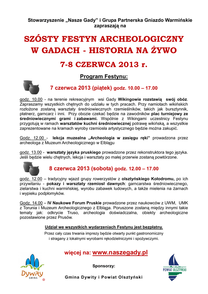 Stowarzyszenie „Nasze Gady” i Grupa Partnerska Gniazdo Warmińskie zapraszają na SZÓSTY FESTYN ARCHEOLOGICZNY W GADACH - HISTORIA NA ŻYWO 7-8 CZERWCA 2013 r. Program Festynu: 7 czerwca 2013 (piątek) godz. 10.00 – 17.00 godz. 10.00 - na terenie rekreacyjnym wsi Gady Wikingowie rozstawią swój obóz. Zapraszamy wszystkich chętnych do udziału w tych pracach. Przy namiotach wikińskich rozłożone zostaną warsztaty średniowiecznych rzemieślników, takich jak bursztynnik, płatnerz, garncarz i inni. Przy obozie czekać będzie na zawodników plac turniejowy ze średniowiecznymi grami i zabawami. Wspólnie z Wikingami uczestnicy Festynu przygotują w ramach warsztatów kuchni średniowiecznej potrawę wikińską, a wszystkie zaprezentowane na kramach wyroby rzemiosła artystycznego będzie można zakupić. Godz. 12.00 - lekcja muzealna „Archeologia w zasięgu ręki” prowadzona przez archeologa z Muzeum Archeologicznego w Elblągu godz. 13.00 - warsztaty języka pruskiego prowadzone przez rekonstruktora tego języka. Jeśli będzie wielu chętnych, lekcja i warsztaty po małej przerwie zostaną powtórzone. 8 czerwca 2013 (sobota) godz. 12.00 – 17.00 godz. 12.00 – tradycyjny wjazd grupy rowerzystów z olsztyńskiego Kołodromu, po ich przywitaniu - pokazy i warsztaty rzemiosł dawnych: garncarstwa średniowiecznego, zielarstwa i kuchni warmińskiej, wyrobu zabawek ludowych, a także mielenia na żarnach i wypieku podpłomyków. Godz. 14.00 – IV Naukowe Forum Pruskie prowadzone przez naukowców z UWM, UMK z Torunia i Muzeum Archeologicznego z Elbląga. Poruszone zostaną między innymi takie tematy jak: odkrycie Truso, archeologia doświadczalna, obiekty archeologiczne pozostawione przez Prusów. Udział we wszystkich wydarzeniach Festynu jest bezpłatny. Przez cały czas trwania imprezy będzie otwarty punkt gastronomiczny i stragany z lokalnymi wyrobami rękodzielniczymi i spożywczymi. więcej na: www.naszegady.pl Sponsorzy: Gmina Dyw ity i Powiat Olsztyński