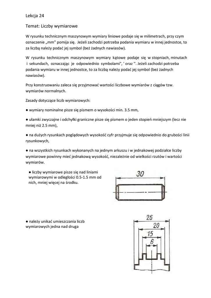 Lekcja 24 Temat: Liczby wymiarowe W rysunku technicznym maszynowym wymiary liniowe podaje się w milimetrach, przy czym oznaczenie „mm” pomija się. Jeżeli zachodzi potrzeba podania wymiaru w innej jednostce, to za liczbą należy podać jej symbol (beż żadnych nawiasów). W rysunku technicznym maszynowym wymiary kątowe podaje się w stopniach, minutach i sekundach, oznaczając je odpowiednio symbolami°, ' oraz ''. Jeżeli zachodzi potrzeba podania wymiaru w innej jednostce, to za liczbą należy podać jej symbol (beż żadnych nawiasów). Przy konstruowaniu zaleca się przyjmować wartości liczbowe wymiarów z ciągów tzw. wymiarów normalnych. Zasady dotyczące liczb wymiarowych: ● wymiary nominalne pisze się pismem o wysokości min. 3.5 mm, ● ułamki zwyczajne i odchyłki graniczne pisze się pismem o jeden stopień mniejszym (lecz nie mniej niż 2.5 mm), ● na dużych rysunkach poglądowych wysokość cyfr przyjmuje się odpowiednio do grubości linii rysunkowych, ● na wszystkich rysunkach wykonanych na jednym arkuszu i w jednakowej podziałce liczby wymiarowe powinny mieć jednakową wysokość, niezależnie od wielkości rzutów i wartości wymiarów. ● liczby wymiarowe pisze się nad liniami wymiarowymi w odległości 0.5-1.5 mm od nich, mniej więcej na środku. ● należy unikać umieszczania liczb wymiarowych jedna nad druga . ● jeżeli linia wymiarowa jest krótka, to liczbę wymiarową można napisać nad jej przedłużeniem (najlepiej z prawej strony). ● liczby wymiarowe małych wymiarów pisze się – gdy brak jest miejsca – nad liniami odniesienia. ● należy unikać umieszczania liczb wymiarowych na liniach zarysu przedmiotu, osiach i liniach kreskowania przekrojów. Jeżeli jest to konieczne, to trzeba w miejscach, gdzie mają być napisane liczby wymiarowe lub narysowane groty, przerwać linię rysunku. ● przy wymiarowaniu długości przedmiotu przerwanego na rysunku, linii wymiarowej nie przerywa się. ● gdy liczba wymiarowa nie odpowiada podziałce rysunkowej, to tę liczbą należy na rysunku podkreślić. ● wymiary nominalne, których na rysunkach nie toleruje się, ujmuje się w ramki prostokątne.