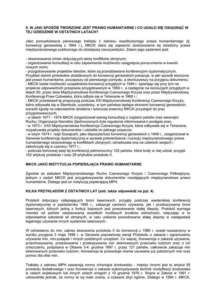 9. W JAKI SPOSÓB TWORZONE JEST PRAWO HUMANITARNE I CO UDAŁO SIĘ OSIĄGNĄĆ W TEJ DZIEDZINIE W OSTATNICH LATACH? Jako pomysłodawca pierwszego traktatu z zakresu współczesnego prawa humanitarnego (tj. konwencji genewskiej z 1864 r.), MKCK stara się zapewnić dostosowanie tej dziedziny prawa międzynarodowego publicznego do dzisiejszej rzeczywistości. Zatem jego zadaniem jest: - obserwowanie zmian dotyczących istoty konfliktów zbrojnych; - organizowanie konsultacji w celu zapewnienia możliwości osiągnięcia porozumienia w kwestii nowych norm; - przygotowywanie projektów tekstów, które są przedstawiane konferencjom dyplomatycznym. Przykład dwóch protokołów dodatkowych do konwencji genewskich pokazuje, w jaki sposób tworzone jest prawo humanitarne, począwszy od pierwszego pomysłu, a skończywszy na przyjęciu dokumentu: - MKCK badał możliwość uzupełnienia konwencji przyjętych w 1949 r. opierając się przy tym na projekcie odpowiednich przepisów przygotowanym w 1956 r., a następnie na rezolucjach przyjętych w latach 60. przez dwie Międzynarodowe Konferencje Czerwonego Krzyża oraz przez Międzynarodową Konferencję Praw Człowieka, która odbyła się w Teheranie w 1968 r.; - MKCK przedstawił tę propozycję podczas XXI Międzynarodowej Konferencji Czerwonego Krzyża, która odbywała się w Stambule; uczestnicy, w tym państwa będące stronami konwencji genewskich, wyrazili zgodę na odpowiednie działania i wówczas prawnicy MKCK przystąpili do prac przygotowawczych; - w latach 1971 - 1974 MKCK zorganizował szereg konsultacji z rządami państw oraz wewnątrz Ruchu; Organizacja Narodów Zjednoczonych była regularnie informowana o postępie prac; - w 1973 r. XXII Międzynarodowa Konferencja Czerwonego Krzyża, która odbywała się w Teheranie, rozpatrywała projekty dokumentów i udzieliła im pełnego poparcia; - w lutym 1974 r. rząd Szwajcarii, jako depozytariusz konwencji genewskich z 1949 r., zorganizował w Genewie konferencję dyplomatyczną w sprawie potwierdzenia i rozwoju międzynarodowego prawa humanitarnego stosowanego w konfliktach zbrojnych; obradowała ona na czterech sesjach i zakończyła się w czerwcu 1977 r.; - podczas końcowej sesji tej konferencji pełnomocnicy 102 państw, które brały w niej udział, przyjęli 102 artykuły protokołu I oraz 28 artykułów protokołu II. MKCK JAKO INSTYTUCJA POPIERAJĄCA PRAWO HUMANITARNE Zgodnie ze statutem Międzynarodowego Ruchu Czerwonego Krzyża i Czerwonego Półksiężyca, jednym z zadań MKCK jest przygotowywanie dokumentów rozwijających międzynarodowe prawo humanitarne. Dlatego jest on instytucją popierającą MPH. KILKA PRZYKŁADÓW Z OSTATNICH LAT (zob. także odpowiedź na pyt. 4) Protokół dotyczący oślepiających broni laserowych, przyjęty podczas wiedeńskiej konferencji dyplomatycznej w październiku 1995 r., zakazuje zarówno używania, jak i przekazywania broni laserowych, których jedną z funkcji bojowych jest powodowanie stałej ślepoty. Protokół wymaga również od państw zastosowania wszelkich możliwych środków ostrożności, włączając w to odpowiednie szkolenie sił zbrojnych, w celu unikania powodowania stałej ślepoty w następstwie legalnego używania innych systemów laserowych. W odniesieniu do min, zakres stosowania protokołu II do konwencji z 1980 r. został rozszerzony w wyniku przyjęcia 3 maja 1996 r. w Genewie poprawionej wersji Protokołu o zakazie i ograniczeniu używania min, min-pułapek i innych podobnych urządzeń. Co więcej, Konwencja o zakazie używania, przechowywania, produkowania i przekazywania min skierowanych przeciwko ludziom oraz o ich zniszczeniu, podpisana w Ottawie 3-4. grudnia 1997 r. przez 121 państw, całkowicie zakazuje min skierowanych przeciwko ludziom. Konwencja ta przewiduje równie usuwanie już położonych min oraz pomoc dla ofiar min. Traktaty z zakresu MPH zawierają normy chroniące środowisko - między innymi jest to artykuł 55 protokołu dodatkowego I oraz Konwencja o zakazie wykorzystywania technik modyfikacji środowiska w celach wojskowych lub innych celach wrogich z 10 grudnia 1976 r. Wojna w Zatoce w 1991 r. udowodniła jednak, że normy te są mało znane, a czasami zbyt ogólne. Dlatego w 1994 r. MKCK, mając poparcie Zgromadzenia Ogólnego NZ i korzystając z pomocy odpowiednich ekspertów, przygotował Wytyczne do podręczników wojskowych oraz szkolenia wojskowego na temat ochrony środowiska w czasie konfliktu zbrojnego. Innym dokumentem z ostatnich lat jest podręcznik z San Remo na temat prawa międzynarodowego mającego zastosowanie podczas konfliktów zbrojnych na morzu. Znaczenie tego przedsięwzięcia, którego autorem jest Międzynarodowy Instytut Prawa Humanitarnego wspierany przez MKCK, zostało uznane przez rządy państw, które podczas XXVI Międzynarodowej Konferencji Czerwonego Krzyża i Czerwonego Półksiężyca odbywającej się w Genewie w 1995 r., przyjęły specjalną rezolucję w tym zakresie. Chociaż konwencje genewskie i protokoły dodatkowe nie zakazują w sposób wyraźny używania broni jądrowej, to w takich przypadkach należy stosować ogólne zasady MPH. Zgodnie z tymi zasadami, strony wojujące zawsze muszą - między innymi - dokonywać rozróżnienia między kombatantami a osobami, które nie biorą udziału w walce. Zakazane jest także używanie broni mogących spowodować zbędne cierpienia. Międzynarodowy Trybuna Sprawiedliwości w Hadze potwierdzi w 1996 r., że zasady te należy stosować również do broni jądrowej.
