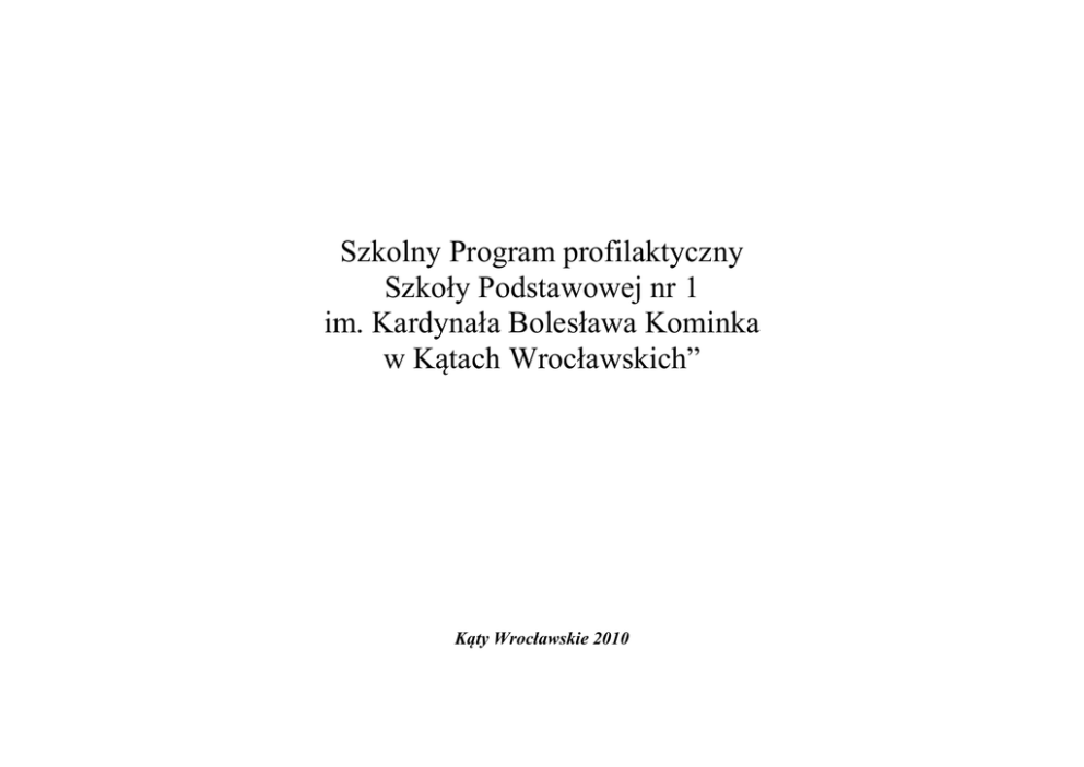 Szkolny Program profilaktyczny Szkoły Podstawowej nr 1 im. Kardynała Bolesława Kominka w Kątach Wrocławskich” Kąty Wrocławskie 2010 Wstęp „Profilaktykę rozumie się jako proces wspierający zdrowie psychiczne i fizyczne poprzez pomoc i towarzyszenie uczniowi w zdobywaniu wiedzy o zagrożeniach dla zdrowia oraz w nabywaniu umiejętności przeciwdziałania tym zagrożeniom.” Jej celem jest ochrona człowieka, dziecka, ucznia, wychowanka przed wszelkimi zagrożeniami rozwoju. Na pozór może się wydawać, że wszelkie zagrożenia czyhają na człowieka w świecie zewnętrznym, gdy w istocie to sam człowiek dokonuje takich wyborów, które zakłócają jego rozwój. Zagrożeniem dla prawidłowości tego procesu jest niewiedza i niedoświadczenie młodego człowieka oraz brak umiejętności przewidywania skutków zachowań ryzykownych czy popełnionych błędów. Człowiek niedojrzały więc sam dla siebie może być zagrożeniem. Dlatego prowadzenie dziecka ku dojrzałości jest zarówno wychowaniem, jak i profilaktyką. Zadaniem szkolnej profilaktyki jest chronienie dzieci przed zagrożeniami przez działania wychowawczo-profilaktyczne, a także reagowanie w sytuacji rozpoznania pierwszych prób podejmowania zachowań ryzykownych poprzez odwoływanie się do specjalistycznej pomocy. Jest to więc ogół działań podejmowanych w czasie realizacji programów nauczania, programu wychowawczego, a także działania specyficzne dla profilaktyki. Szkolny program profilaktyczny stawia sobie za cel chronienie młodego człowieka przed szeroko pojętymi zagrożeniami poprzez uświadomienie, co stanowi zagrożenie dla jego rozwoju, kształtowanie umiejętności przewidywania konsekwencji niewłaściwych i ryzykownych zachowań, dokonywania rozważnych i pożądanych wyborów oraz roztropnego podejmowania decyzji, a także poprzez nauczanie asertywności. Realizacja tych celów wymaga intensywnej współpracy wielu podmiotów – uczniów, rodziców, nauczycieli i wszystkich pracowników szkoły, a także wsparcia ze strony instytucji zewnętrznych. Największe jednak zadanie w profilaktyce mają rodzice, wychowawca i pedagog jako osoby przebywające najbliżej dziecka i mogące najszybciej dostrzec negatywne symptomy będące oznaką, że dzieje się z nim coś złego. Na tych właśnie osobach spoczywa największa odpowiedzialność za prawidłowy rozwój młodego człowieka. Ich szczera i wzajemna współpraca oparta na zaufaniu jest warunkiem koniecznym, aby dzieci dobrze przygotować do samodzielnego życia. Stworzony przez nas „Szkolny program profilaktyki” pomoże w zrealizowaniu tych celów. Analiza zasobów i potrzeb w zakresie działalności profilaktycznej szkoły Analiza zasobów a) otoczenie technologiczne Bardzo korzystne z punktu widzenia profilaktyki jest rozlokowanie szkoły w dwóch budynkach, co daje możliwość oddzielenia dzieci młodszych od starszych i uniknięcia konfliktów na tym tle. Funkcjonująca na terenie szkoły świetlica daje możliwość zapewnienia opieki dzieciom, których rodzice pracują. Szkoła posiada salę gimnastyczną oraz boiska szkolne, dzięki czemu zajęcia sportowo- rekreacyjne odbywają się w sposób prawidłowy. Zagrożenie stanowi natomiast usytuowanie budynków szkolnych po obu stronach ruchliwej drogi wojewódzkiej. Nad bezpieczeństwem dzieci czuwa zatrudniony strażnik szkoły. Stan techniczny budynków jest dobry, stale podnosi się jakość. b) zasoby demograficzne Od początku istnienia Zbiorczej Szkoły Gminnej w Kątach Wrocławskich integrowano dzieci pochodzące ze środowisk wiejskich i miejskich poprzez odpowiednią organizację pracy szkoły, dlatego antagonizmy na tym tle nie stanowią większych problemów. Wzrastający poziom wykształcenia rodziców umożliwia w większym stopniu wspomaganie szkoły w pracy profilaktycznej. Ograniczenia kadrowe uniemożliwiają zatrudnienie stróża w szkole. Z tego powodu tereny wokół szkoły pozostają bez dozoru w porach wieczornych, nocnych, w dniach wolnych od nauki i są miejscem spotkań grup starszej młodzieży. c) zasoby naturalne Szkoła położona jest w małym mieście, co częściowo izoluje naszych uczniów od zagrożeń typowych dla metropolii wielkomiejskich. Mimo iż do szkoły uczęszczają uczniowie z wielu okolicznych wsi, to jednak dowóz jest zorganizowany w sposób zapewniający bezpieczeństwo. Istnienie na terenie miasta GOKiS-u pozwala naszym dzieciom na uczestnictwo w zajęciach pozalekcyjnych w czasie wolnym od nauki. Jednak brak na terenie gminy instytucji kulturalnych ( kino, teatr itp.) wpływa na małą atrakcyjność oferty innych form wypoczynku. d) uwarunkowania polityczno –administracyjne Działalność profilaktyczną prowadzi także jednostka samorządu terytorialnego. Dzieci z rodzin ubogich korzystają z bezpłatnych śniadań finansowanych z funduszy gminnych oraz wyprawki szkolnej. Organ prowadzacy finansuje spektakle profilaktyczne dla uczniów szkoły. Niepokojące są bardzo późno ukazujące się ustawy, rozporządzenia wykonawcze, ich niejednoznaczność interpretacyjna. Często wprowadzane w życie z dużym pośpiechem lub jako efekt zaistniałego incydentu nagłośnionego na skalę ogólnokrajową narzucają podejmowanie nagłych działań i burzą normalny rytm pracy szkoły. e) zasoby kulturowe Mimo wzrastającego tempa życia, w środowisku naszej szkoły zauważalne są silne więzi rodzinne i kultywowane tradycje. Większość mieszkańców stanowi społeczność zintegrowaną .Od wielu pokoleń ludzie znają się z kontaktów rodzinnych, sąsiedzkich, zawodowych, dlatego odstępstwo od ogólnie przyjętych norm zachowania jest szybciej zauważalne i nieanonimowe. Jednowyznaniowość i jednoetniczność większości społeczeństwa nie powoduje konfliktów na tym tle. Niekorzystny wpływ na działalność profilaktyczną mają media, moda, reklama poprzez ukazywanie agresji, kreowanie niewłaściwych wzorców, demoni