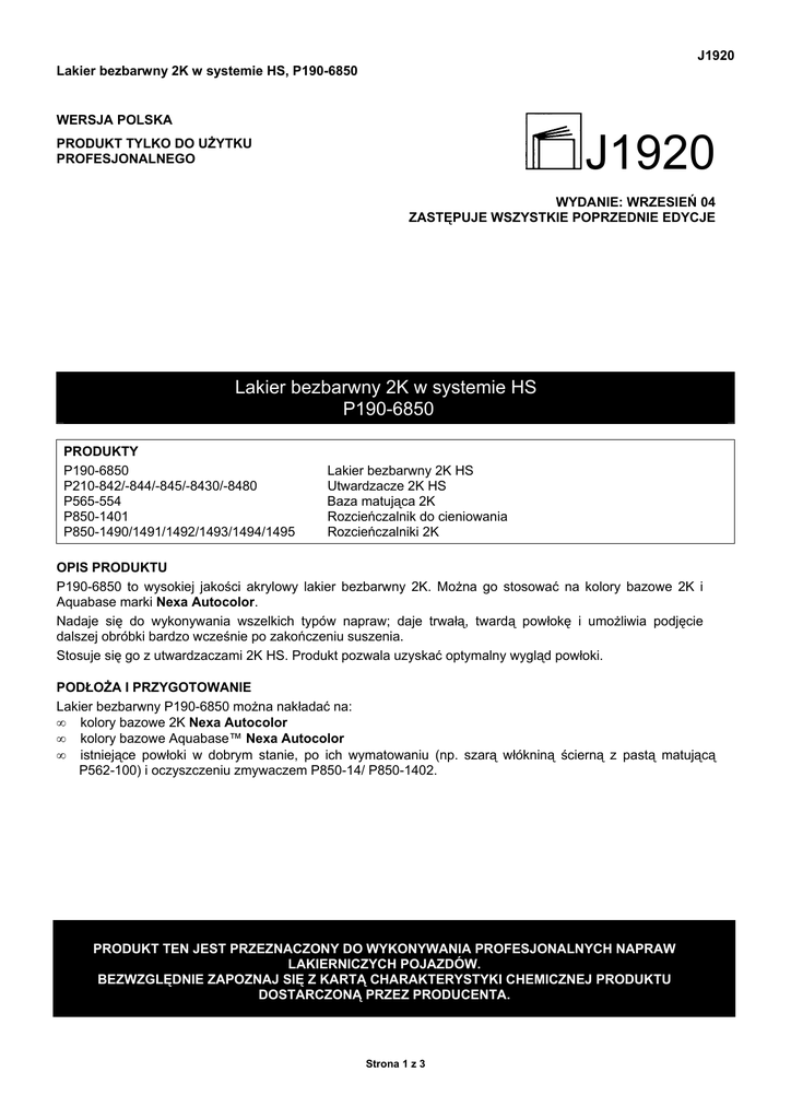 J1920 Lakier bezbarwny 2K w systemie HS, P190-6850 WERSJA POLSKA J1920 PRODUKT TYLKO DO UŻYTKU PROFESJONALNEGO WYDANIE: WRZESIEŃ 04 ZASTĘPUJE WSZYSTKIE POPRZEDNIE EDYCJE Lakier bezbarwny 2K w systemie HS P190-6850 PRODUKTY P190-6850 P210-842/-844/-845/-8430/-8480 P565-554 P850-1401 P850-1490/1491/1492/1493/1494/1495 Lakier bezbarwny 2K HS Utwardzacze 2K HS Baza matująca 2K Rozcieńczalnik do cieniowania Rozcieńczalniki 2K OPIS PRODUKTU P190-6850 to wysokiej jakości akrylowy lakier bezbarwny 2K. Można go stosować na kolory bazowe 2K i Aquabase marki Nexa Autocolor. Nadaje się do wykonywania wszelkich typów napraw; daje trwałą, twardą powłokę i umożliwia podjęcie dalszej obróbki bardzo wcześnie po zakończeniu suszenia. Stosuje się go z utwardzaczami 2K HS. Produkt pozwala uzyskać optymalny wygląd powłoki. PODŁOŻA I PRZYGOTOWANIE Lakier bezbarwny P190-6850 można nakładać na: • kolory bazowe 2K Nexa Autocolor • kolory bazowe Aquabase™ Nexa Autocolor • istniejące powłoki w dobrym stanie, po ich wymatowaniu (np. szarą włókniną ścierną z pastą matującą P562-100) i oczyszczeniu zmywaczem P850-14/ P850-1402. PRODUKT TEN JEST PRZEZNACZONY DO WYKONYWANIA PROFESJONALNYCH NAPRAW LAKIERNICZYCH POJAZDÓW. BEZWZGLĘDNIE ZAPOZNAJ SIĘ Z KARTĄ CHARAKTERYSTYKI CHEMICZNEJ PRODUKTU DOSTARCZONĄ PRZEZ PRODUCENTA. Strona 1 z 3 J1920 Lakier bezbarwny 2K w systemie HS, P190-6850 PROCES Naprawy każdej wielkości Utwardzacze: P210-844/-8430/-8480 Naprawy 1-2 elementów Utwardzacz P210-842 P190-6850 P210-842 P850-x 2 części 1 część* 0-5%* P190-6850 P210-x P850-x 17-18 sekund DIN4 w 20°C (21-24 sekundy BSB4) Żywotność mieszanki w 20°C: 1,5 godziny 2 części 1 część* 0-5%* W wysokich temperaturach Utwardzacz P210-845 P190-6850 P210-845 P850-x 2 części 1 część 0-5%* 17-18 sekund DIN4 w 20°C 18-20 sekund DIN4 w 20°C (21-24 sekundy BSB4) (23-26 sekund BSB4) Żywotność mieszanki w 20°C: Żywotność mieszanki w 20°C: 2 godziny 2 godziny Dysza: Grawitacyjny: 1,2-1,4 mm Ssący: 1,4-1,6 mm Ciśnienie zależnie od zaleceń producenta sprzętu Dysza: Grawitacyjny: 1,2-1,4 mm Ssący: 1,4-1,6 mm Ciśnienie zależnie od zaleceń producenta sprzętu 1 lekka warstwa i1 pełna bez odparowania Odparowanie przed wygrzewaniem nie jest potrzebne. Wygrzewanie w temperaturze obiektu: 60°C 20 minut Dalsze prace po schłodzeniu powłoki Wygrzewanie w temperaturze obiektu: 60°C 30 minut Dalsze prace po schłodzeniu powłoki Wygrzewanie w temperaturze obiektu: 60°C 40 minut Dalsze prace po schłodzeniu powłoki * UWAGA: dobierz rozcieńczalnik zależnie od temperatury otoczenia i zakresu naprawy. Patrz rozdział „Wybór rozcieńczalnika” poniżej. Strona 2 z 3 J1920 Lakier bezbarwny 2K w systemie HS, P190-6850 OGÓLNE UWAGI DOTYCZĄCE PROCESU CIENIOWANIE Patrz: karta techniczna M0300. Wybór utwardzacza System HS P210-842 <25oC P210-844 25-30oC P210-845 >30oC P210-8430 20-25oC Wybór rozcieńczalnika P850-14xx (standard) P850-1490 10-20oC P850-1491 15-25oC P850-1492 20-30oC P850-1493 25-35oC P850-1494 30-40oC P850-1495 35-45oC PONOWNA APLIKACJA Lakier bezbarwny P190-6850 może być ponownie aplikowany zaraz po schłodzeniu powłoki. REDUKCJA POZIOMU POŁYSKU Poziom połysku lakieru bezbarwnego P190-6850 można zmniejszyć, dodając bazę matującą P565-554 2K w proporcjach podanych w narzędziach kolorystycznych. Alternatywnie stosuj poniższe wytyczne: Poziom połysku P190-6850 P565-554 Półpołysk 2 części 1,5 części Satyna 1 część 1 część Mat 2 części 3 części Do takiej mieszanki dodaj utwardzacz i rozcieńczalnik w zwykłej proporcji. POLEROWANIE I USUWANIE WTRĄCEŃ Polerowanie zazwyczaj nie jest potrzebne, jako że lakier bezbarwny P190-6850 ma doskonały połysk. Jeżeli pojawiły się wtrącenia brudu, usuń je na mokro papierem P1500 lub drobniejszym, a potem wypoleruj stosując pastę polerską P562-64. Następnie zastosuj P971-9 dla uzyskania optymalnego wyglądu. Polerowanie powłok 2K jest najłatwiejsze od 1 do 24 godzin po ostygnięciu powłoki. LAKIEROWANIE TWORZYW SZTUCZNYCH Patrz: karta techniczna L1200. INNE UWAGI • Najlepsze wyniki lakierowania otrzymasz pracując w temperaturze pokojowej. Temperatura produktu i temperatura otoczenia powinny być sobie równe. • Przy pracy z produktami 2K konieczne jest mycie pistoletów i narzędzi bezpośrednio po użyciu. Te informacje podano w dobrej wierze, ale bez gwarancji. W celu otrzymania bardziej szczegółowych informacji prosimy o kontakt: PPG Industries Poland Sp. z o. o. (Oddział w Warszawie) ul. Bodycha 47 05-816 Warszawa-Michałowice Polska Telefon: (+48 22) 753 03 10 Faks: (+48 22) 753 03 13 http://www. nexaautocolor.com Strona 3 z 3