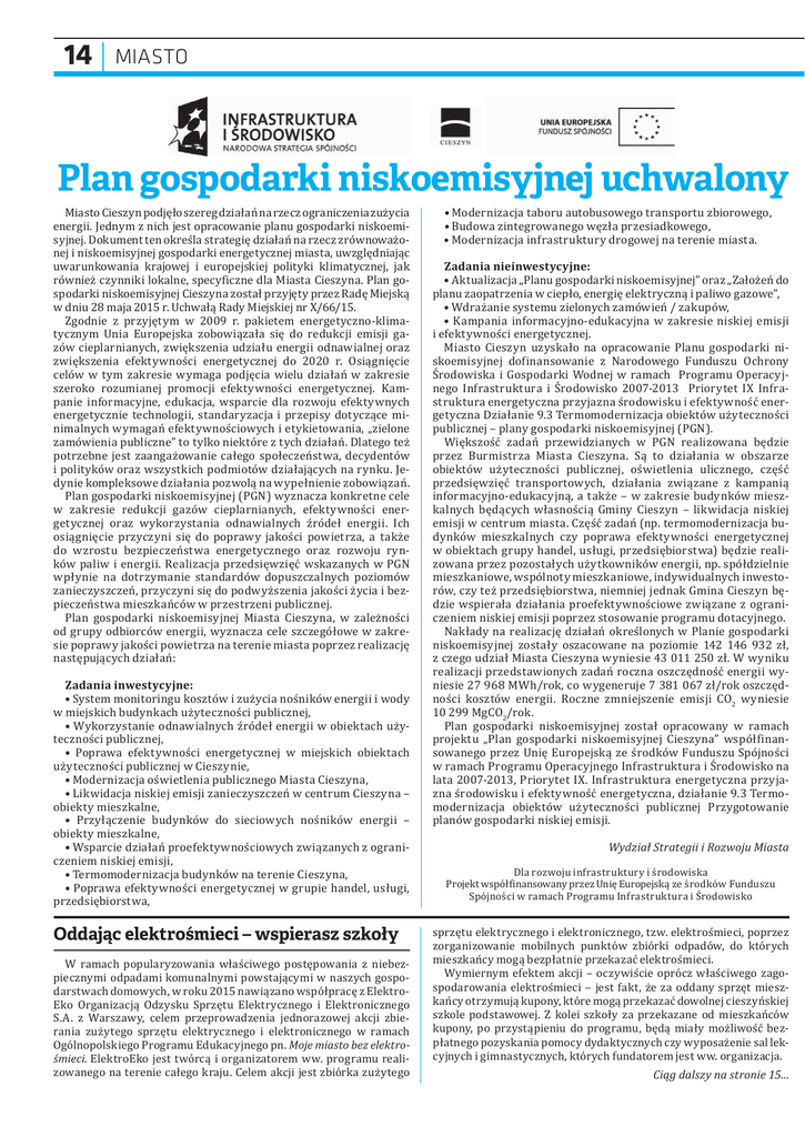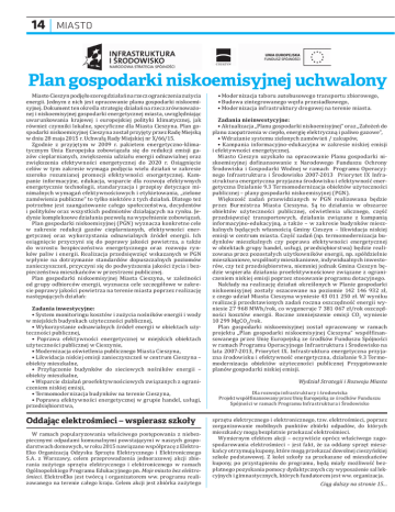 14 Miasto Plan gospodarki niskoemisyjnej uchwalony Miasto Cieszyn podjęło szereg działań na rzecz ograniczenia zużycia energii. Jednym z nich jest opracowanie planu gospodarki niskoemisyjnej. Dokument ten określa strategię działań na rzecz zrównoważonej i niskoemisyjnej gospodarki energetycznej miasta, uwzględniając uwarunkowania krajowej i europejskiej polityki klimatycznej, jak również czynniki lokalne, specyficzne dla Miasta Cieszyna. Plan gospodarki niskoemisyjnej Cieszyna został przyjęty przez Radę Miejską w dniu 28 maja 2015 r. Uchwałą Rady Miejskiej nr X/66/15. Zgodnie z przyjętym w 2009 r. pakietem energetyczno-klimatycznym Unia Europejska zobowiązała się do redukcji emisji gazów cieplarnianych, zwiększenia udziału energii odnawialnej oraz zwiększenia efektywności energetycznej do 2020 r. Osiągnięcie celów w tym zakresie wymaga podjęcia wielu działań w zakresie szeroko rozumianej promocji efektywności energetycznej. Kampanie informacyjne, edukacja, wsparcie dla rozwoju efektywnych energetycznie technologii, standaryzacja i przepisy dotyczące minimalnych wymagań efektywnościowych i etykietowania, „zielone zamówienia publiczne” to tylko niektóre z tych działań. Dlatego też potrzebne jest zaangażowanie całego społeczeństwa, decydentów i polityków oraz wszystkich podmiotów działających na rynku. Jedynie kompleksowe działania pozwolą na wypełnienie zobowiązań. Plan gospodarki niskoemisyjnej (PGN) wyznacza konkretne cele w zakresie redukcji gazów cieplarnianych, efektywności energetycznej oraz wykorzystania odnawialnych źródeł energii. Ich osiągnięcie przyczyni się do poprawy jakości powietrza, a także do wzrostu bezpieczeństwa energetycznego oraz rozwoju rynków paliw i energii. Realizacja przedsięwzięć wskazanych w PGN wpłynie na dotrzymanie standardów dopuszczalnych poziomów zanieczyszczeń, przyczyni się do podwyższenia jakości życia i bezpieczeństwa mieszkańców w przestrzeni publicznej. Plan gospodarki niskoemisyjnej Miasta Cieszyna, w zależności od grupy odbiorców energii, wyznacza cele szczegółowe w zakresie poprawy jakości powietrza na terenie miasta poprzez realizację następujących działań: Zadania inwestycyjne: • System monitoringu kosztów i zużycia nośników energii i wody w miejskich budynkach użyteczności publicznej, • Wykorzystanie odnawialnych źródeł energii w obiektach użyteczności publicznej, • Poprawa efektywności energetycznej w miejskich obiektach użyteczności publicznej w Cieszynie, • Modernizacja oświetlenia publicznego Miasta Cieszyna, • Likwidacja niskiej emisji zanieczyszczeń w centrum Cieszyna – obiekty mieszkalne, • Przyłączenie budynków do sieciowych nośników energii – obiekty mieszkalne, • Wsparcie działań proefektywnościowych związanych z ograniczeniem niskiej emisji, • Termomodernizacja budynków na terenie Cieszyna, • Poprawa efektywności energetycznej w grupie handel, usługi, przedsiębiorstwa, Oddając elektrośmieci – wspierasz szkoły W ramach popularyzowania właściwego postępowania z niebezpiecznymi odpadami komunalnymi powstającymi w naszych gospodarstwach domowych, w roku 2015 nawiązano współpracę z ElektroEko Organizacją Odzysku Sprzętu Elektrycznego i Elektronicznego S.A. z Warszawy, celem przeprowadzenia jednorazowej akcji zbierania zużytego sprzętu elektrycznego i elektronicznego w ramach Ogólnopolskiego Programu Edukacyjnego pn. Moje miasto bez elektrośmieci. ElektroEko jest twórcą i organizatorem ww. programu realizowanego na terenie całego kraju. Celem akcji jest zbiórka zużytego • Modernizacja taboru autobusowego transportu zbiorowego, • Budowa zintegrowanego węzła przesiadkowego, • Modernizacja infrastruktury drogowej na terenie miasta. Zadania nieinwestycyjne: • Aktualizacja „Planu gospodarki niskoemisyjnej” oraz „Założeń do planu zaopatrzenia w ciepło, energię elektryczną i paliwo gazowe”, • Wdrażanie systemu zielonych zamówień / zakupów, • Kampania informacyjno-edukacyjna w zakresie niskiej emisji i efektywności energetycznej. Miasto Cieszyn uzyskało na opracowanie Planu gospodarki niskoemisyjnej dofinansowanie z Narodowego Funduszu Ochrony Środowiska i Gospodarki Wodnej w ramach Programu Operacyjnego Infrastruktura i Środowisko 2007-2013 Priorytet IX Infrastruktura energetyczna przyjazna środowisku i efektywność energetyczna Działanie 9.3 Termomodernizacja obiektów użyteczności publicznej – plany gospodarki niskoemisyjnej (PGN). Większość zadań przewidzianych w PGN realizowana będzie przez Burmistrza Miasta Cieszyna. Są to działania w obszarze obiektów użyteczności publicznej, oświetlenia ulicznego, część przedsięwzięć transportowych, działania związane z kampanią informacyjno-edukacyjną, a także – w zakresie budynków mieszkalnych będących własnością Gminy Cieszyn – likwidacja niskiej emisji w centrum miasta. Część zadań (np. termomodernizacja budynków mieszkalnych czy poprawa efektywności energetycznej w obiektach grupy handel, usługi, przedsiębiorstwa) będzie realizowana przez pozostałych użytkowników energii, np. spółdzielnie mieszkaniowe, wspólnoty mieszkaniowe, indywidualnych inwestorów, czy też przedsiębiorstwa, niemniej jednak Gmina Cieszyn będzie wspierała działania proefektywnościowe związane z ograniczeniem niskiej emisji poprzez stosowanie programu dotacyjnego. Nakłady na realizację działań określonych w Planie gospodarki niskoemisyjnej zostały oszacowane na poziomie 142 146 932 zł, z czego udział Miasta Cieszyna wyniesie 43 011 250 zł. W wyniku realizacji przedstawionych zadań roczna oszczędność energii wyniesie 27 968 MWh/rok, co wygeneruje 7 381 067 zł/rok oszczędności kosztów energii. Roczne zmniejszenie emisji CO2 wyniesie 10 299 MgCO2/rok. Plan gospodarki niskoemisyjnej został opracowany w ramach projektu „Plan gospodarki niskoemisyjnej